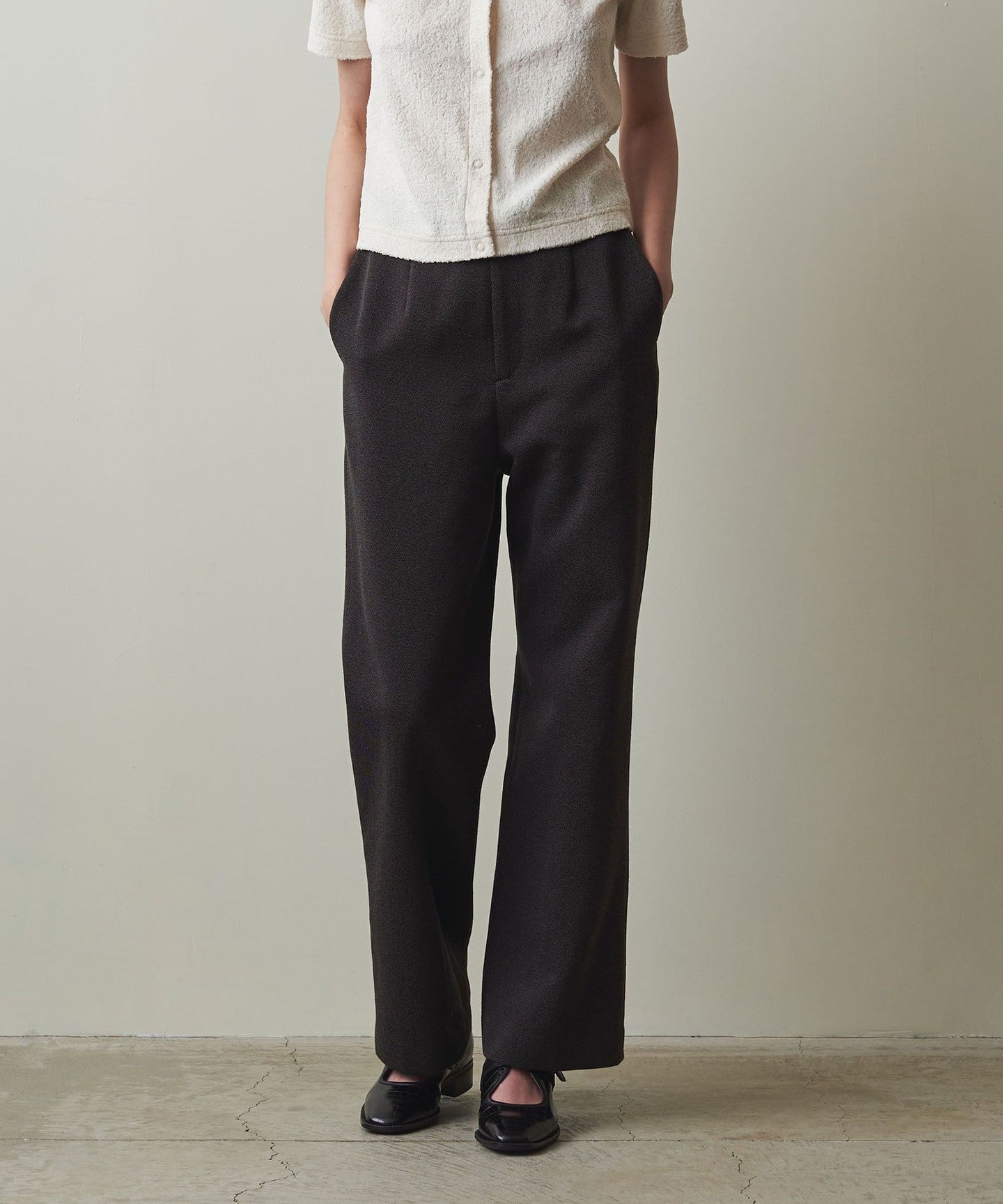 These pants have a semi-flared silhouette and are made from a material that features deep colors and a textured surface.