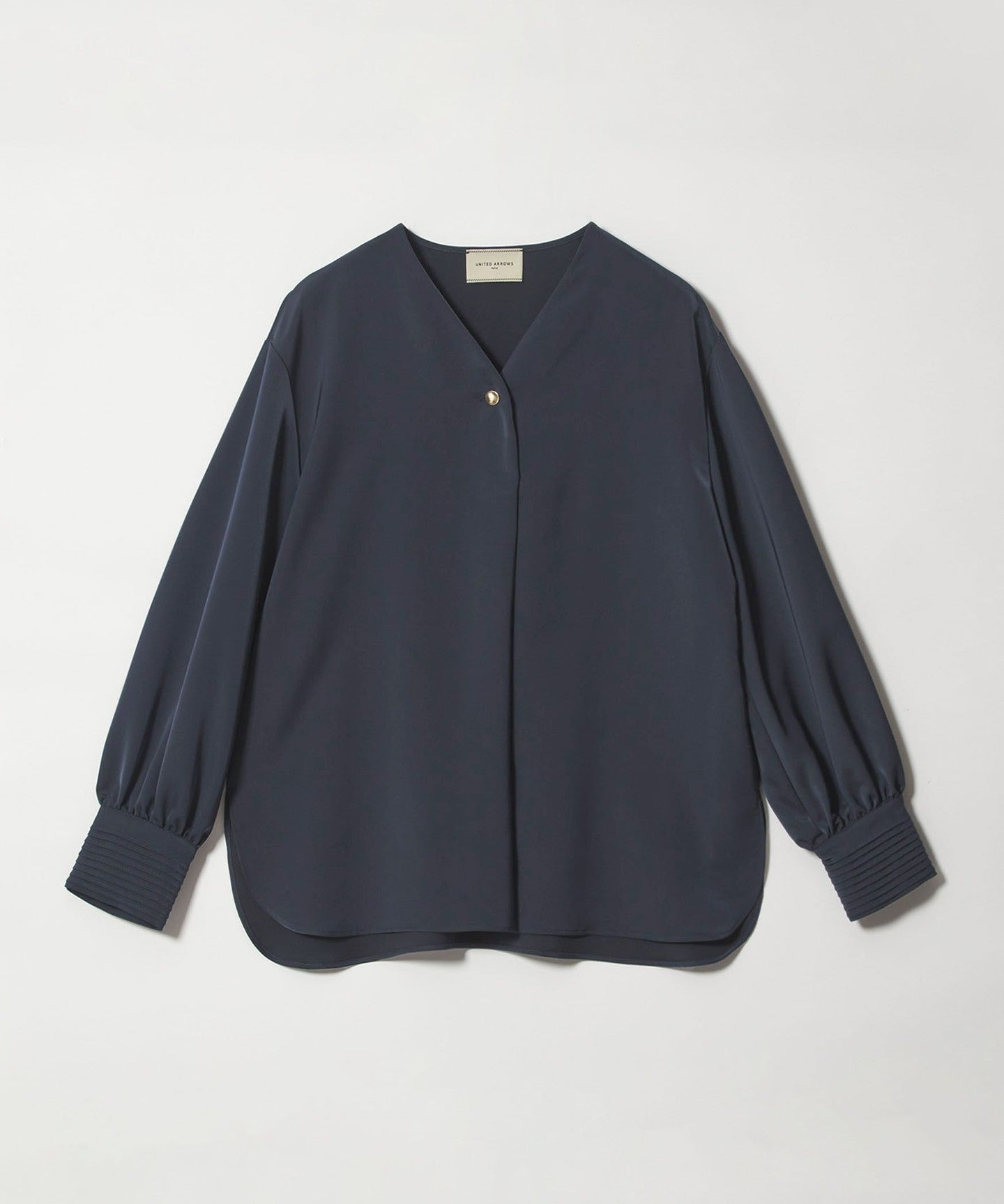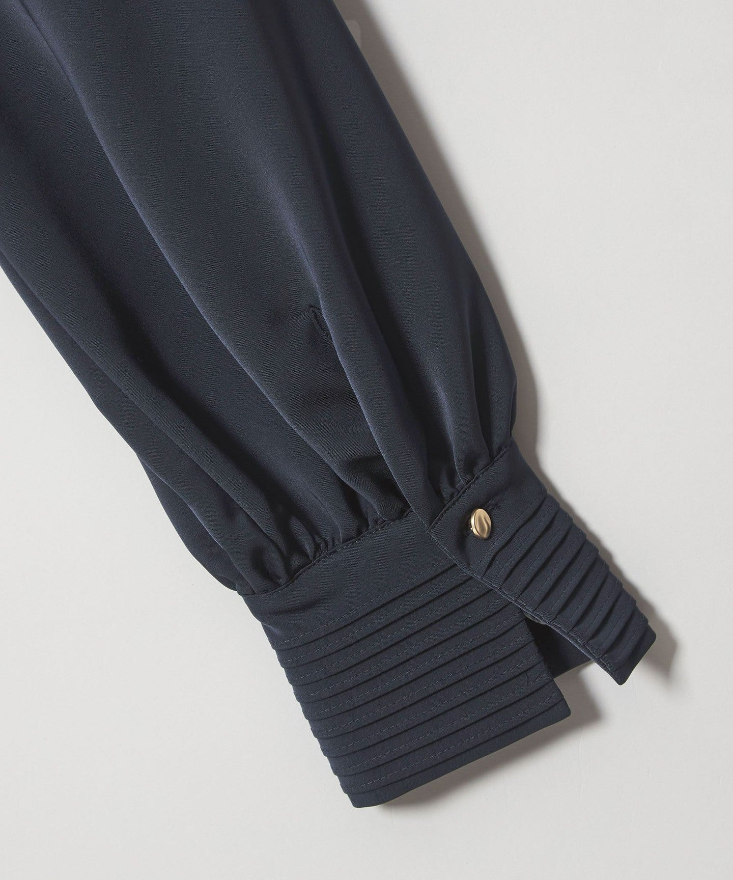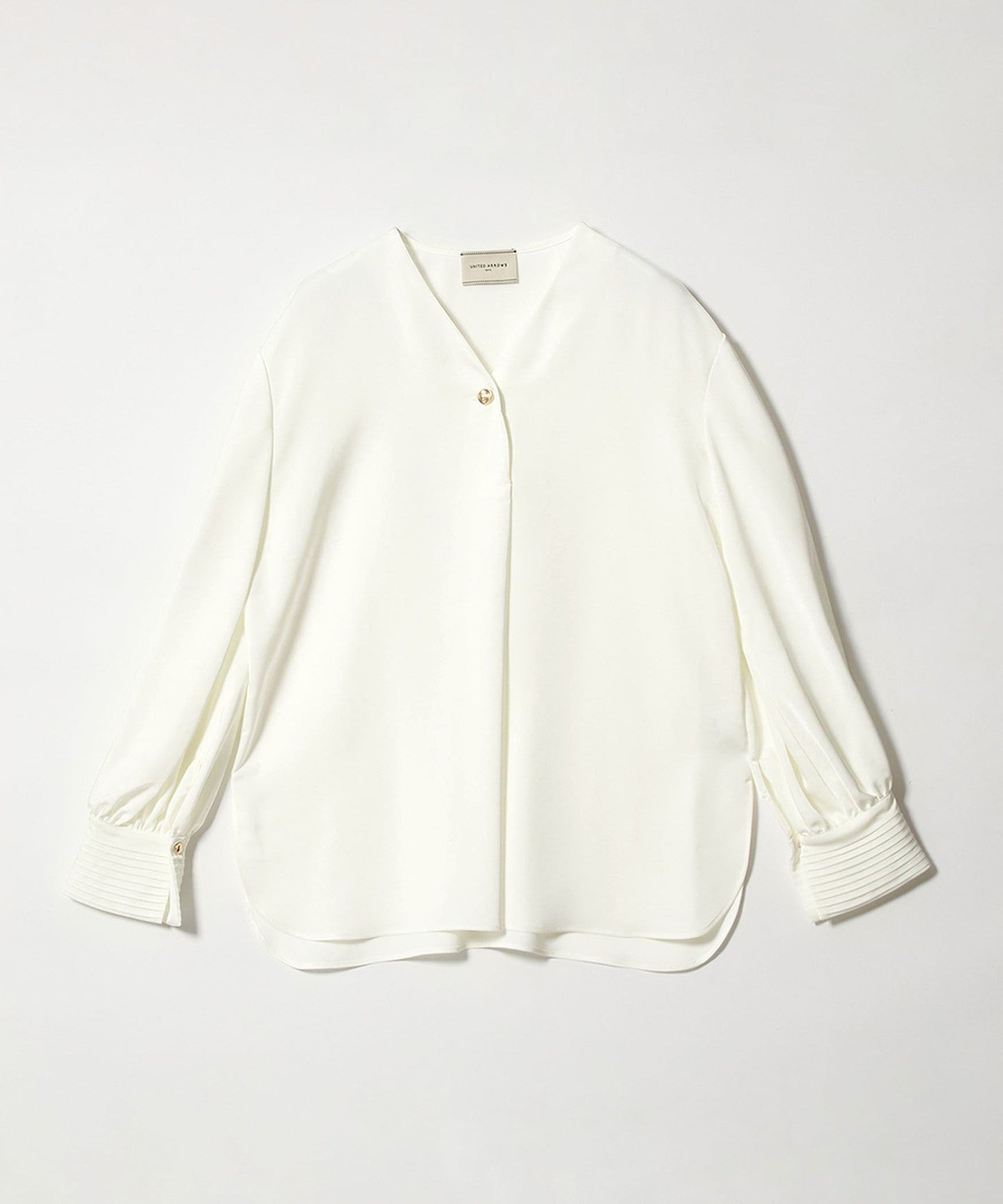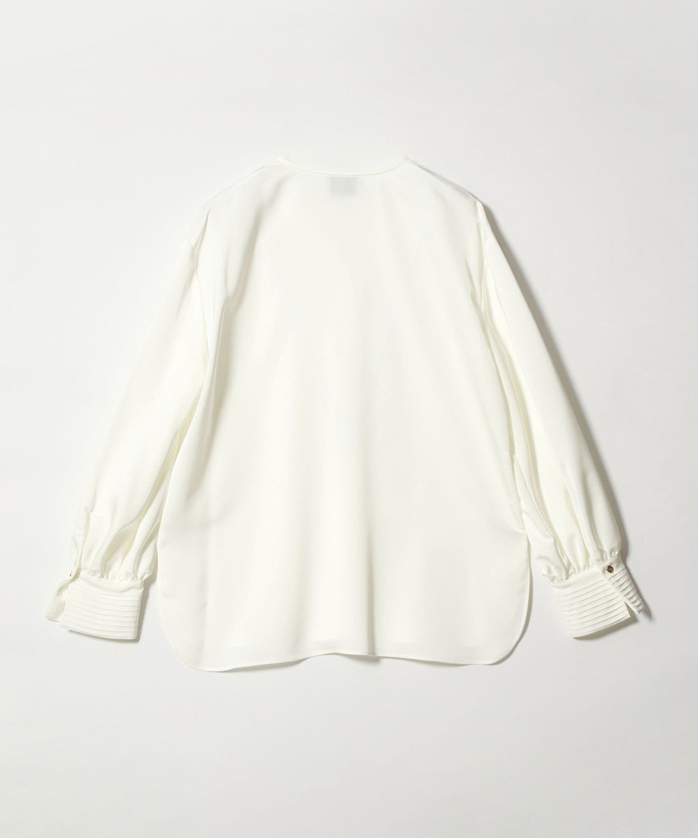 首元の緩やかなカーブラインと、袖口のピンタックカフスがミニマルながら洗練された印象のブラウス。