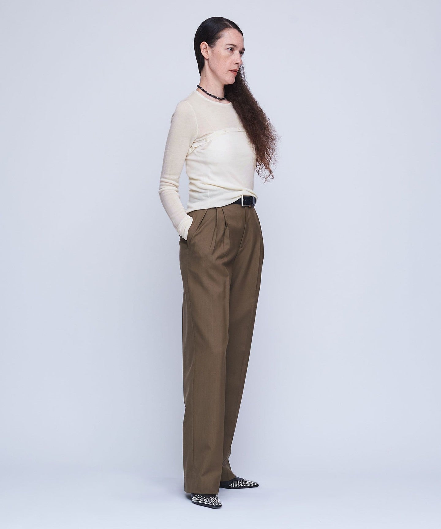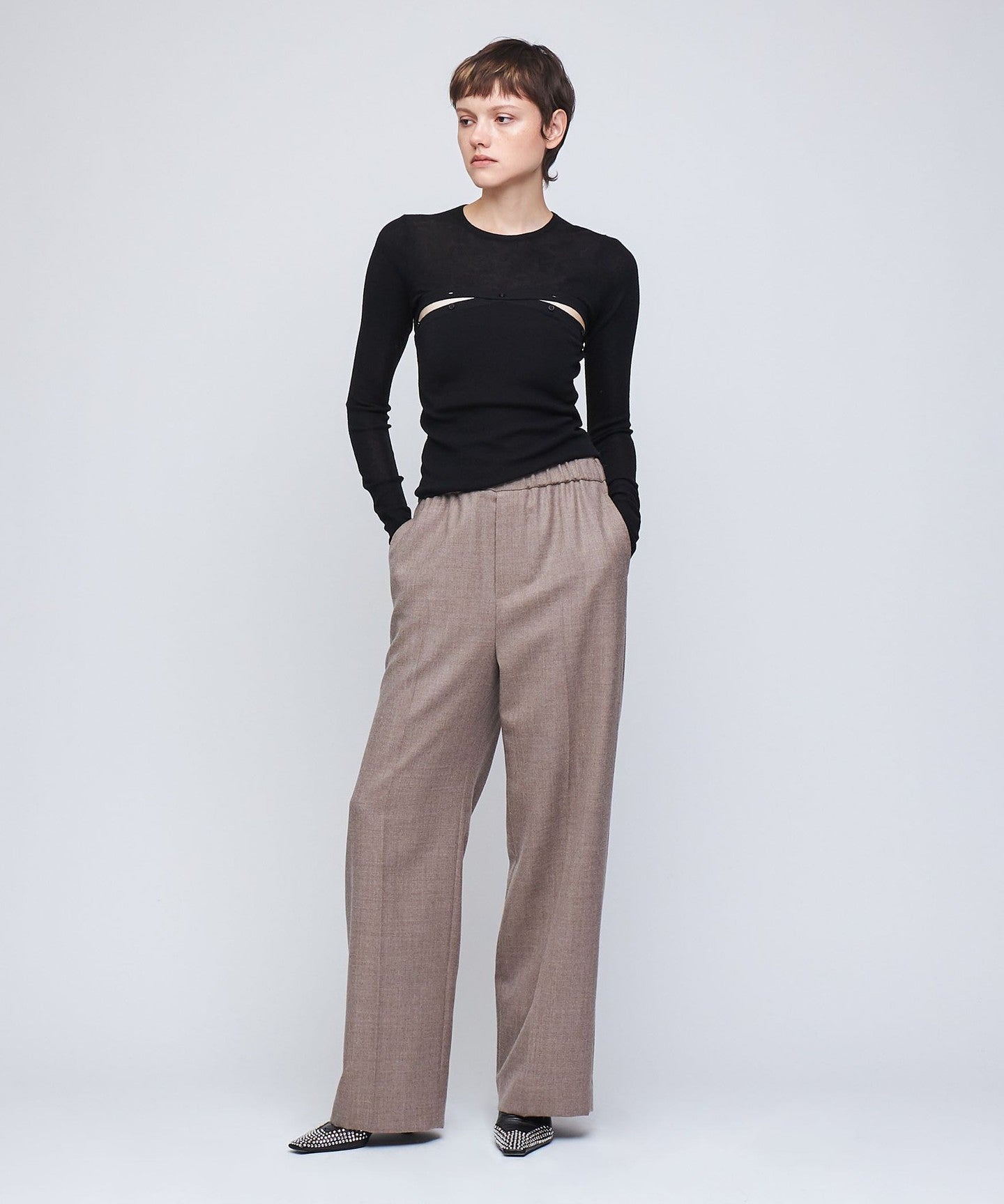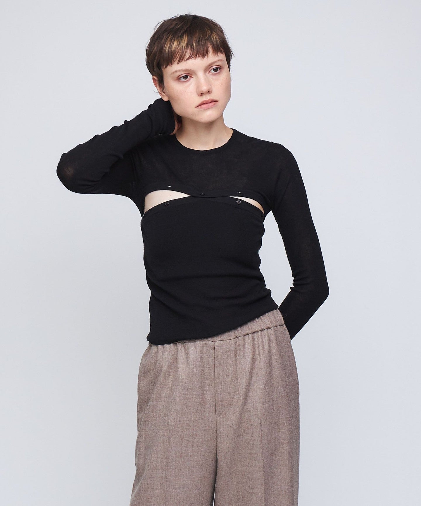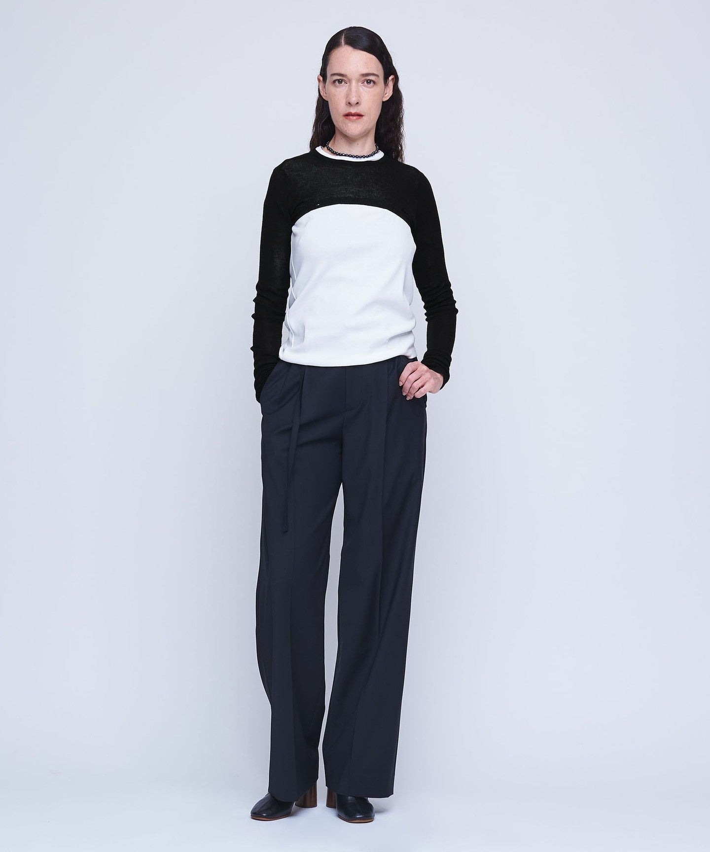 This knit top has a comfortable fit, so we recommend pairing it with wide pants or pants with a cocoon silhouette.