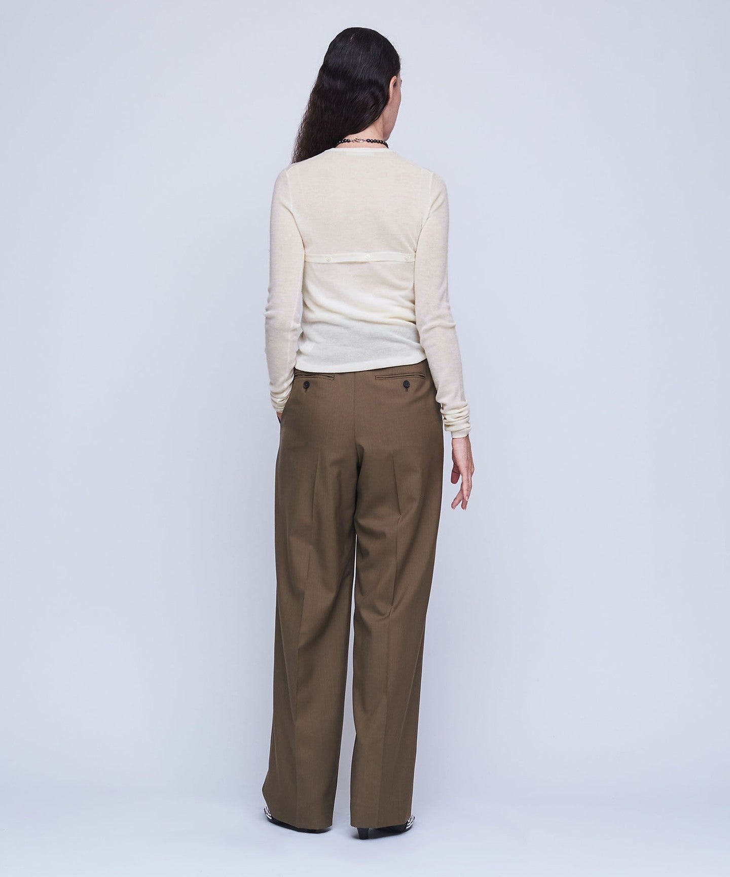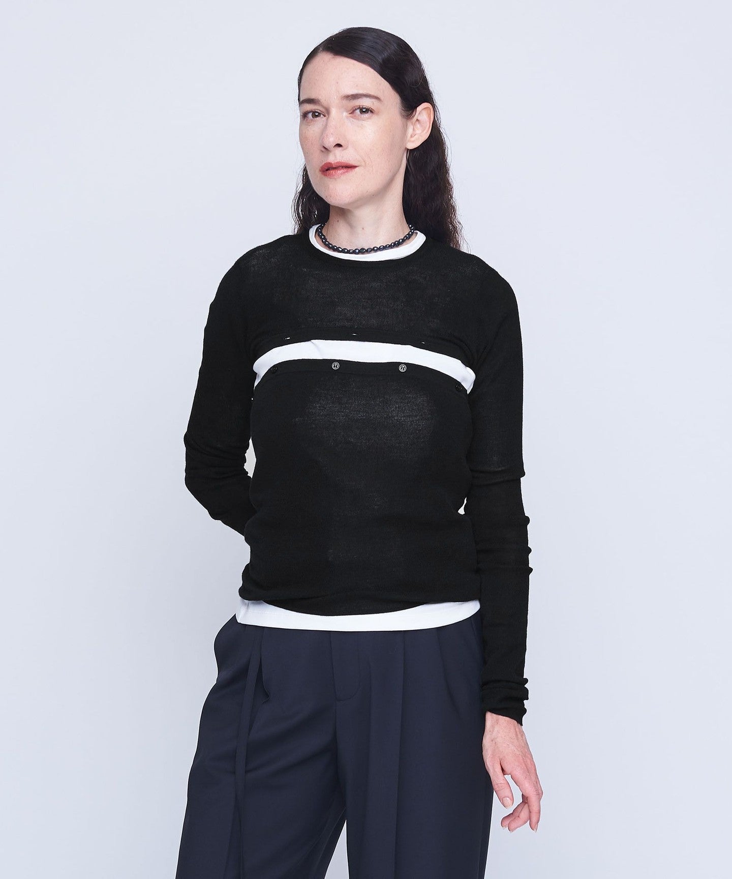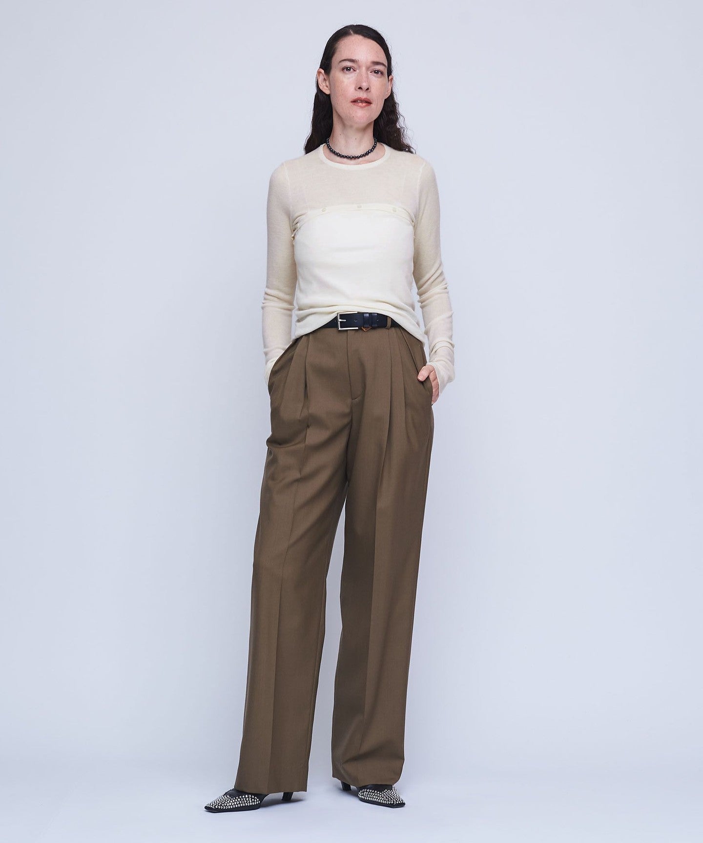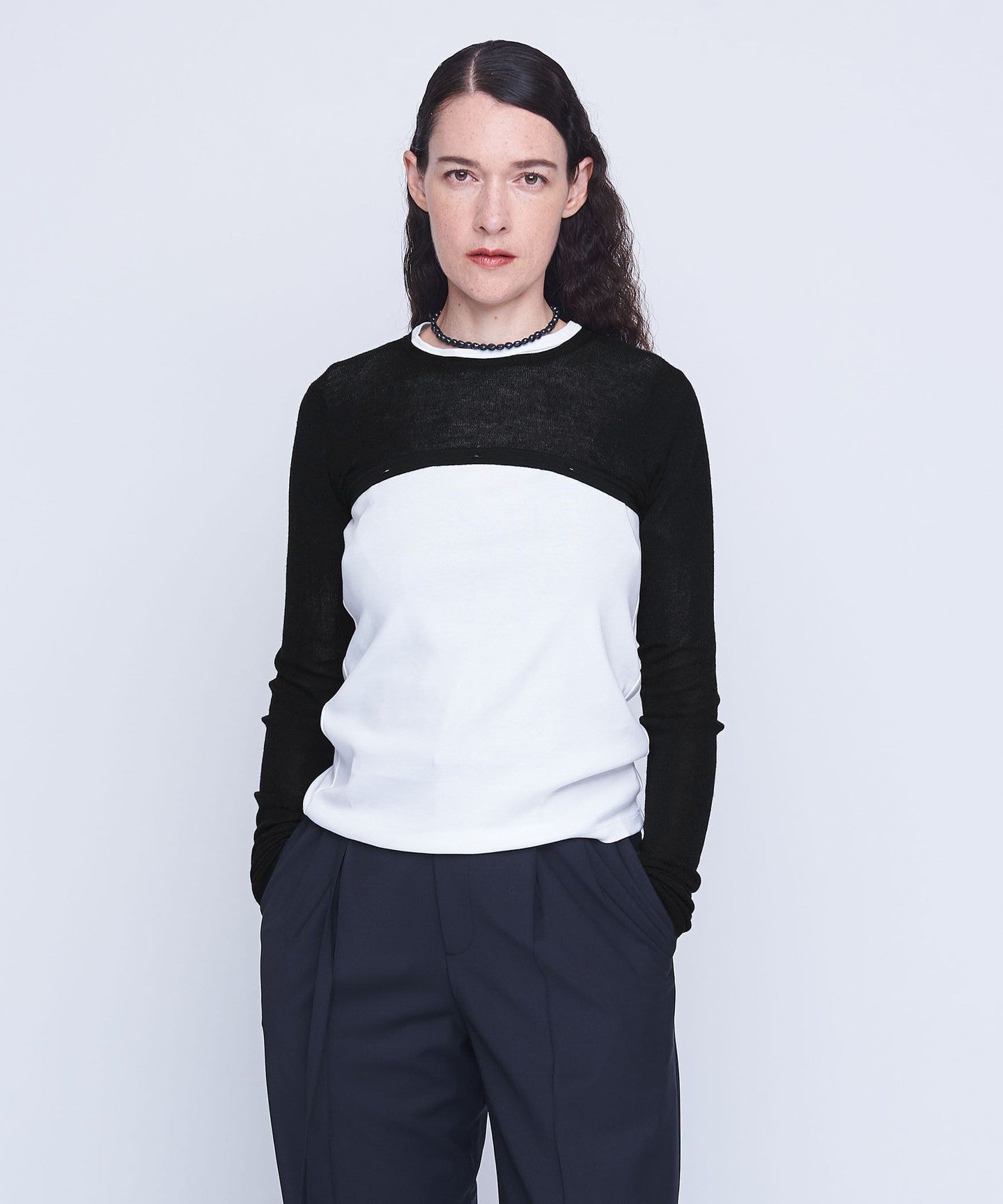 This knit top has a comfortable fit, so we recommend pairing it with wide pants or pants with a cocoon silhouette.