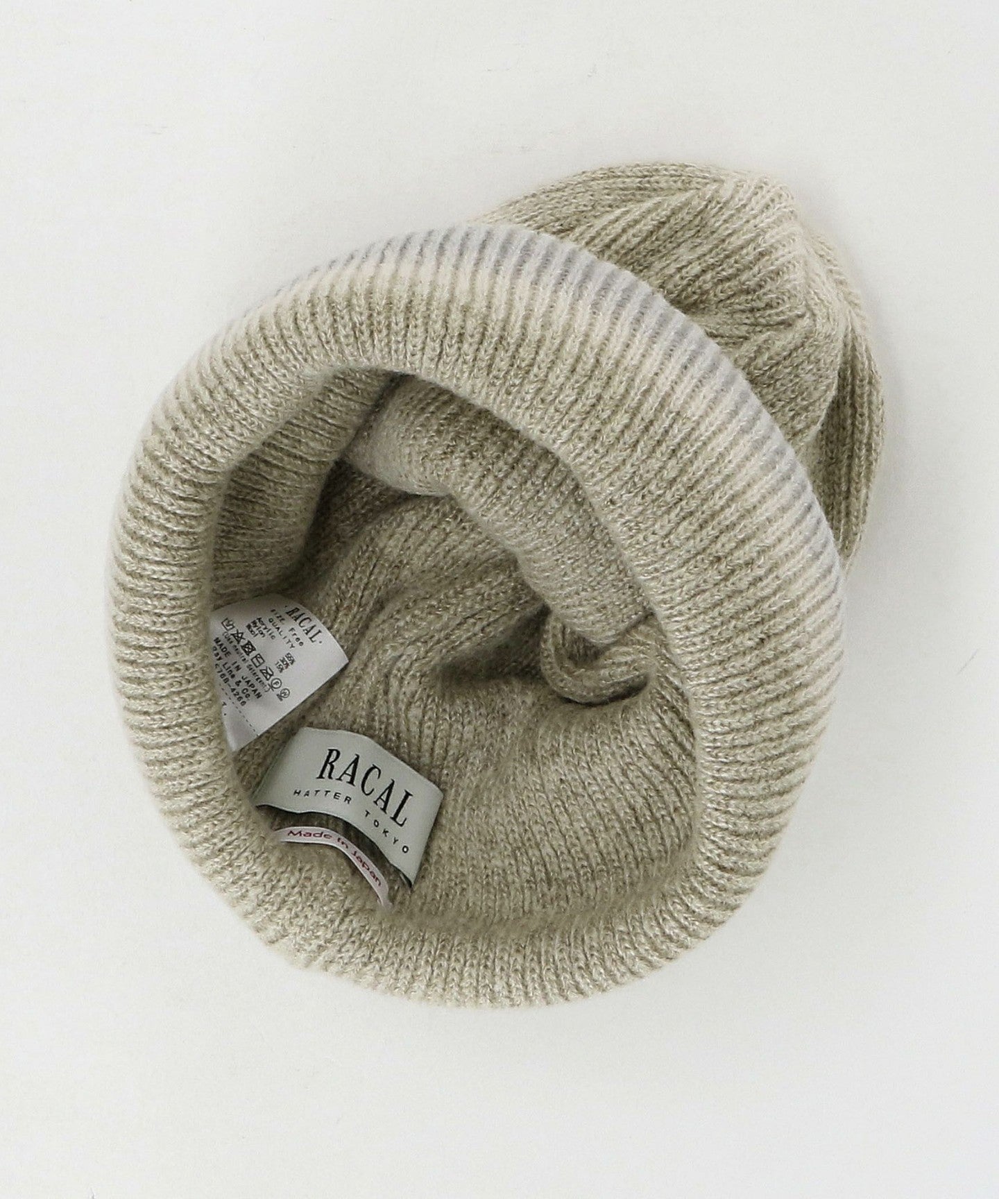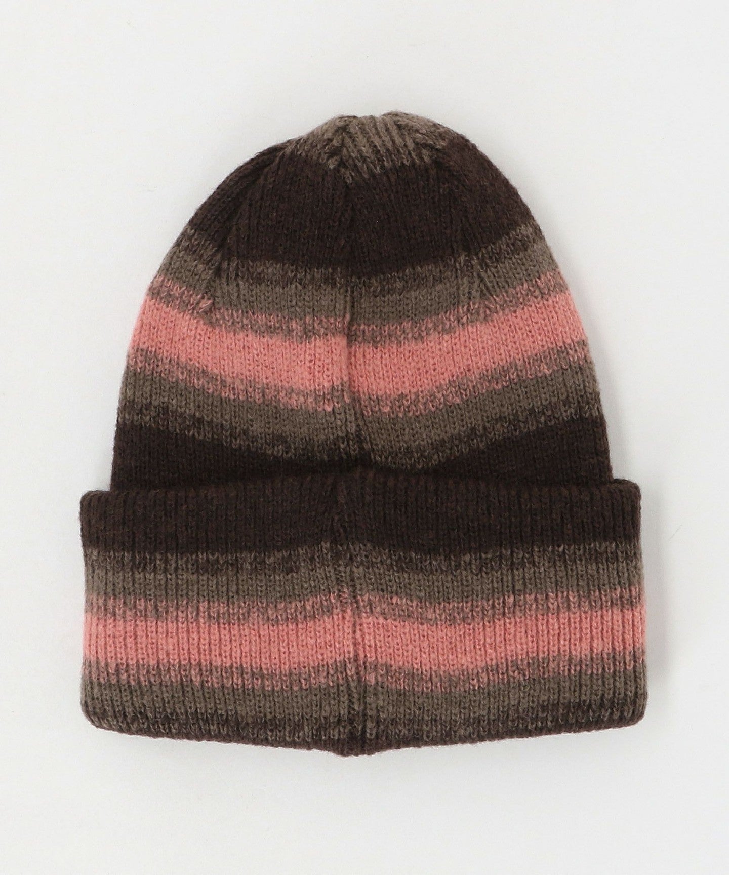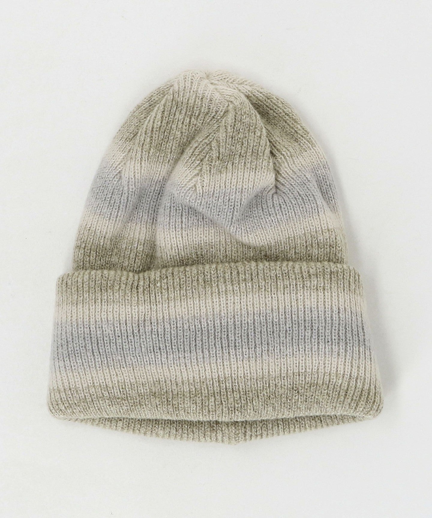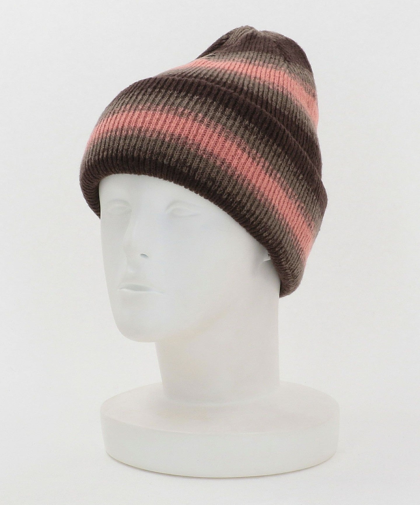 An ombre striped knit cap made from fluffy wool blend yarn.