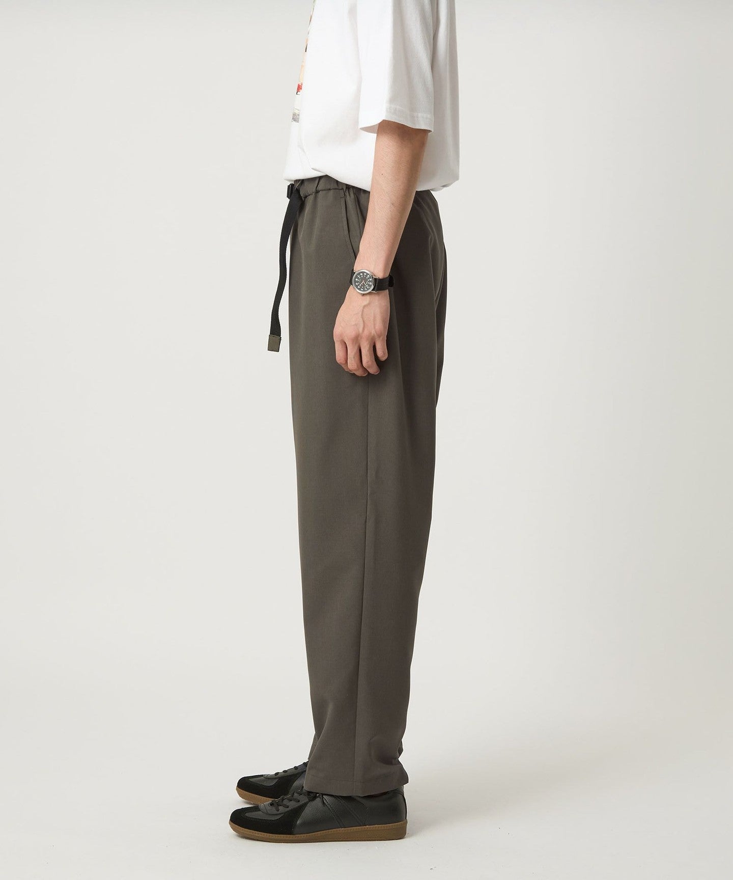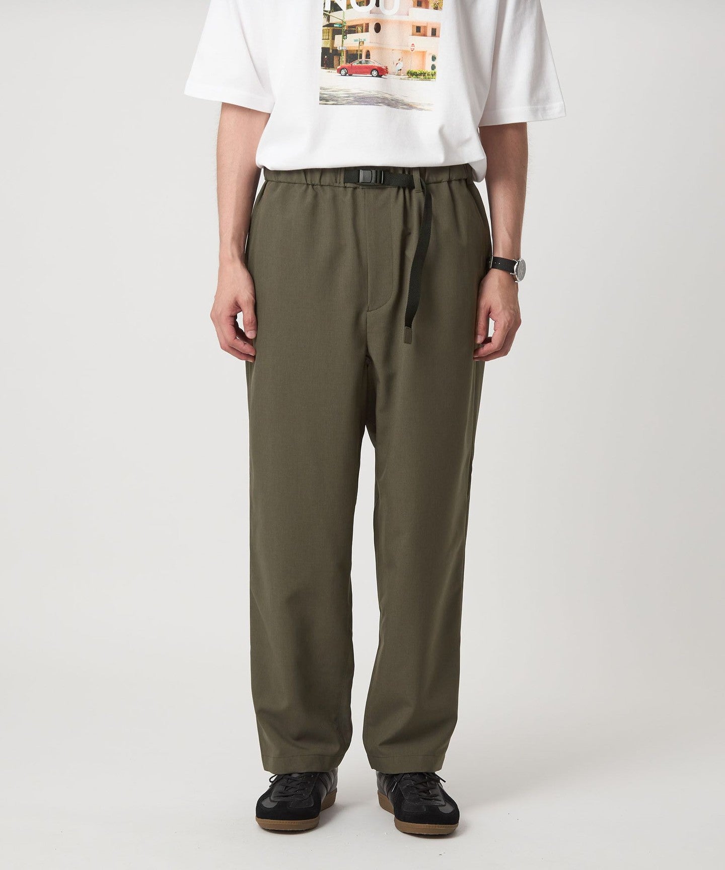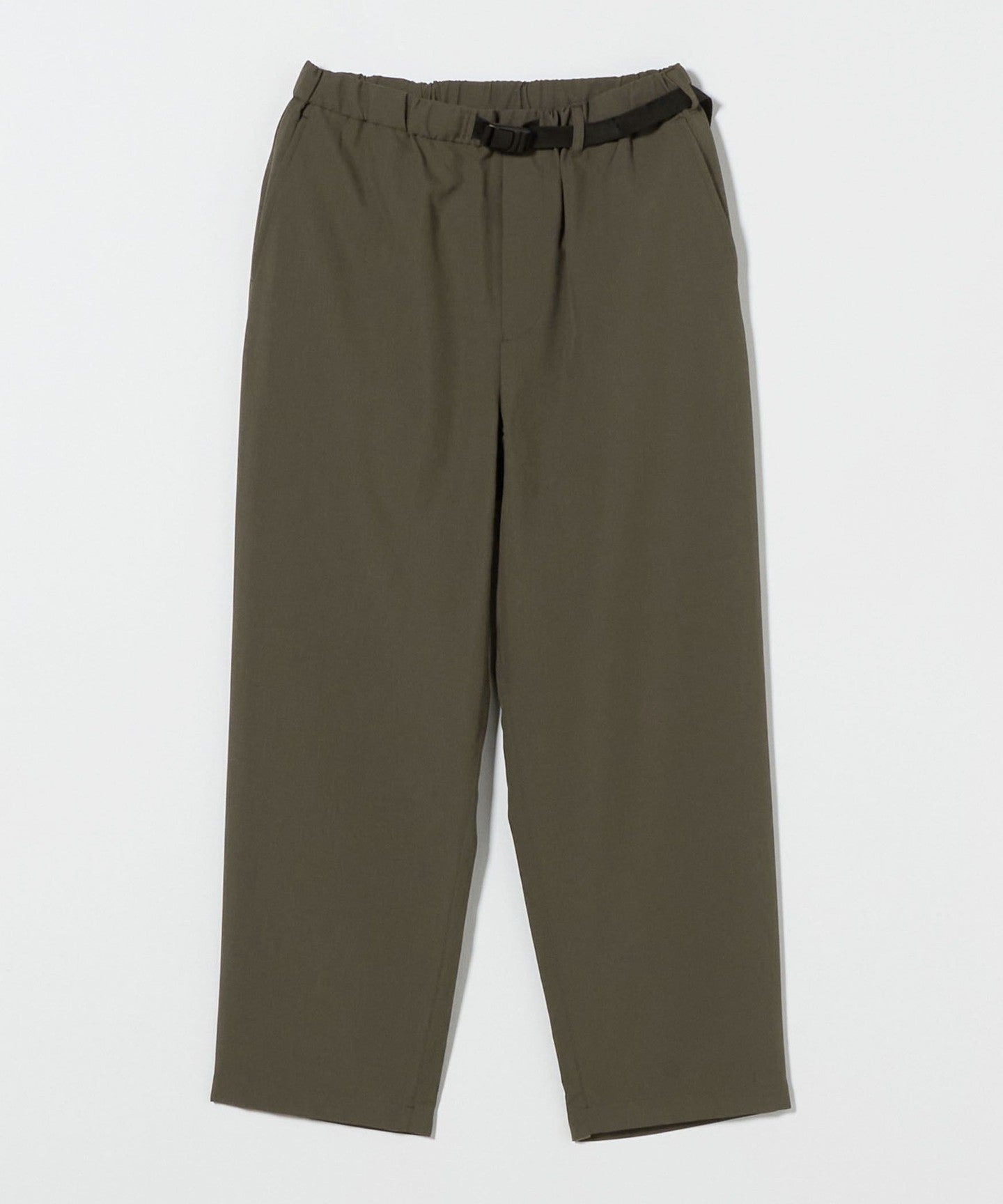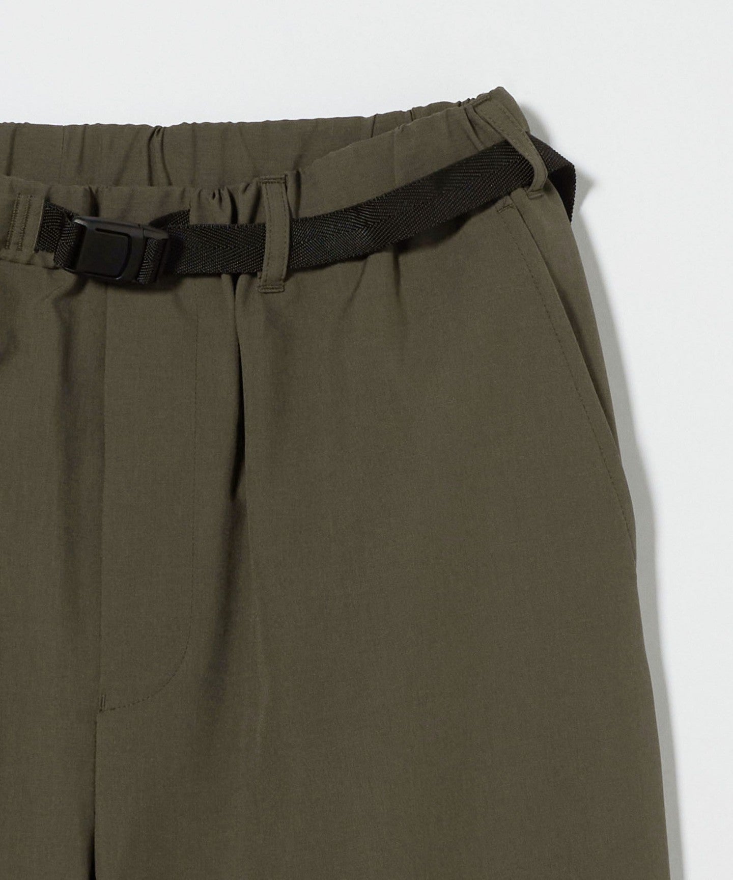 It has a slightly loose, wide tapered silhouette and the size can be adjusted using the quick belt at the waist.