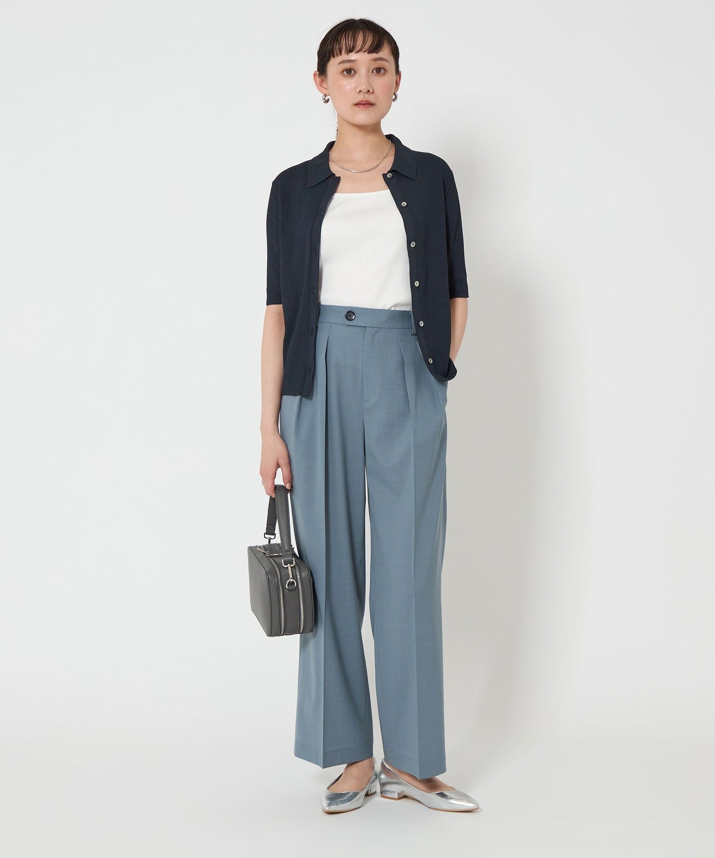 We recommend pairing it with voluminous bottoms such as wide pants or flared skirts.