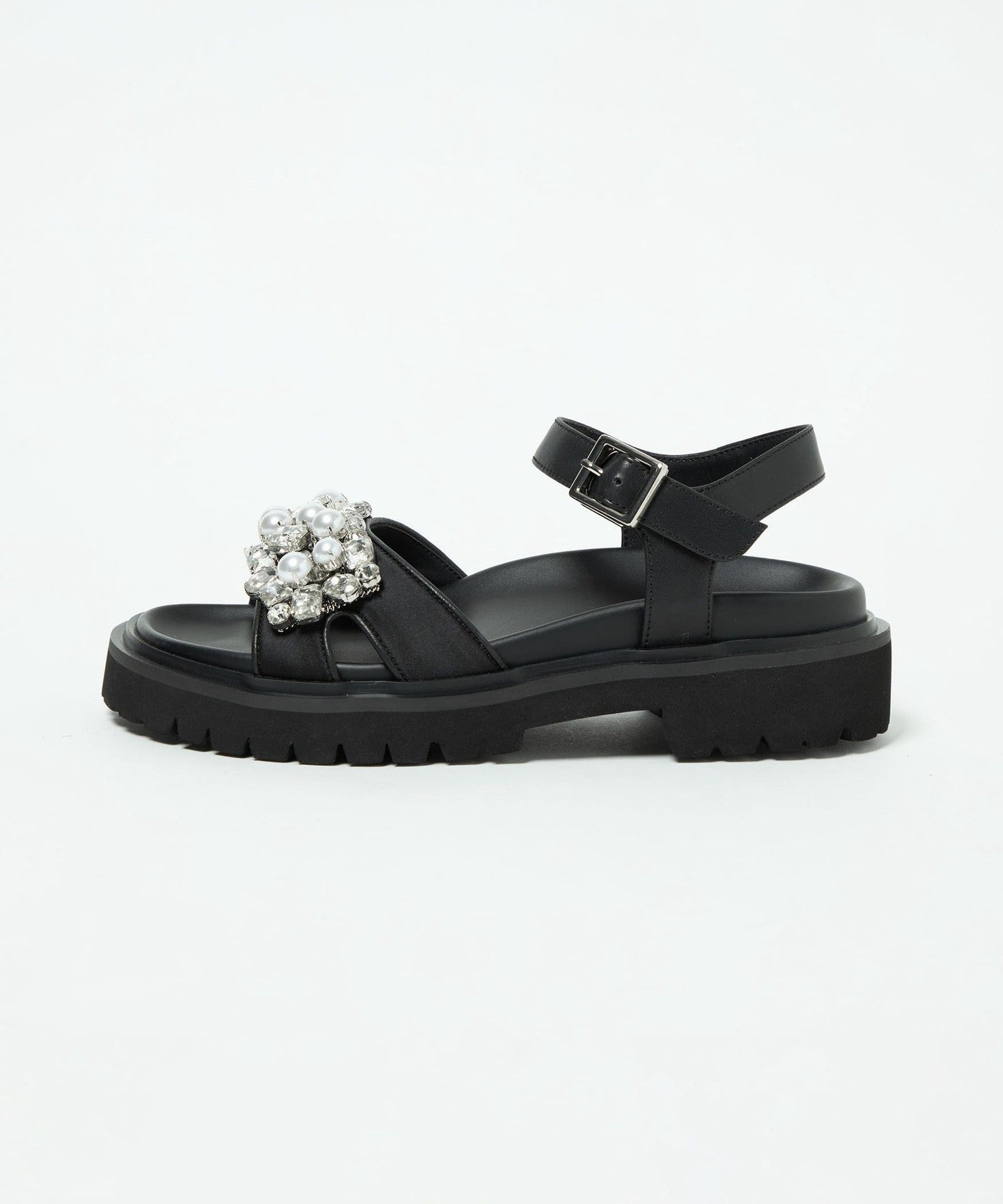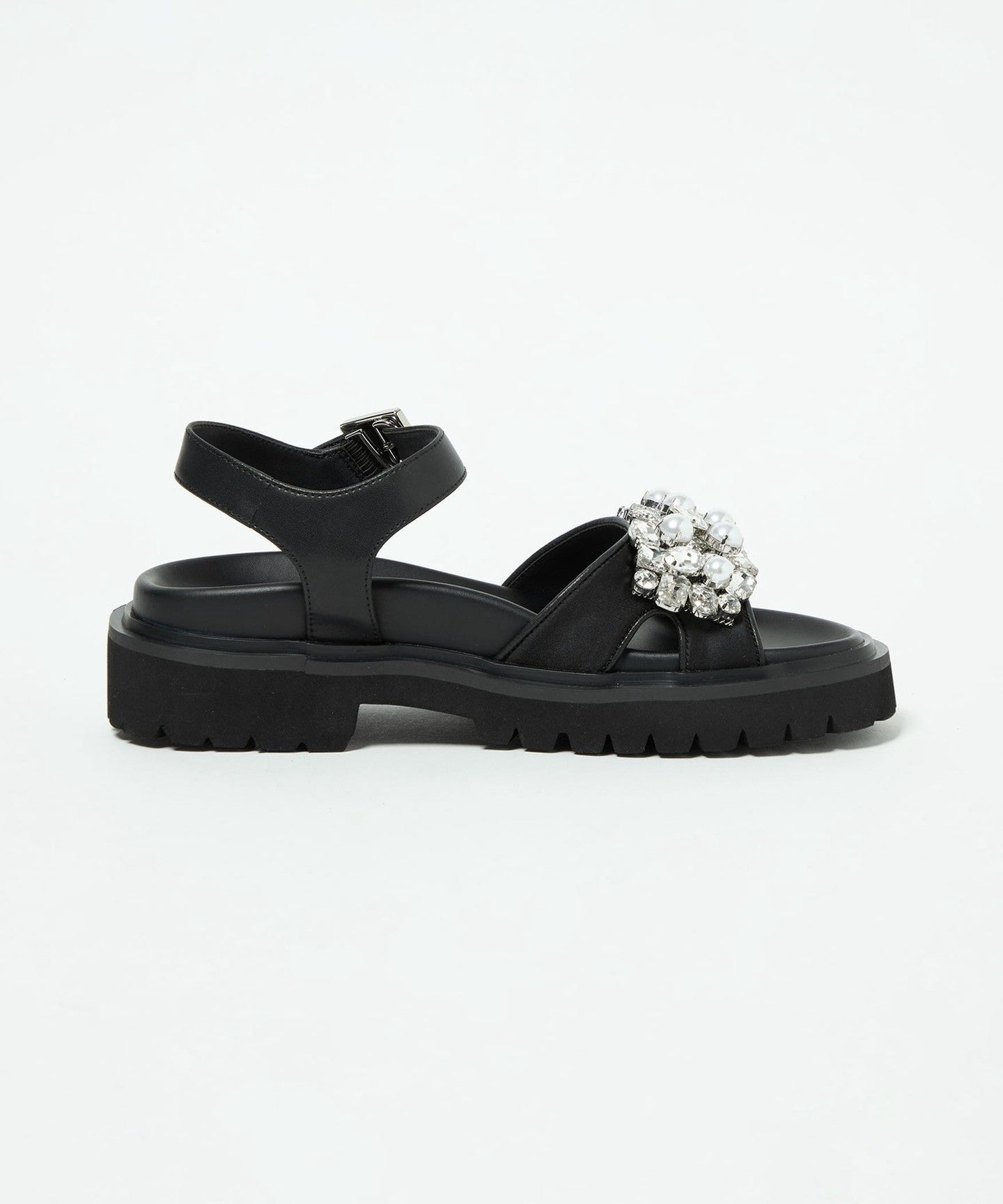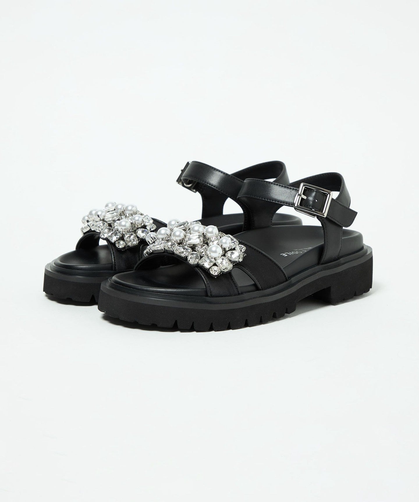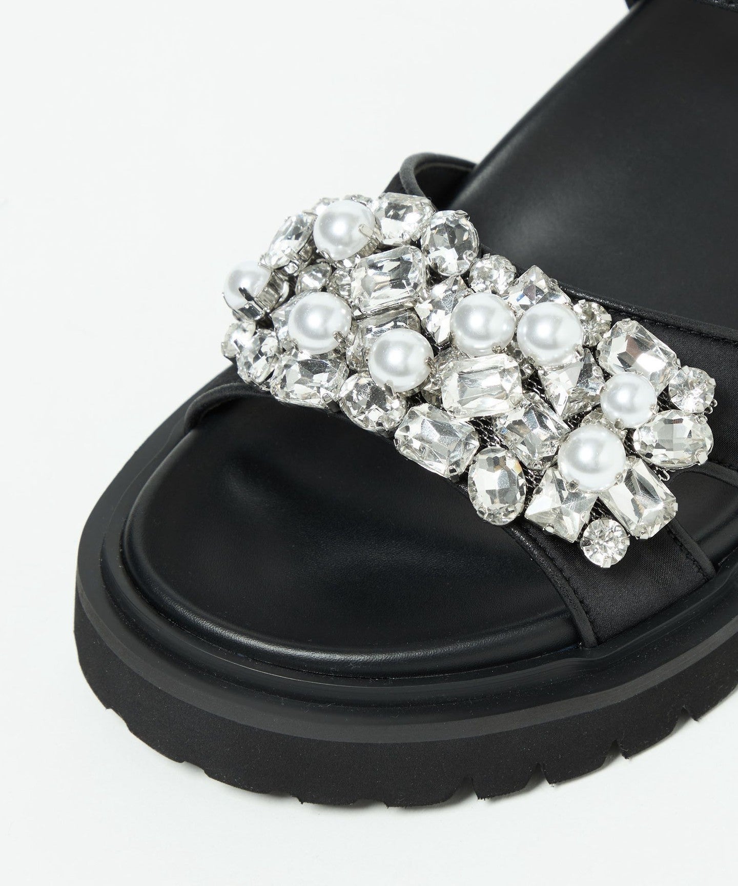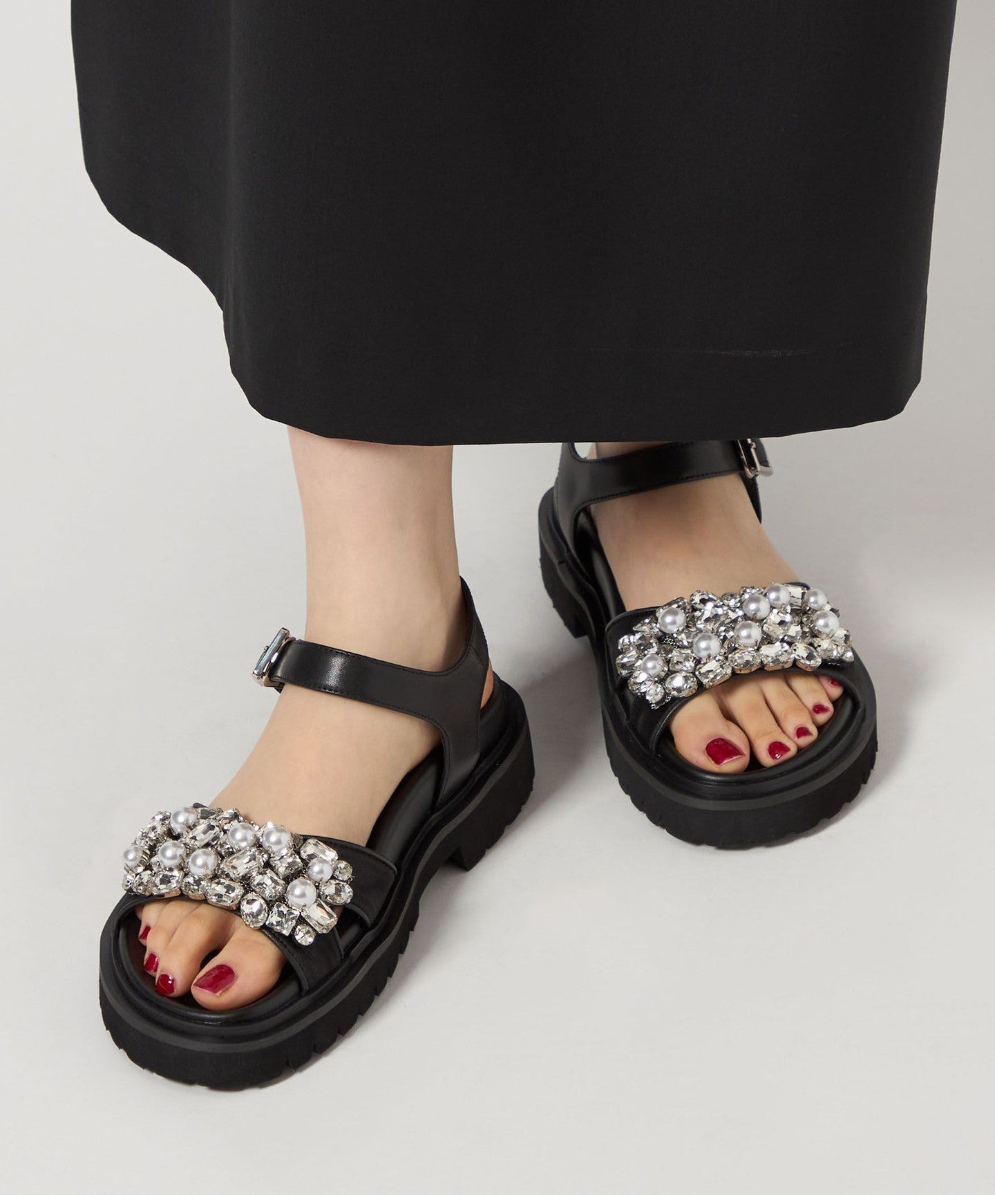 These footbed sandals feature eye-catching ornaments that combine jewels and fake pearls.