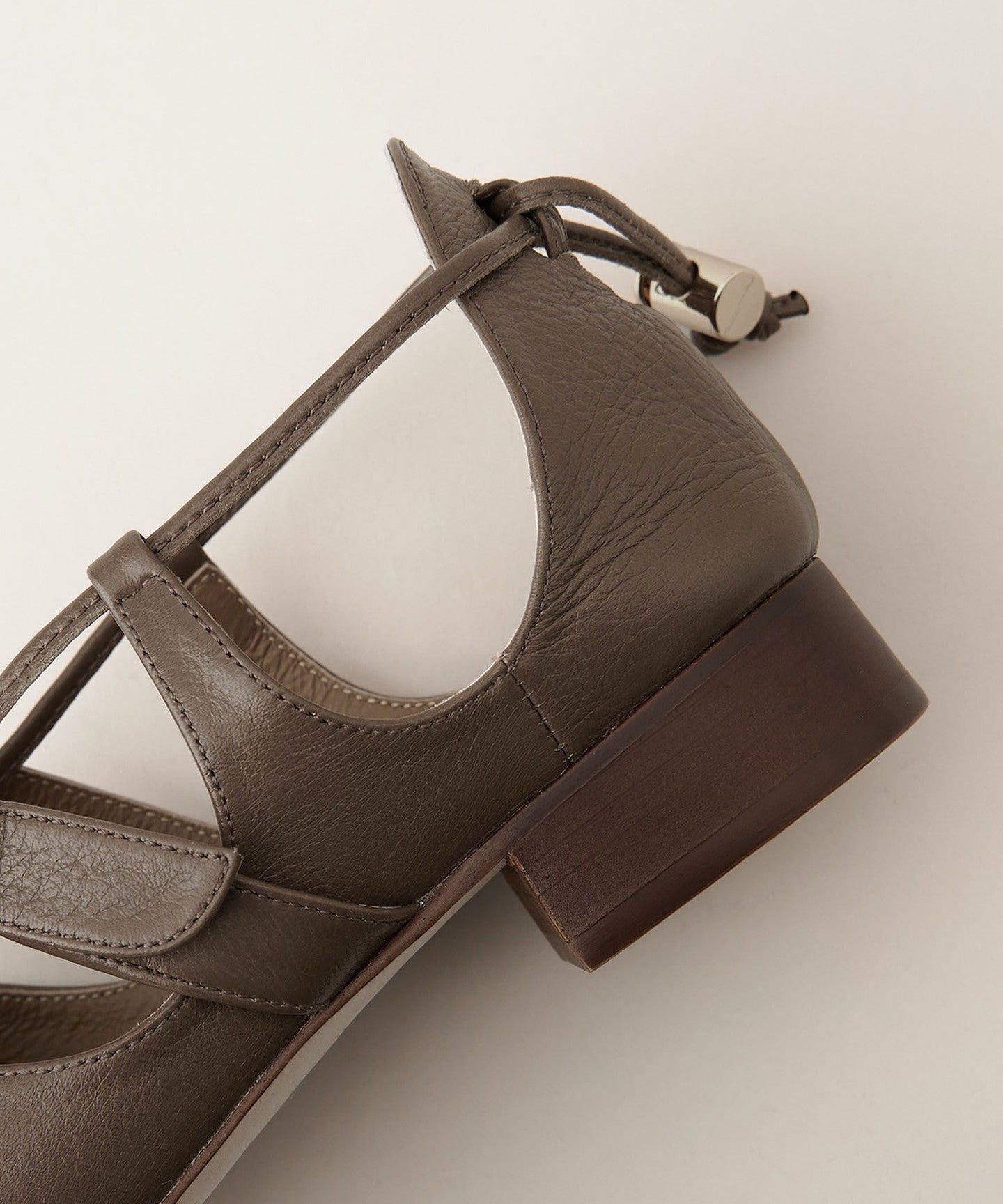 The metal fittings on the instep strap and the cord lock attached to the back of the heel add a metallic touch, creating a sophisticated impression.