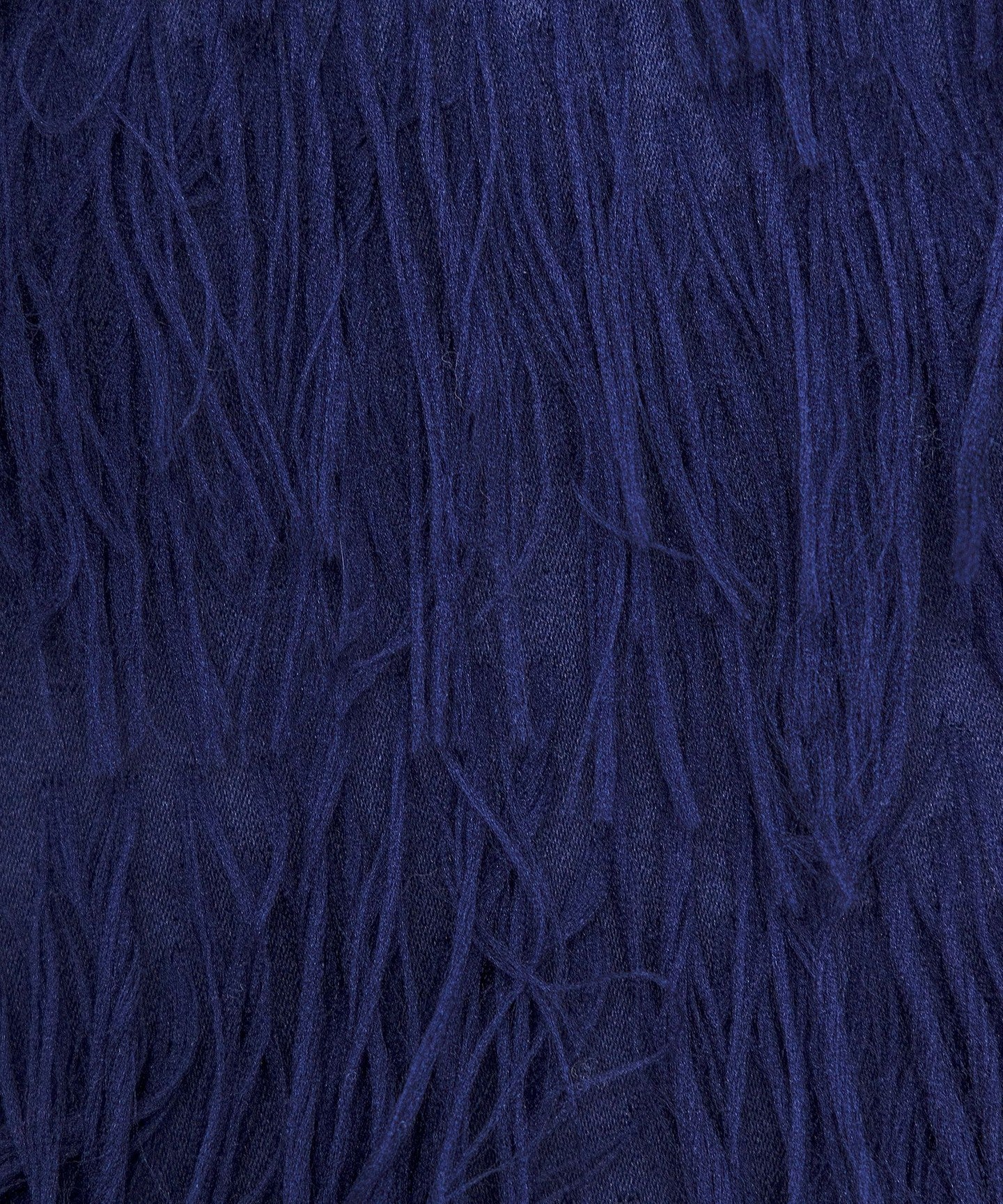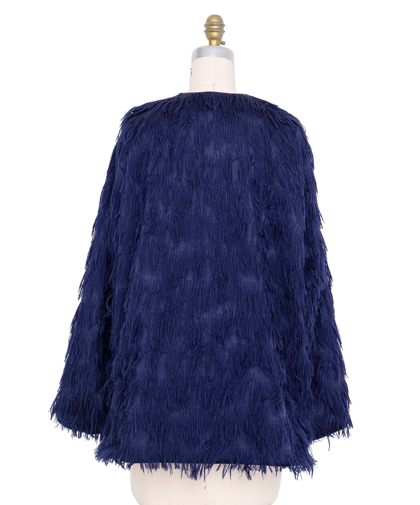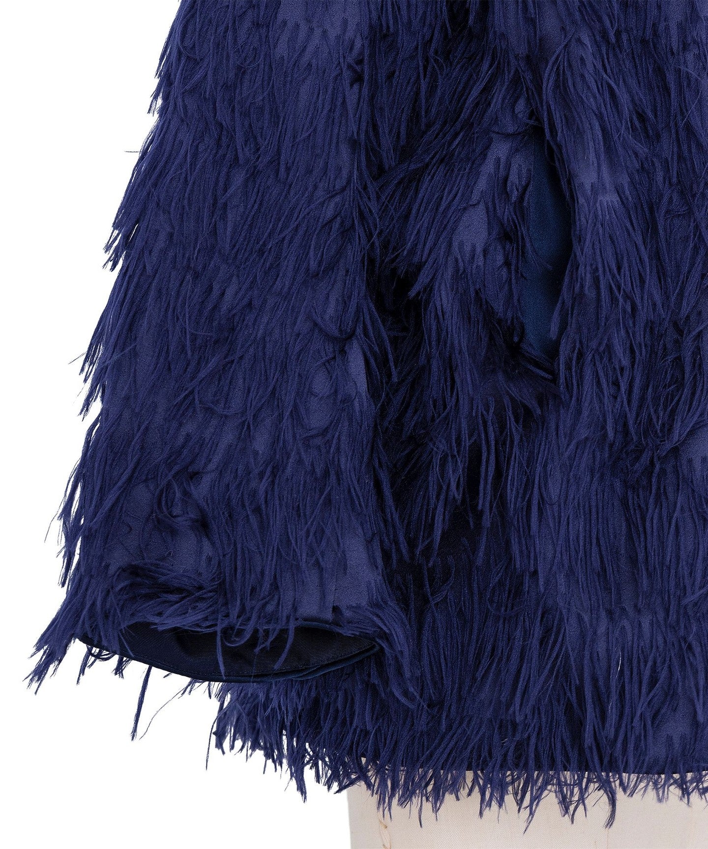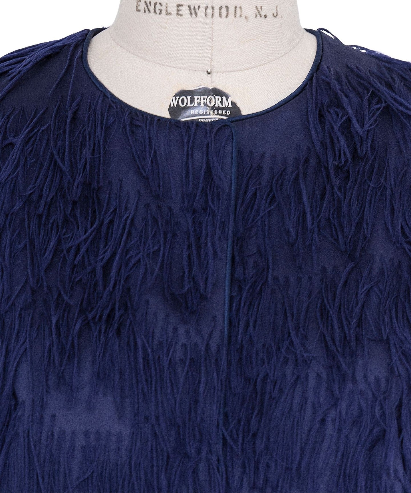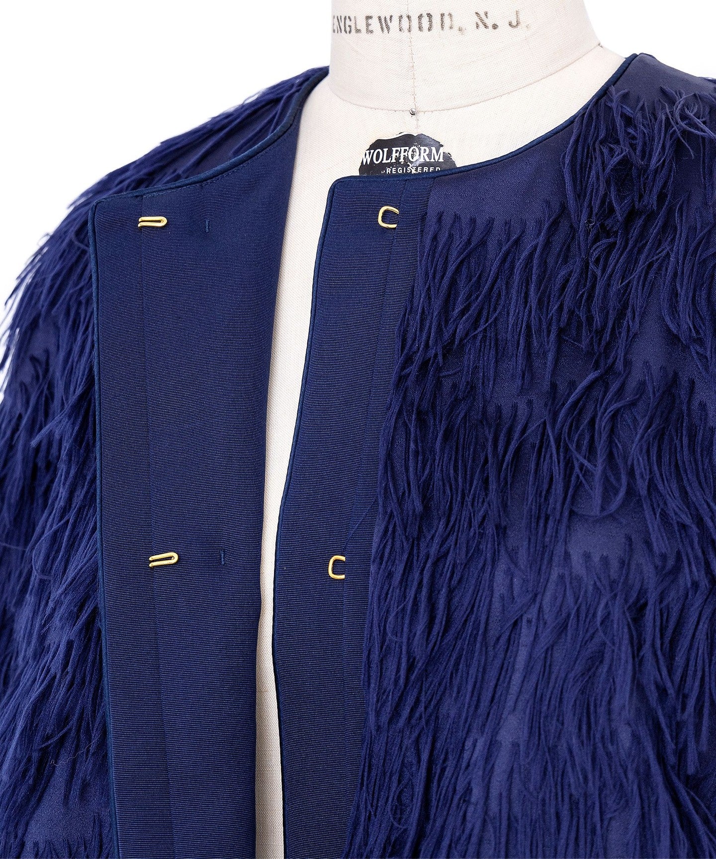 This collarless jacket has a glossy yet bright navy color that gives it a feminine impression.
