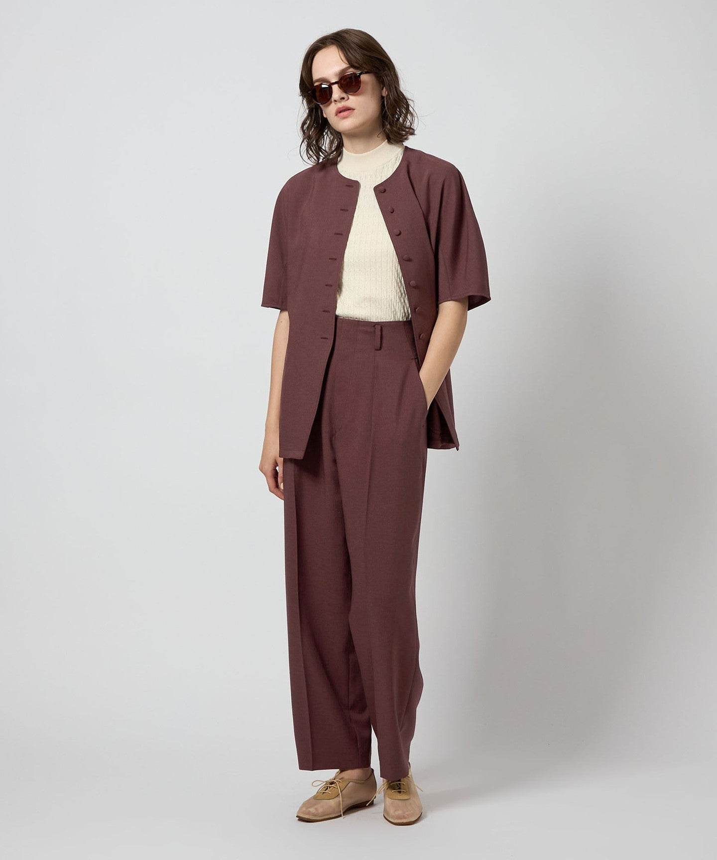 It can be coordinated as a set with a blouse made of the same material, or simply worn with the cut-and-sew tucked in for a stylish look.