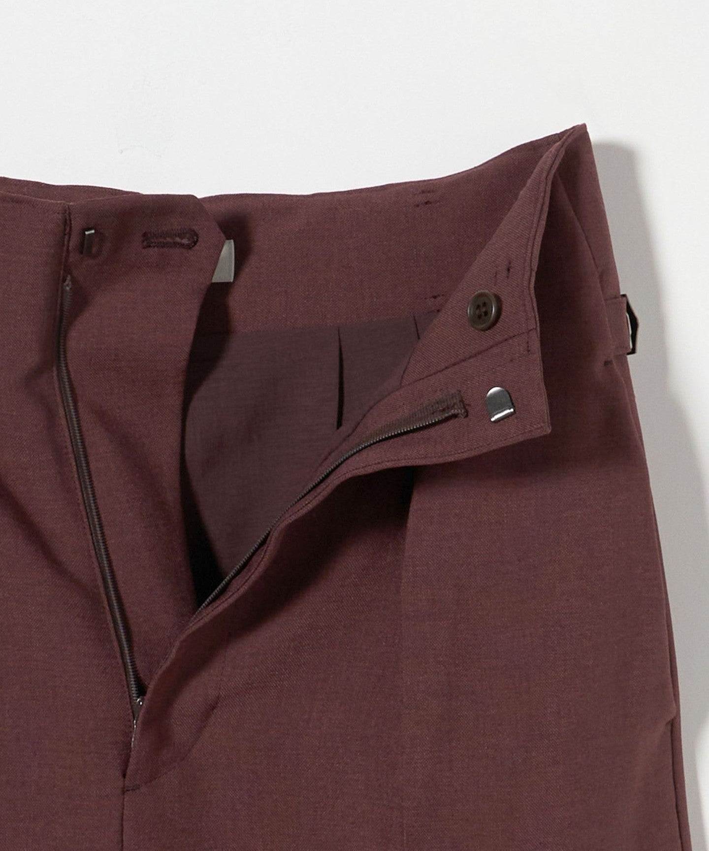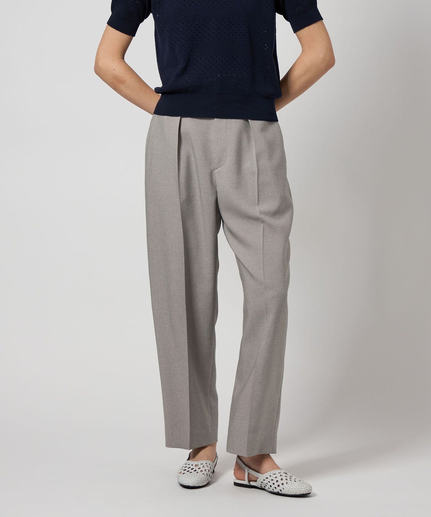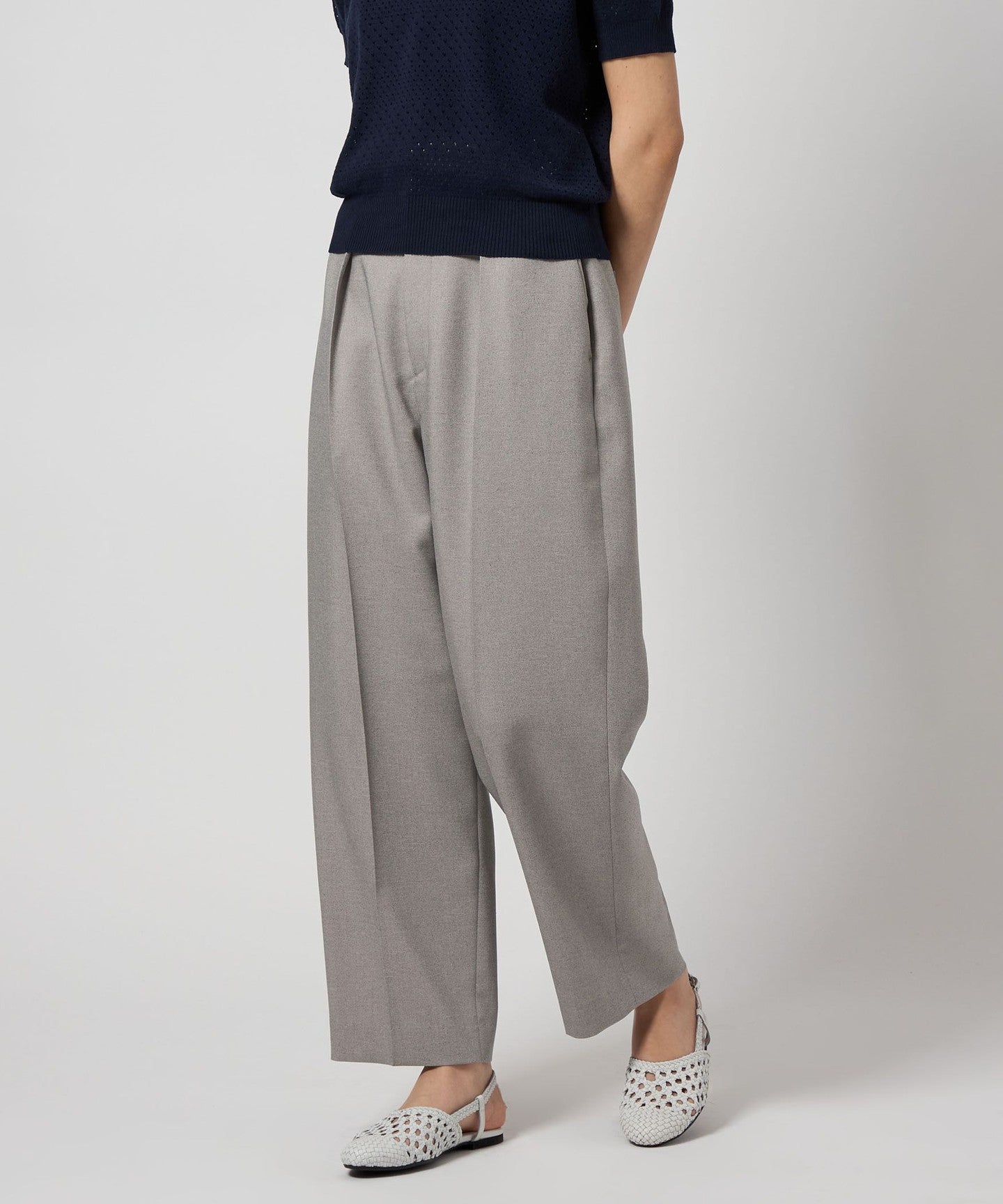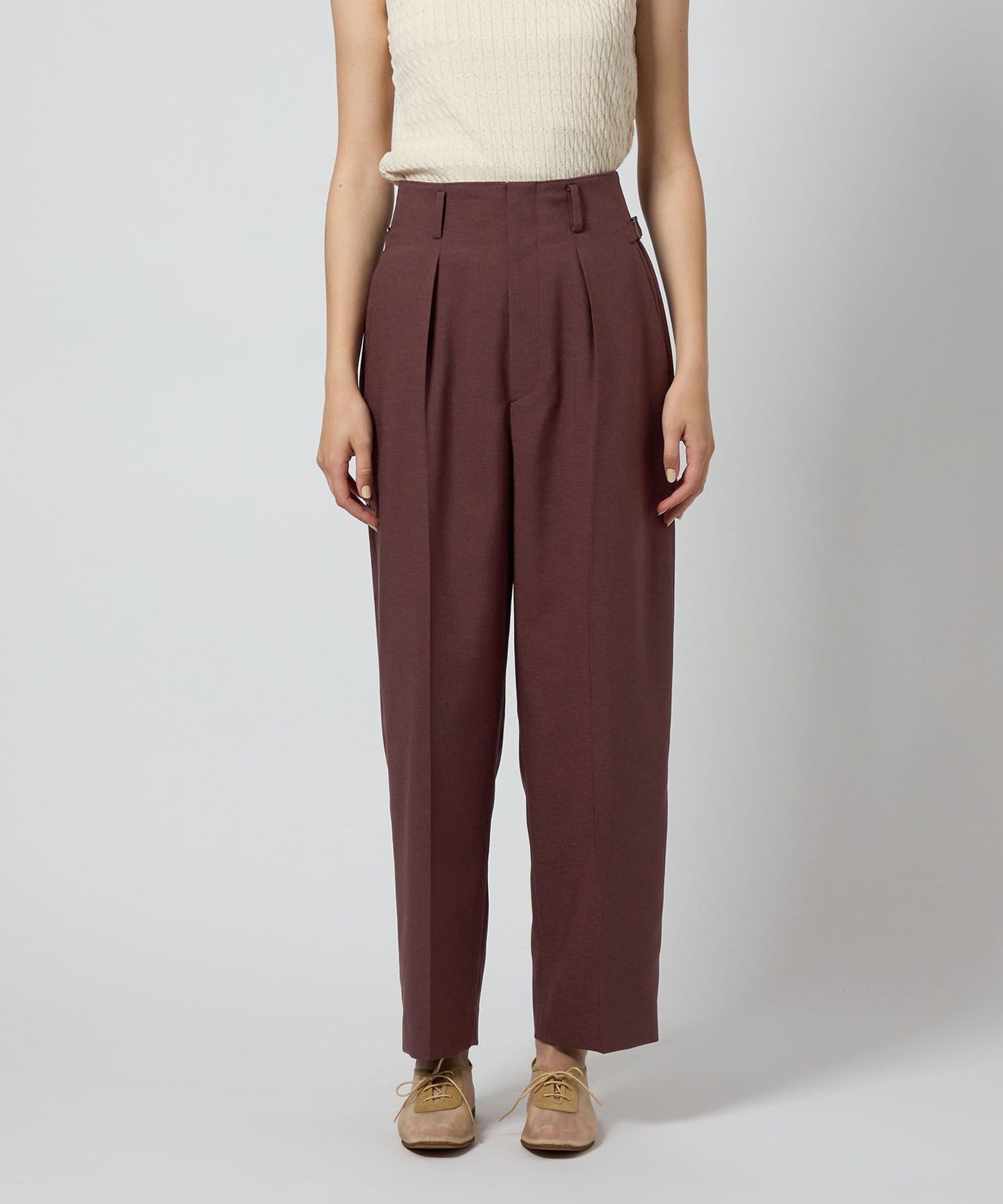 Wide silhouette tapered pants with a distinctive waist design.