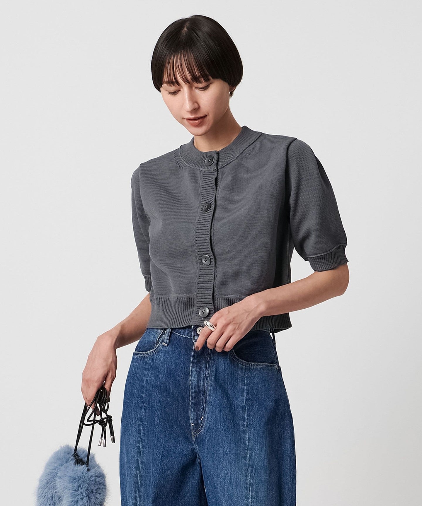 The cardigan is made of a crisp material, knitted using multiple strands of polyester yarn that is less likely to snag.