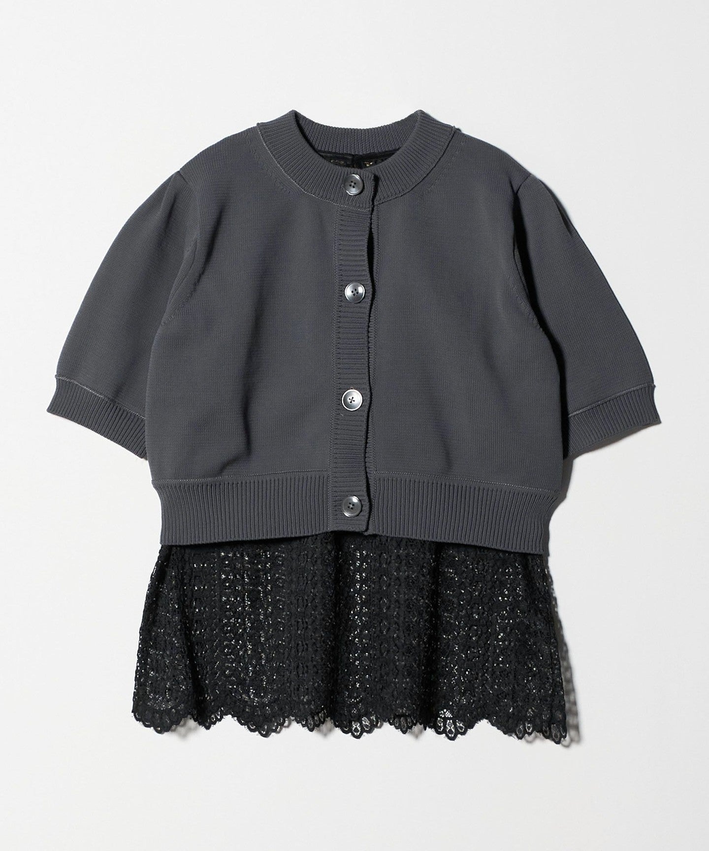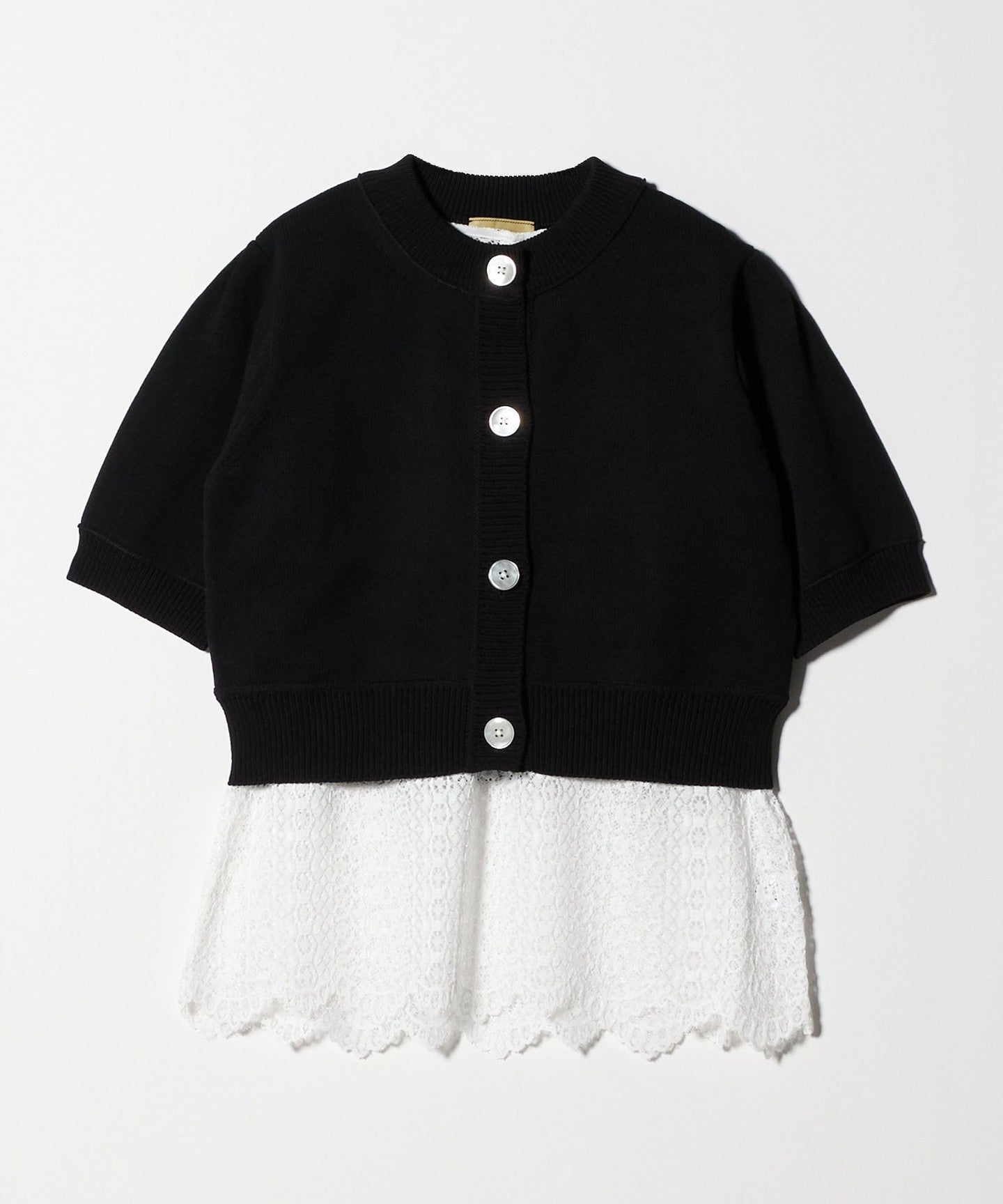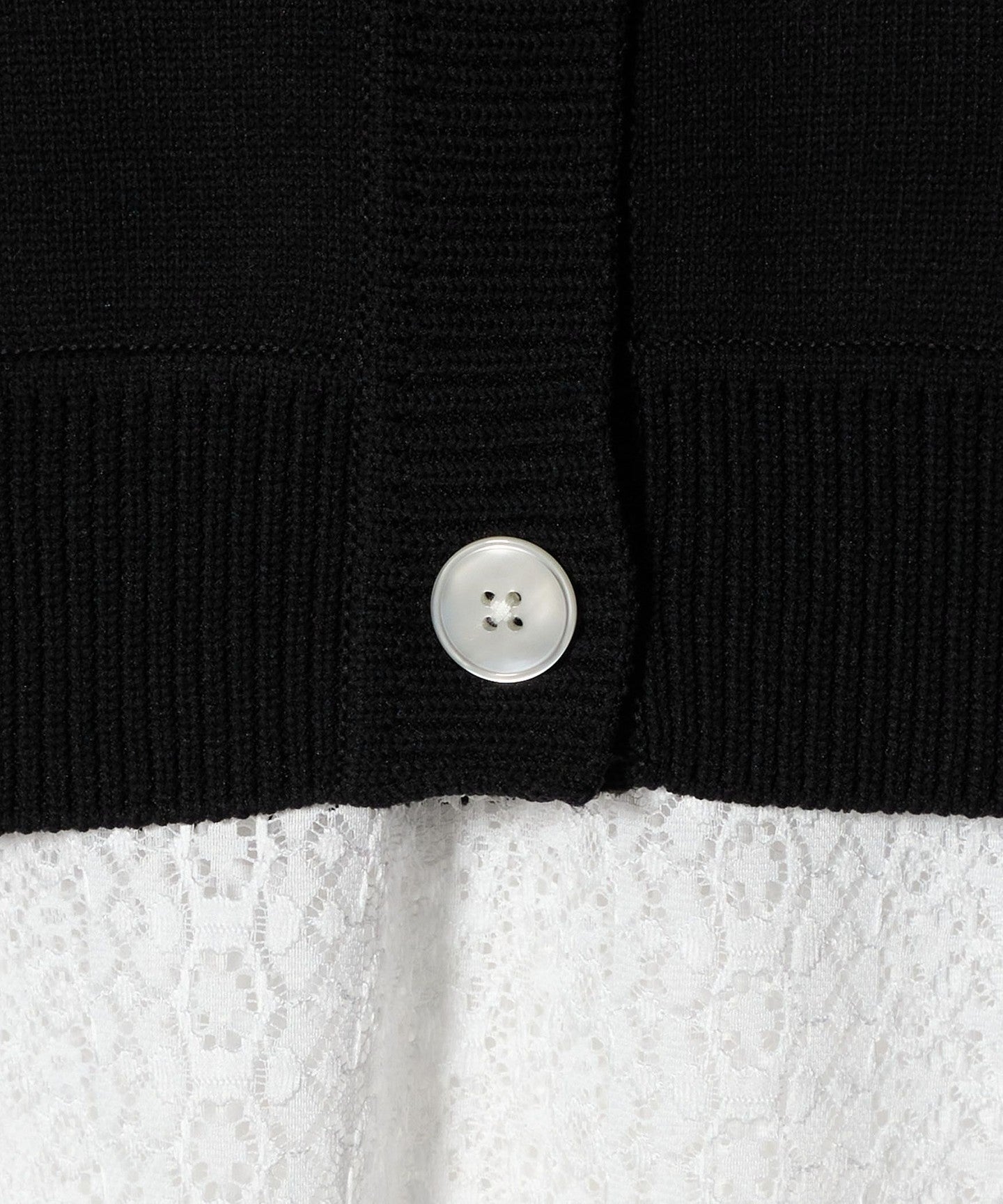 A layered set consisting of a short length, three-quarter sleeve cardigan with a lace inner layer.