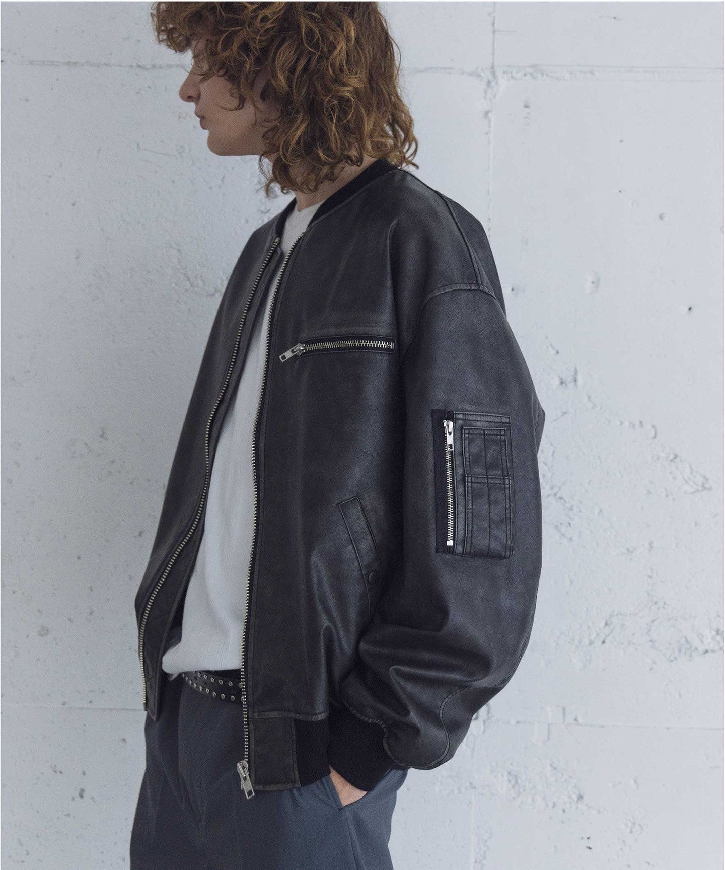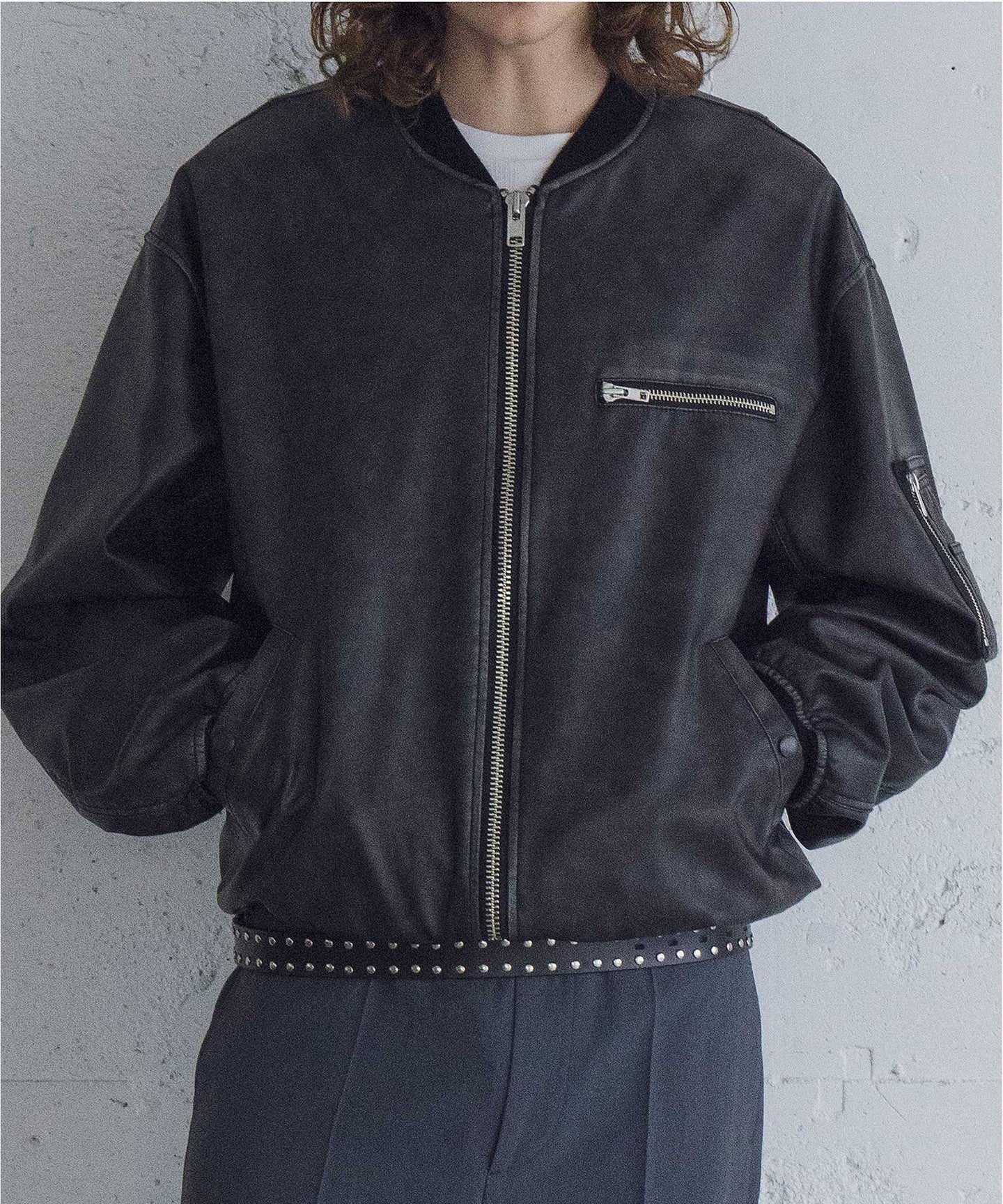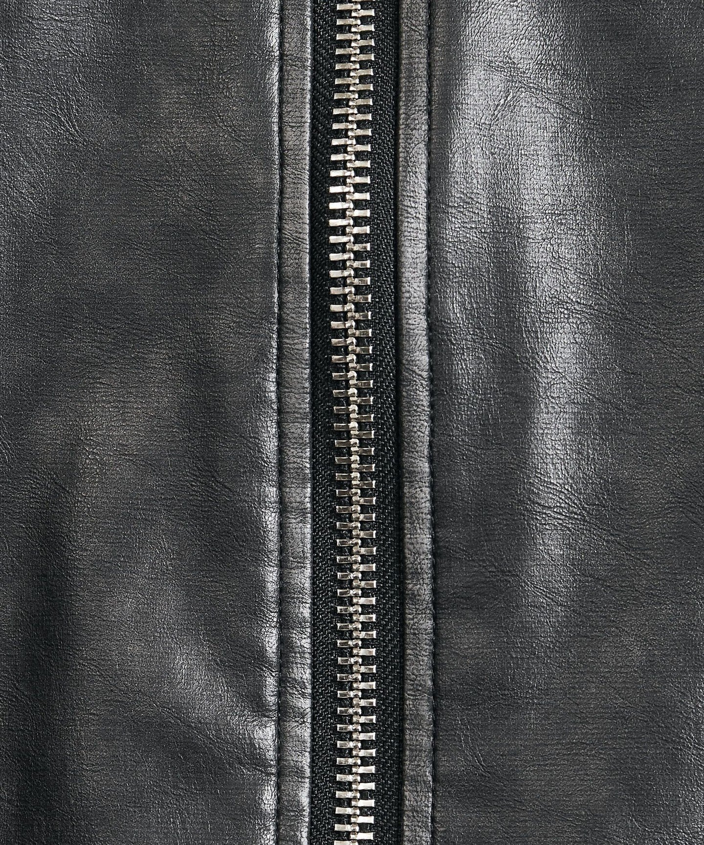 The highly glossy zipper is used as an accent, and the stitching and areas that are subject to wear through wear have been faded to create a deep vintage look.