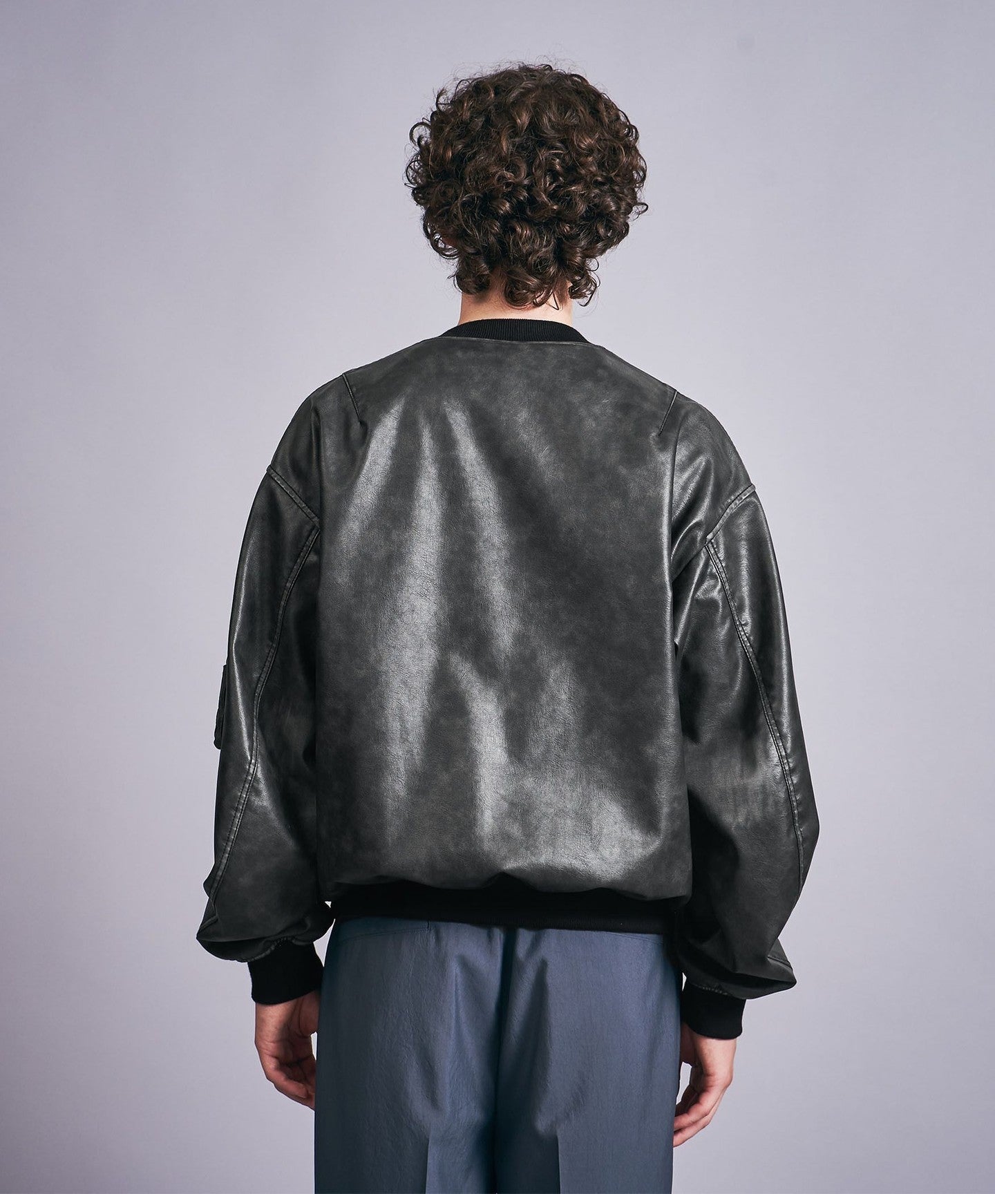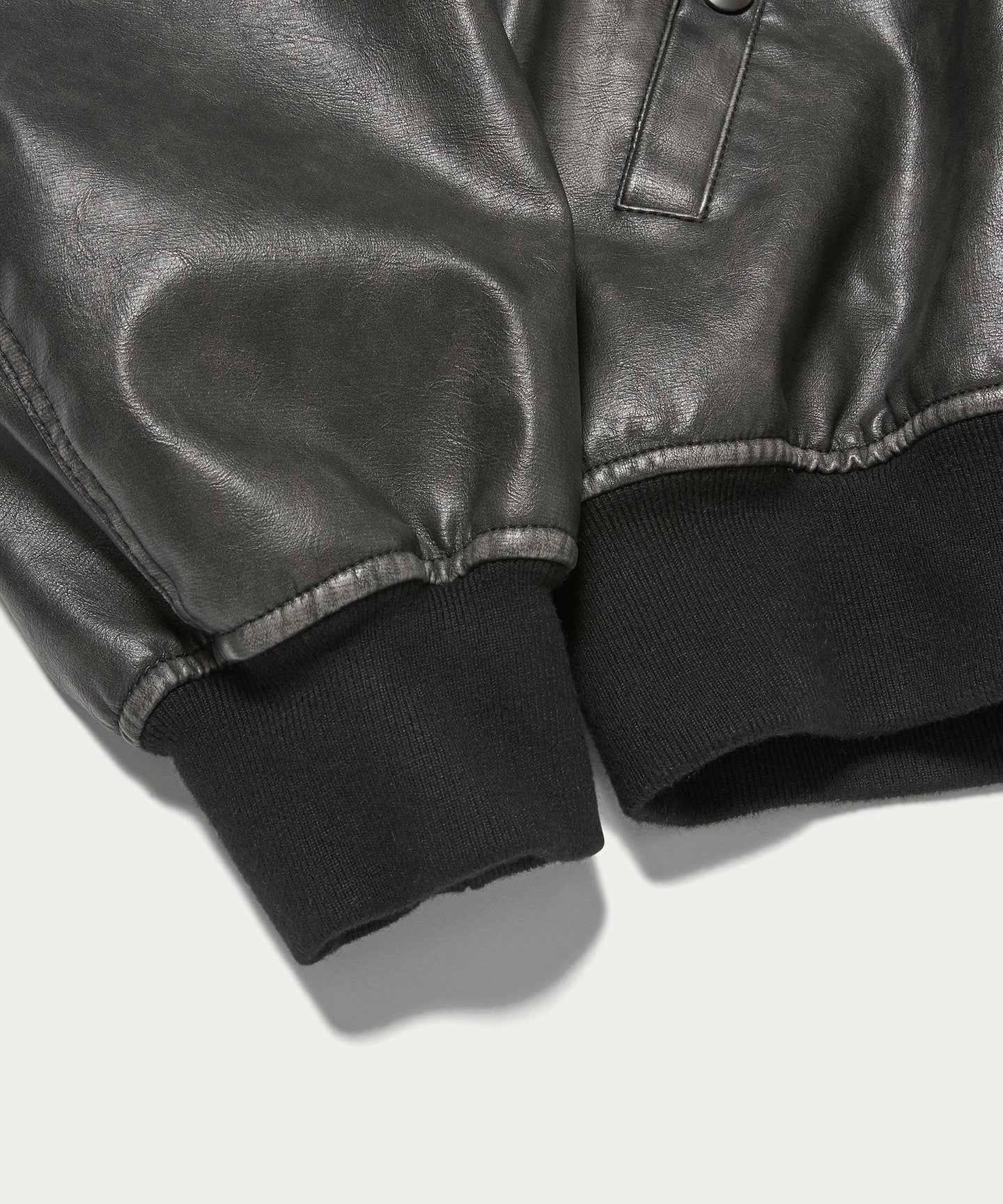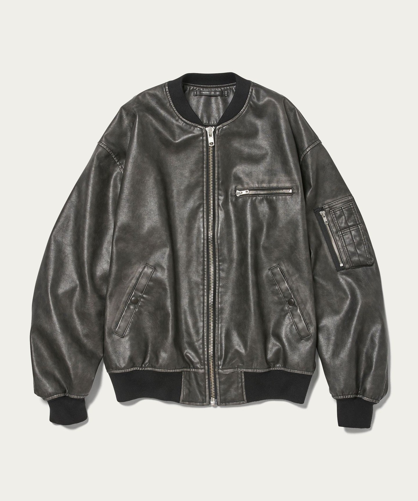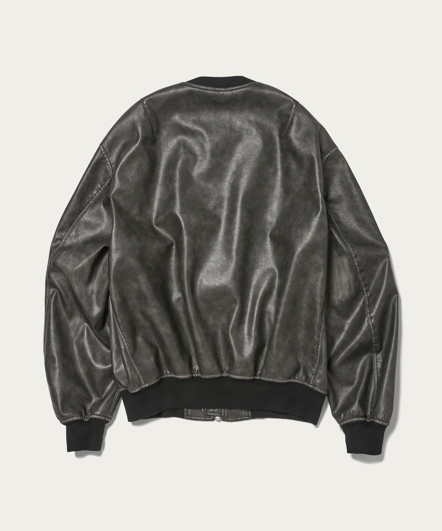 A bomber jacket made of vintage-like synthetic leather with a greige base and black surface finish.