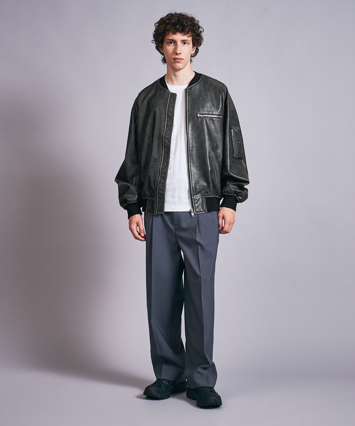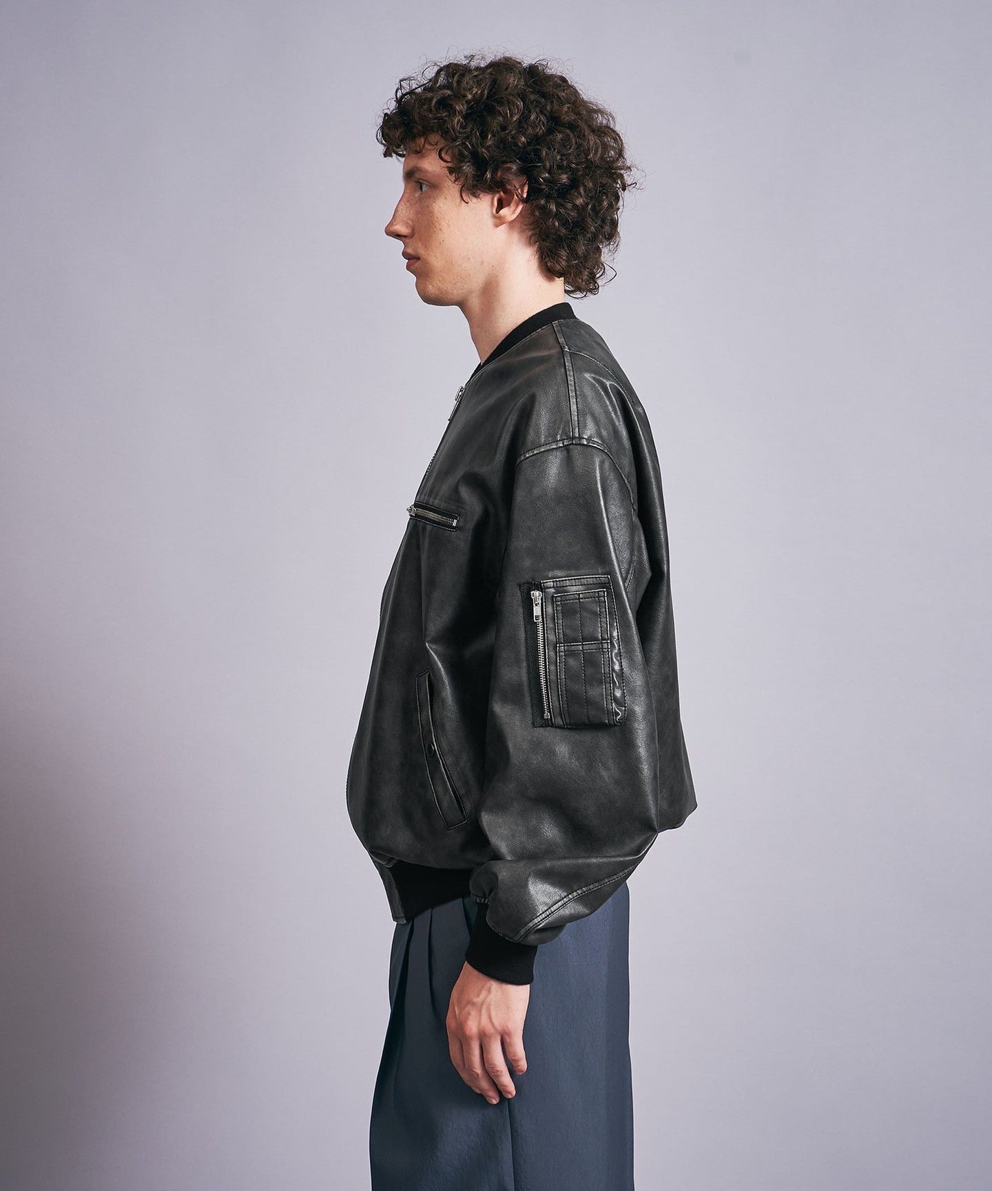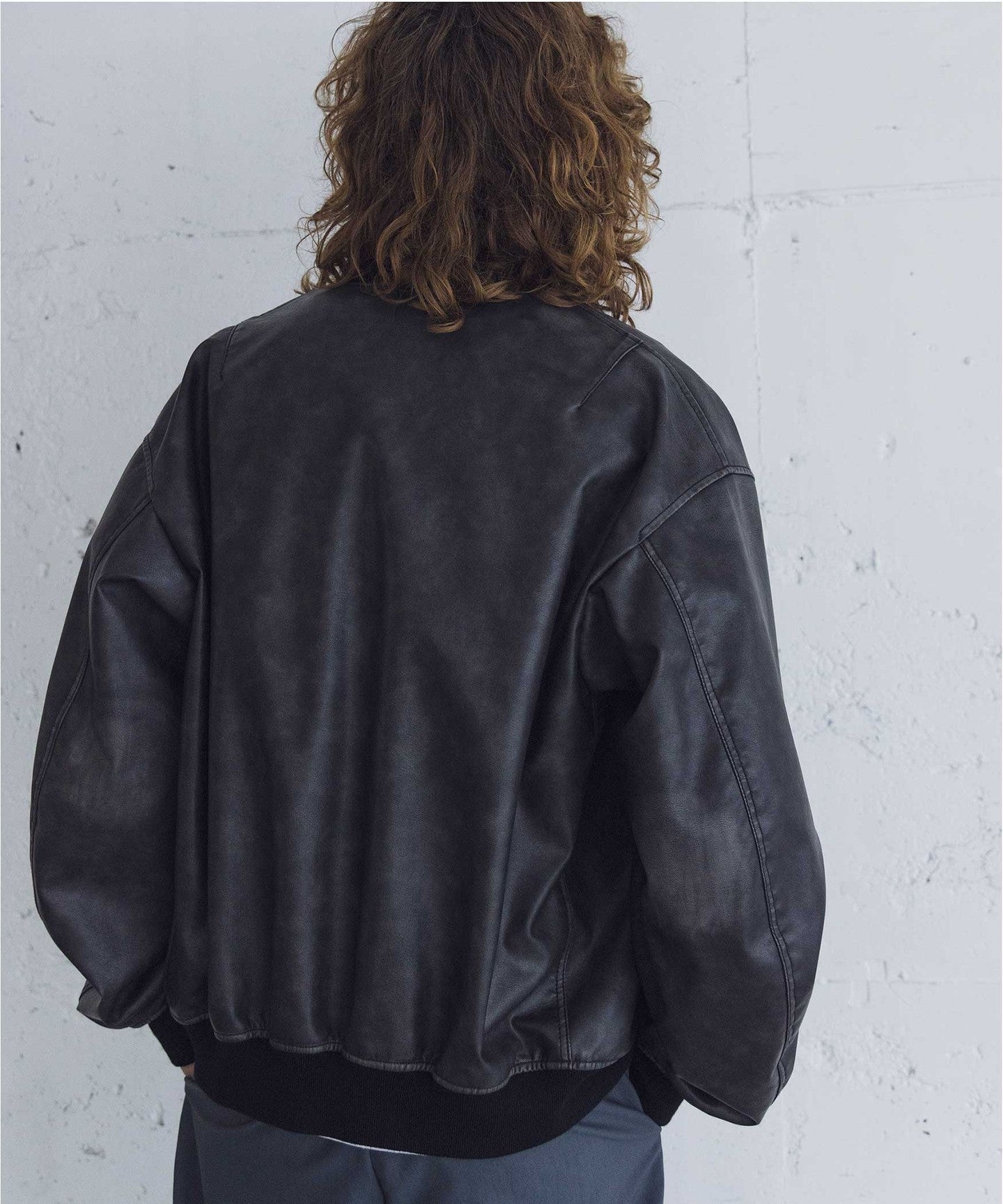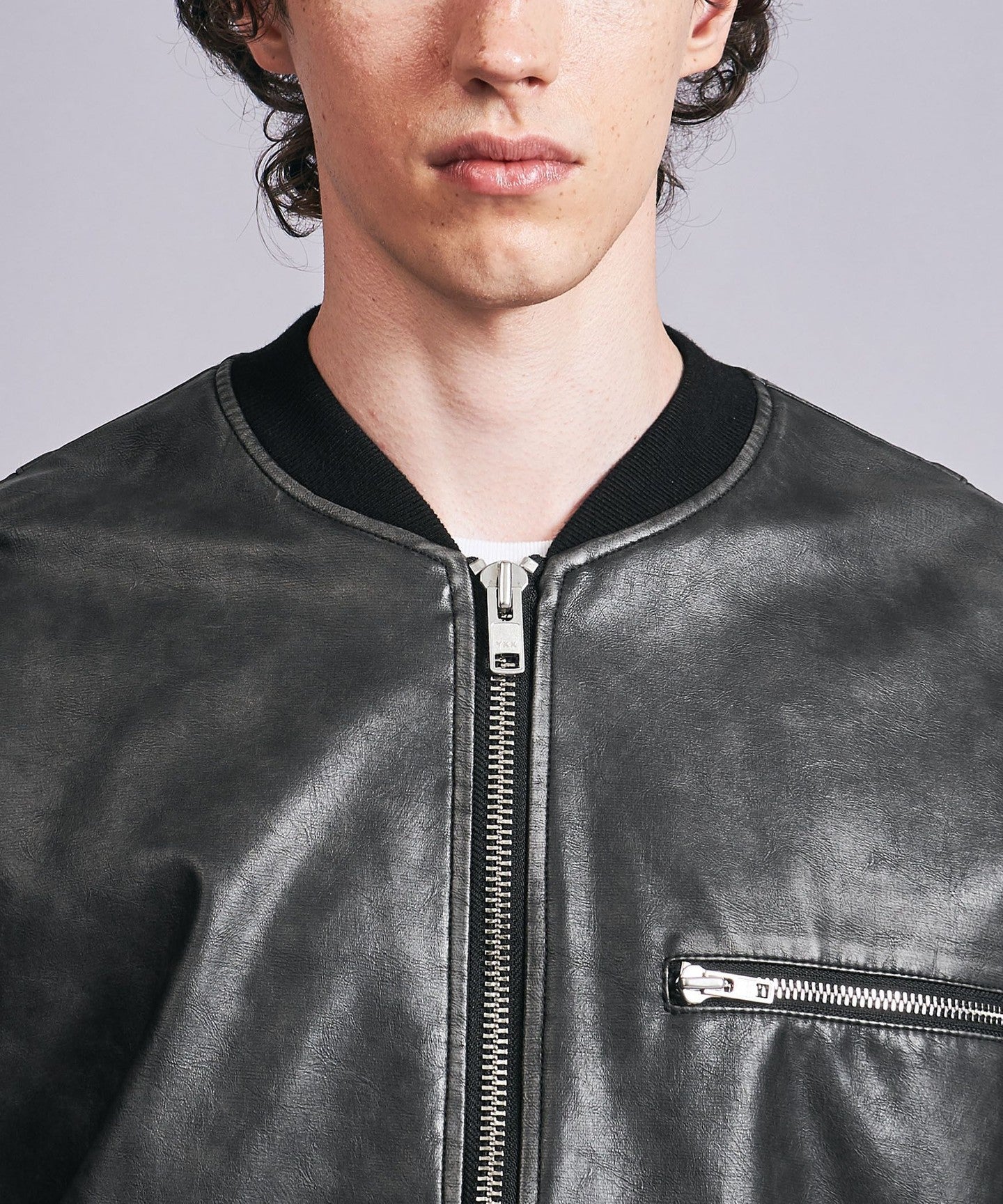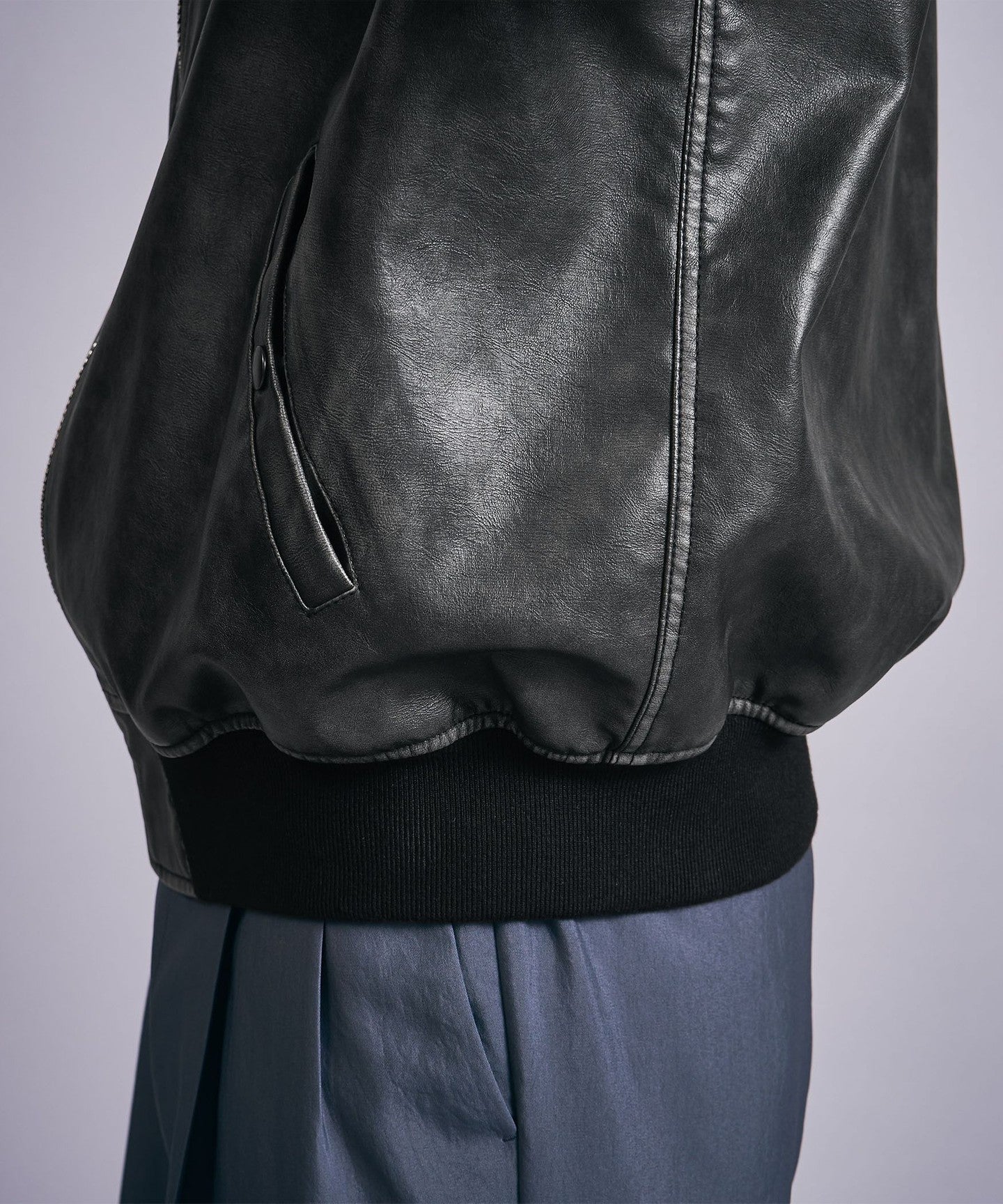 A bomber jacket made of vintage-like synthetic leather with a greige base and black surface finish.