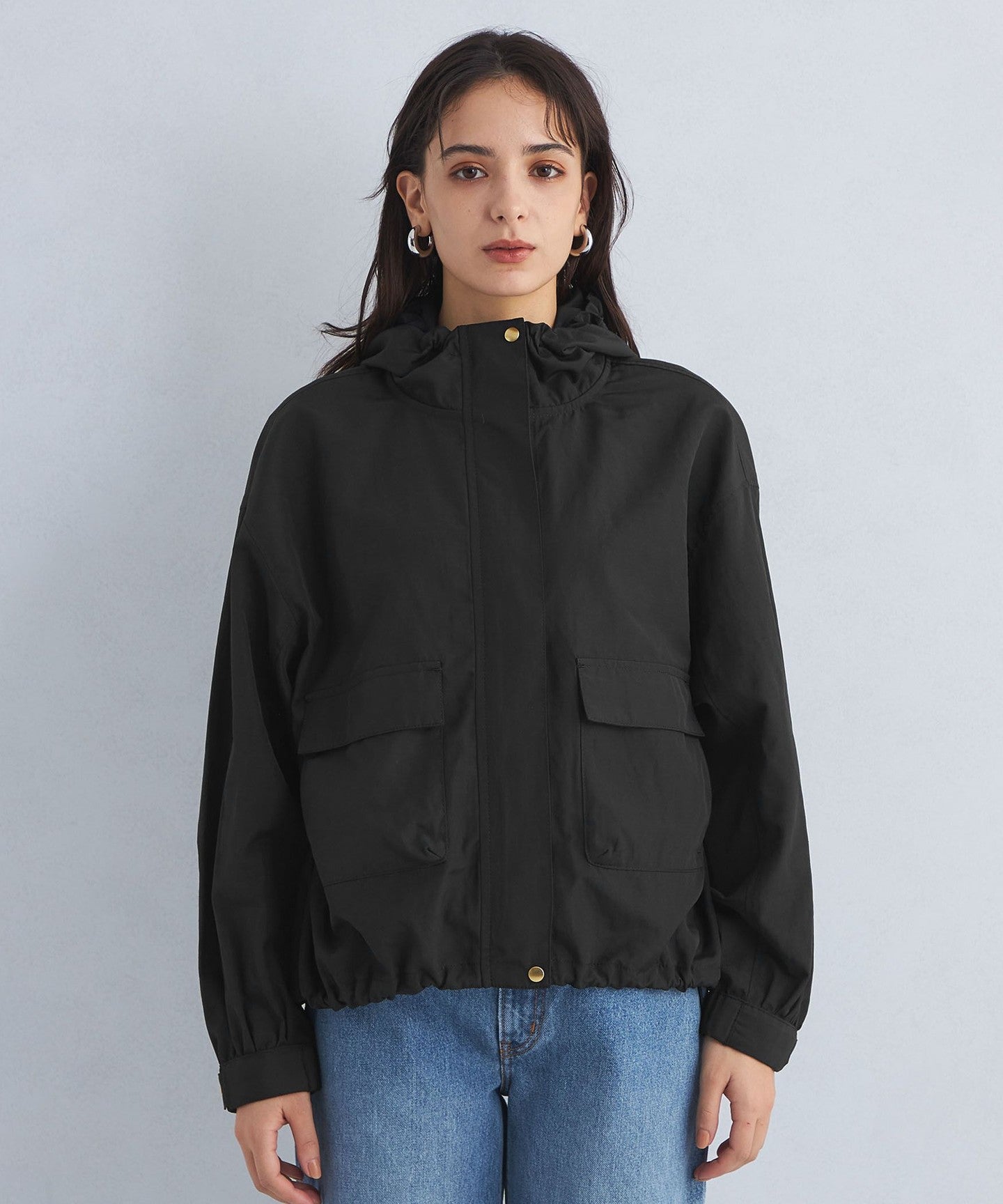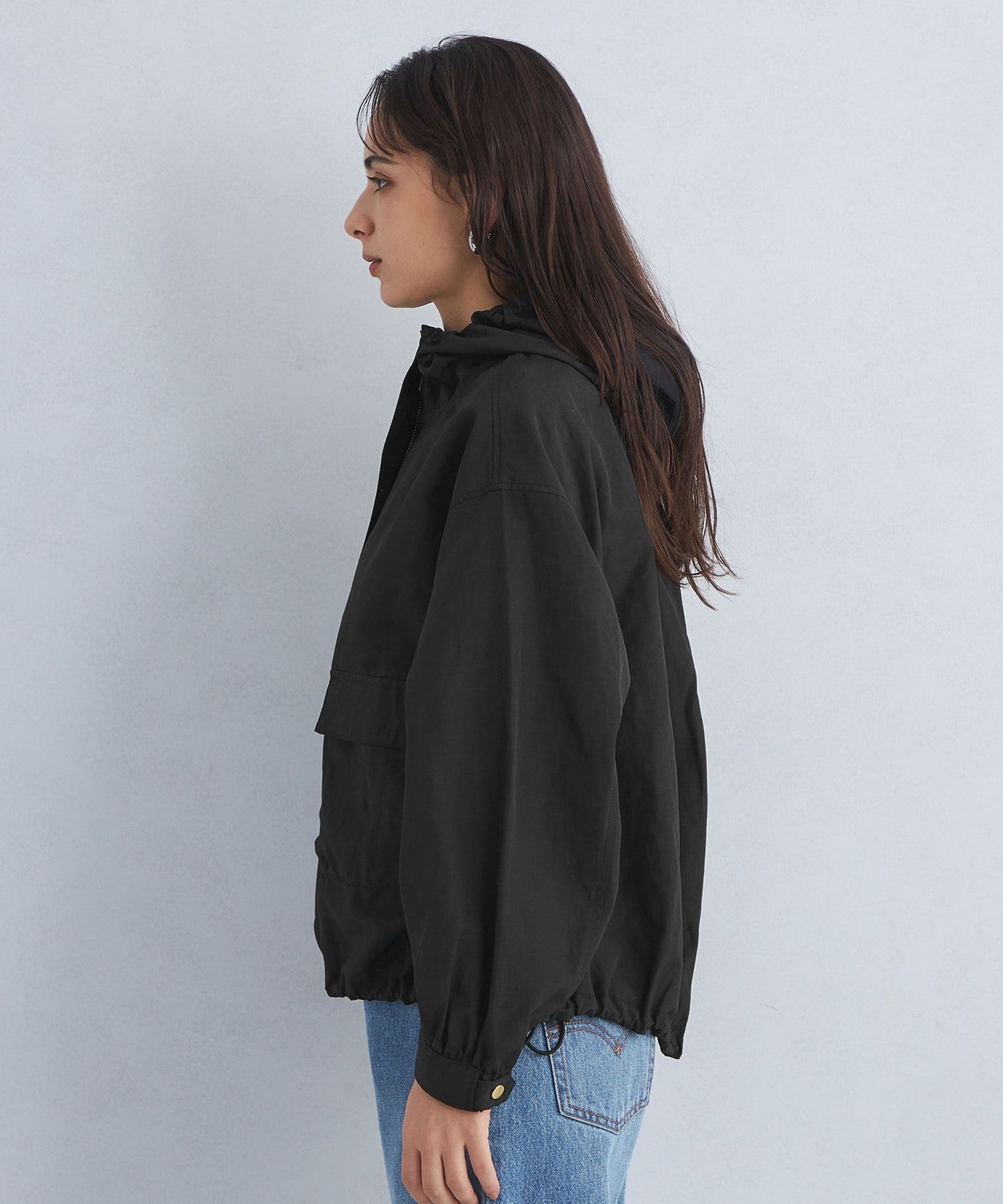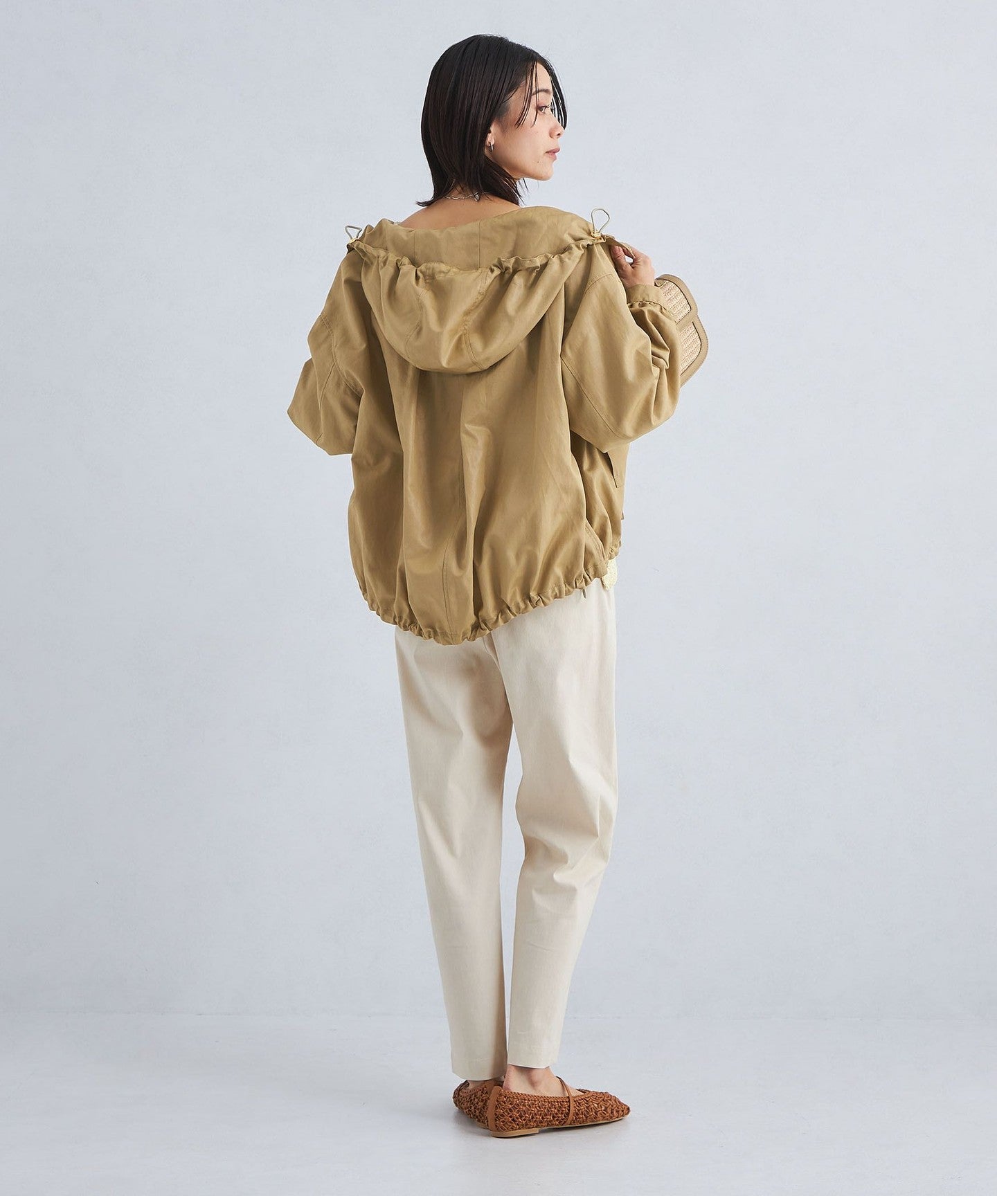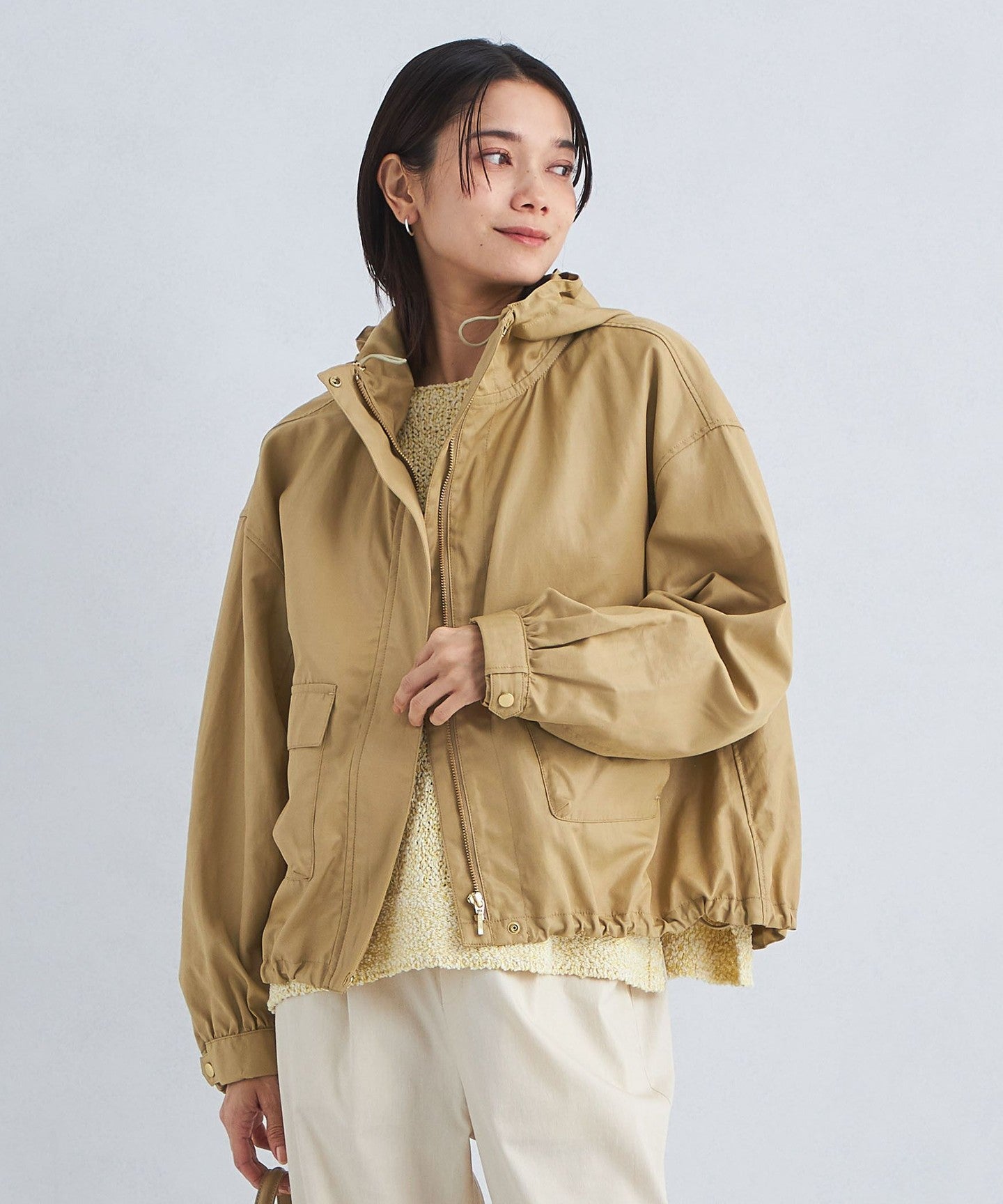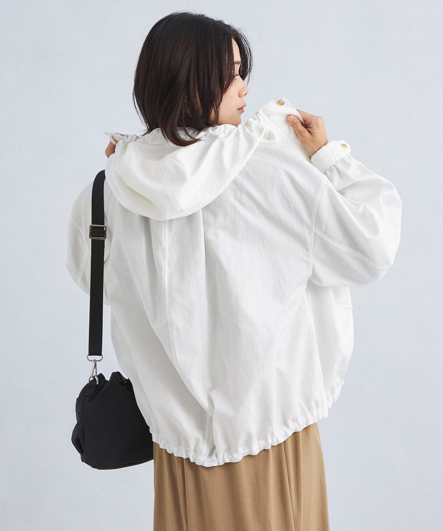 It has a loose silhouette, but the length that covers the waist just enough and the three-dimensional hood give it a clean impression.