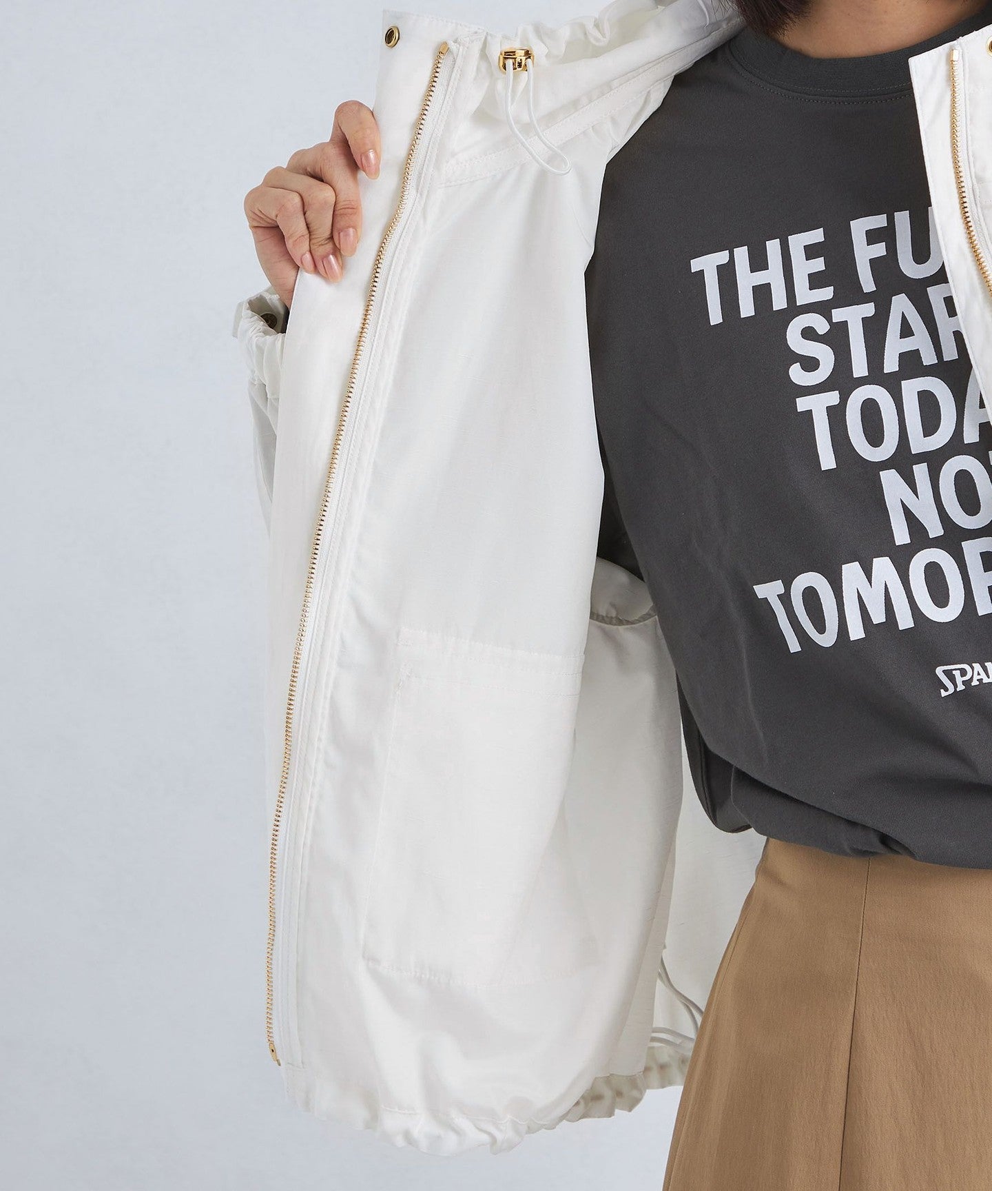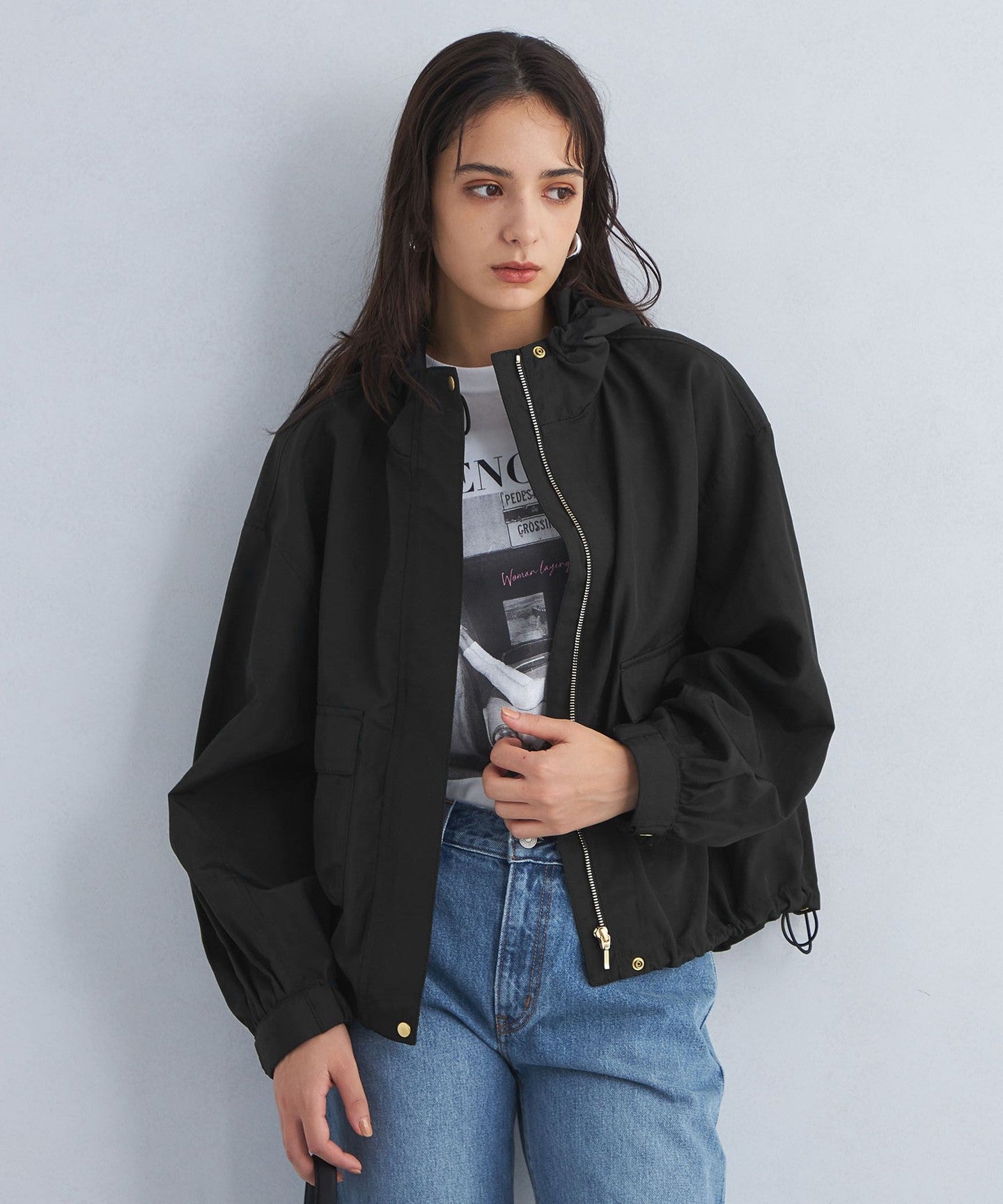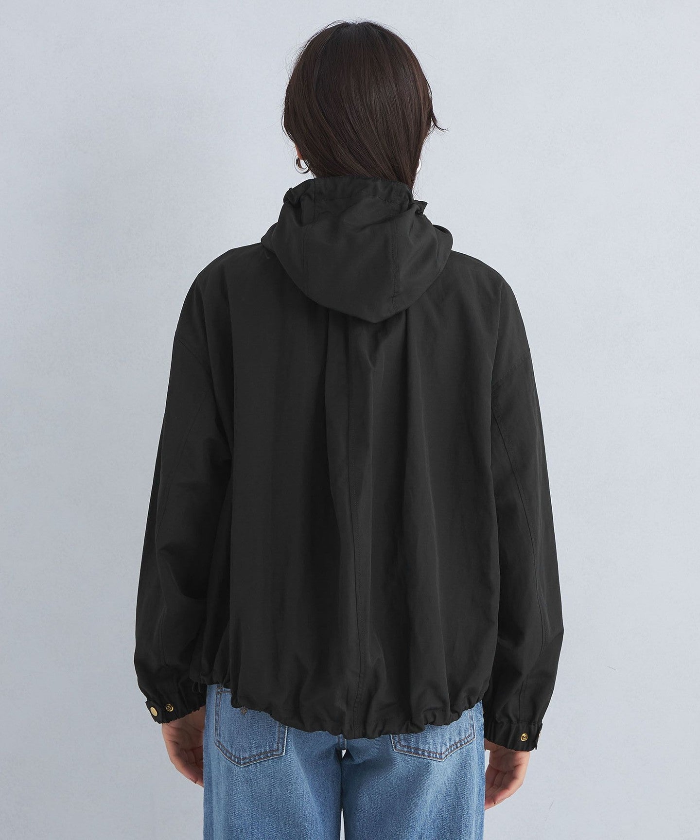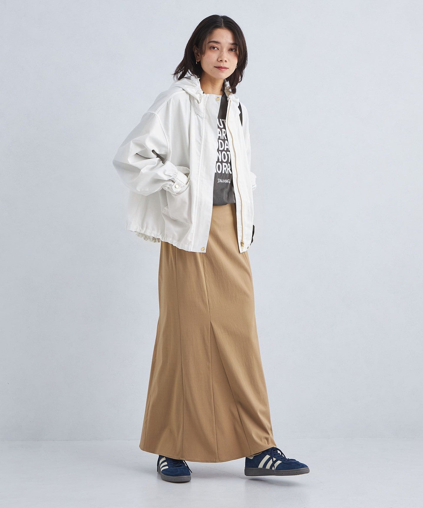 It has a loose silhouette, but the length that covers the waist just enough and the three-dimensional hood give it a clean impression.