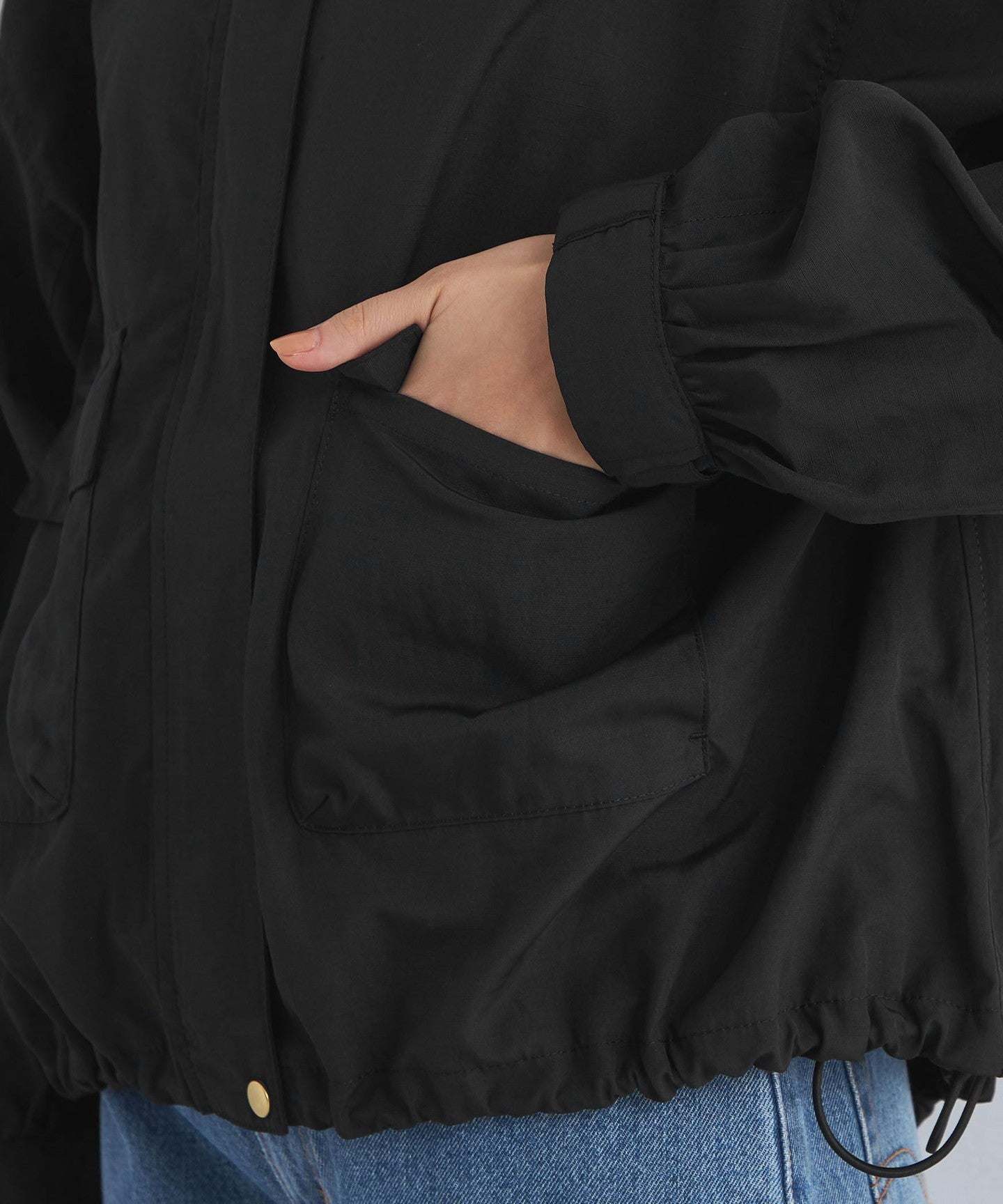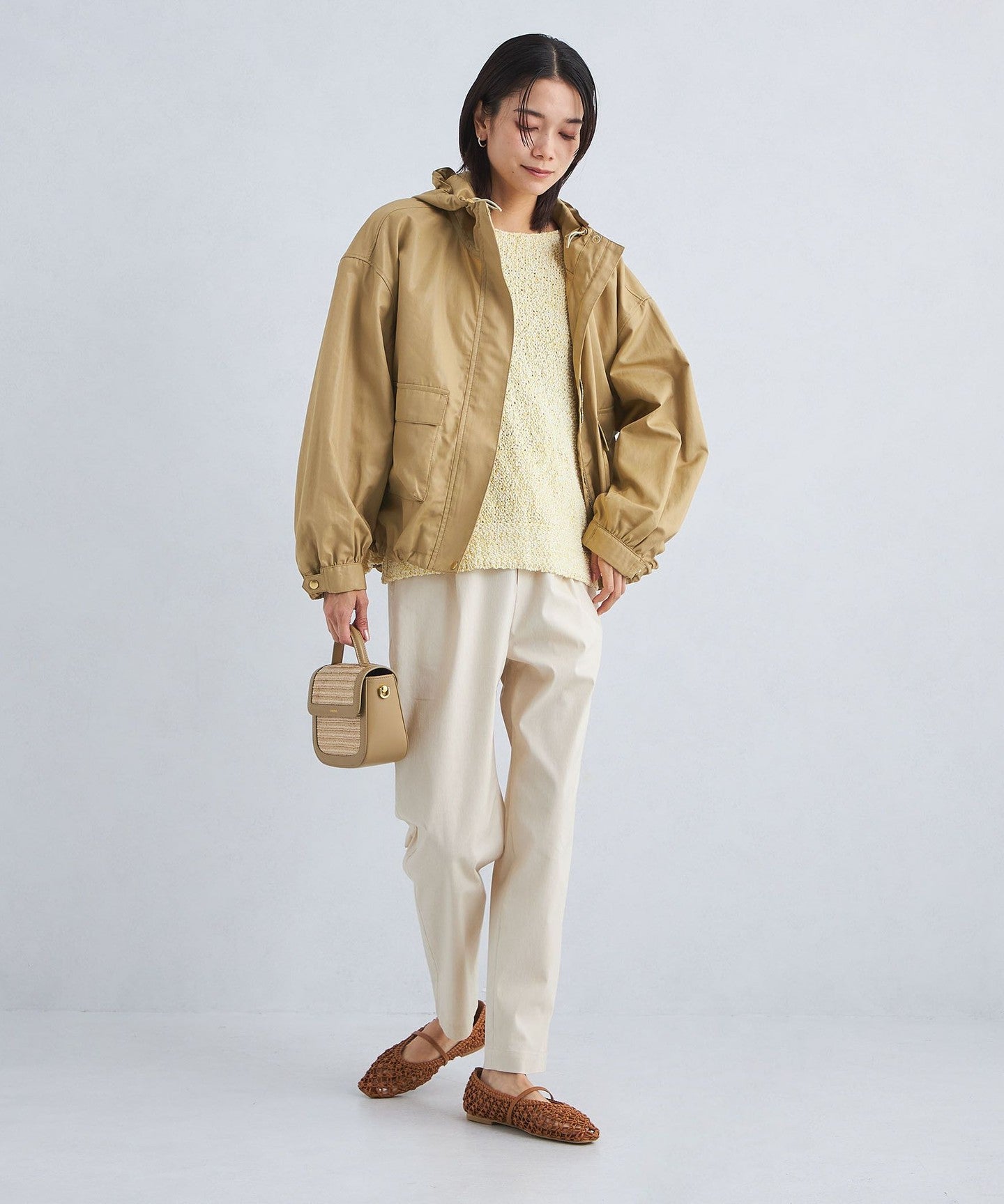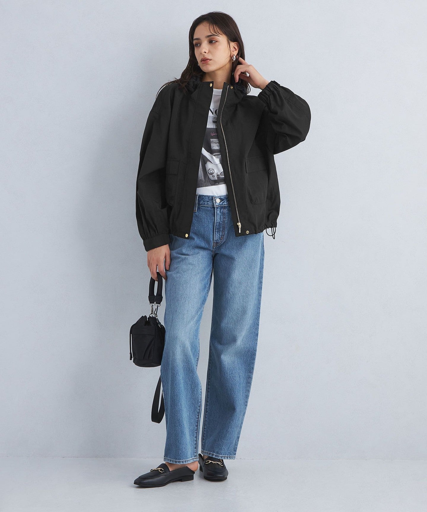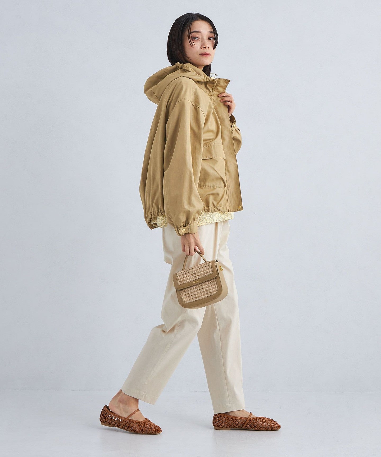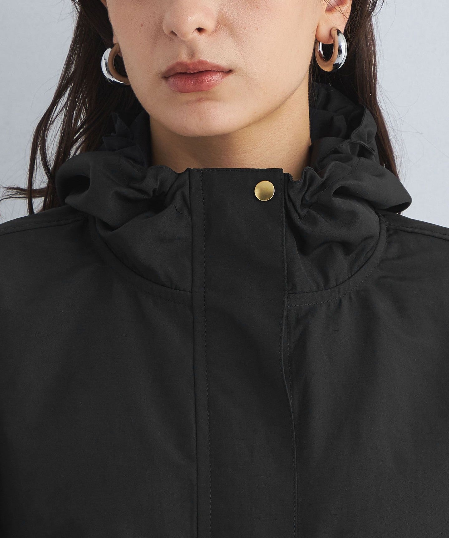 It has a loose silhouette, but the length that covers the waist just enough and the three-dimensional hood give it a clean impression.