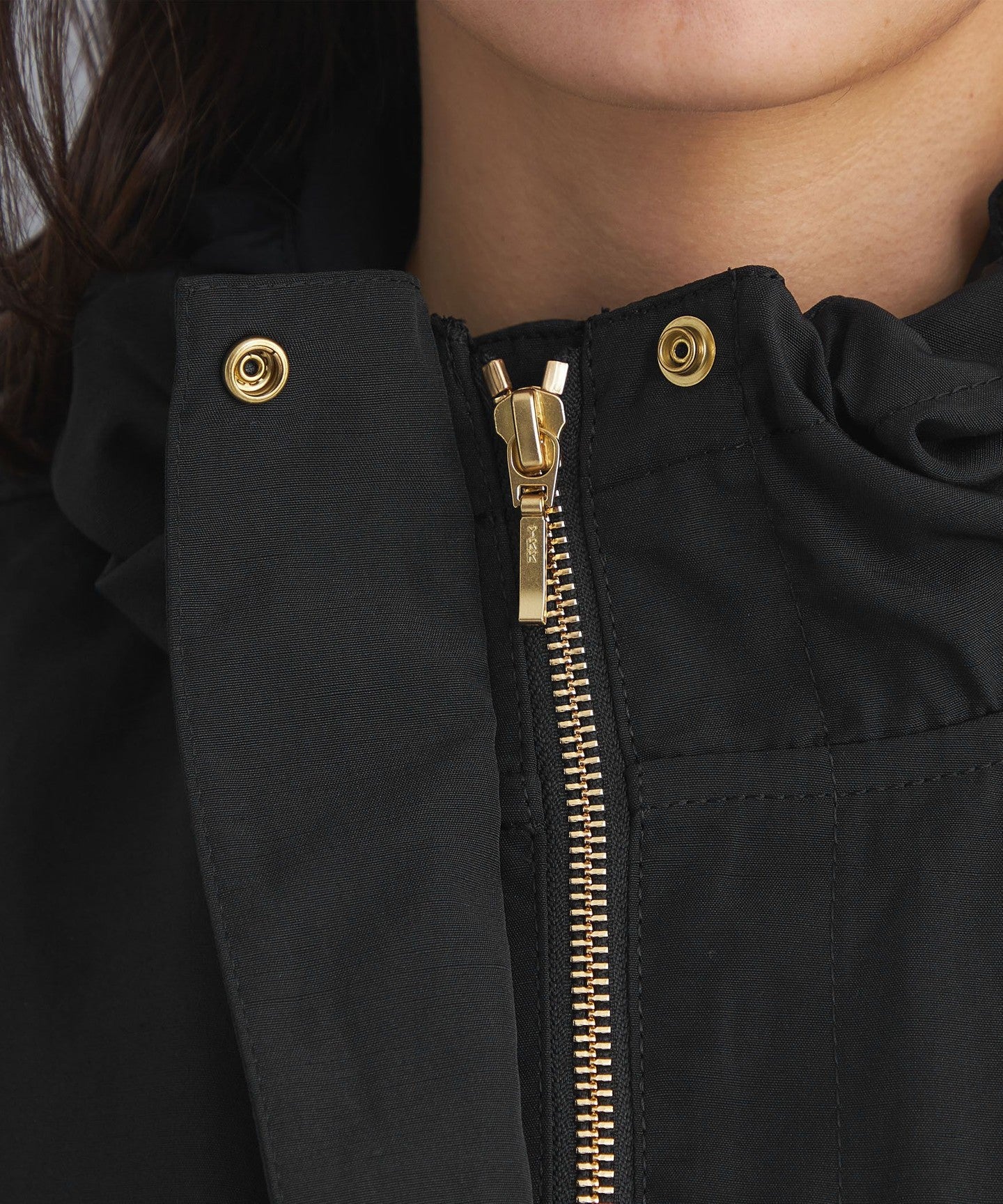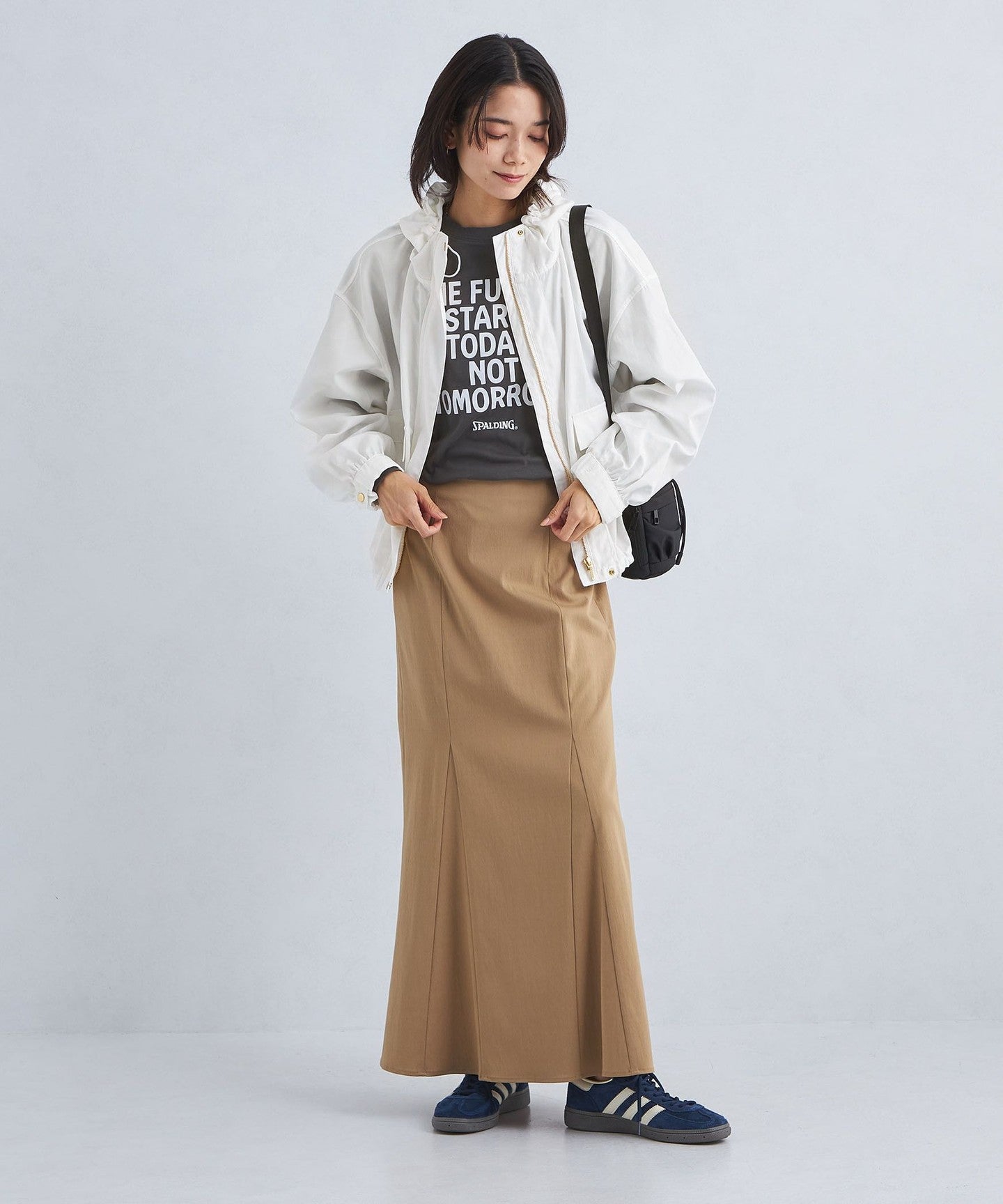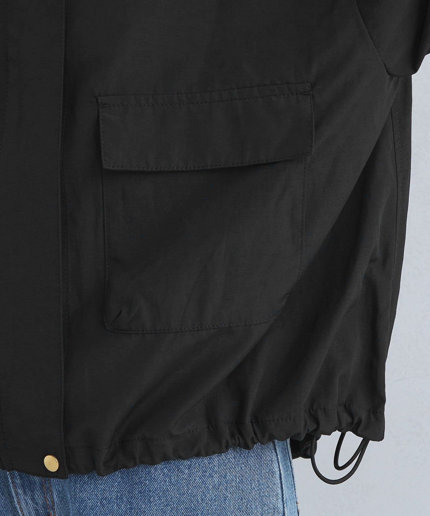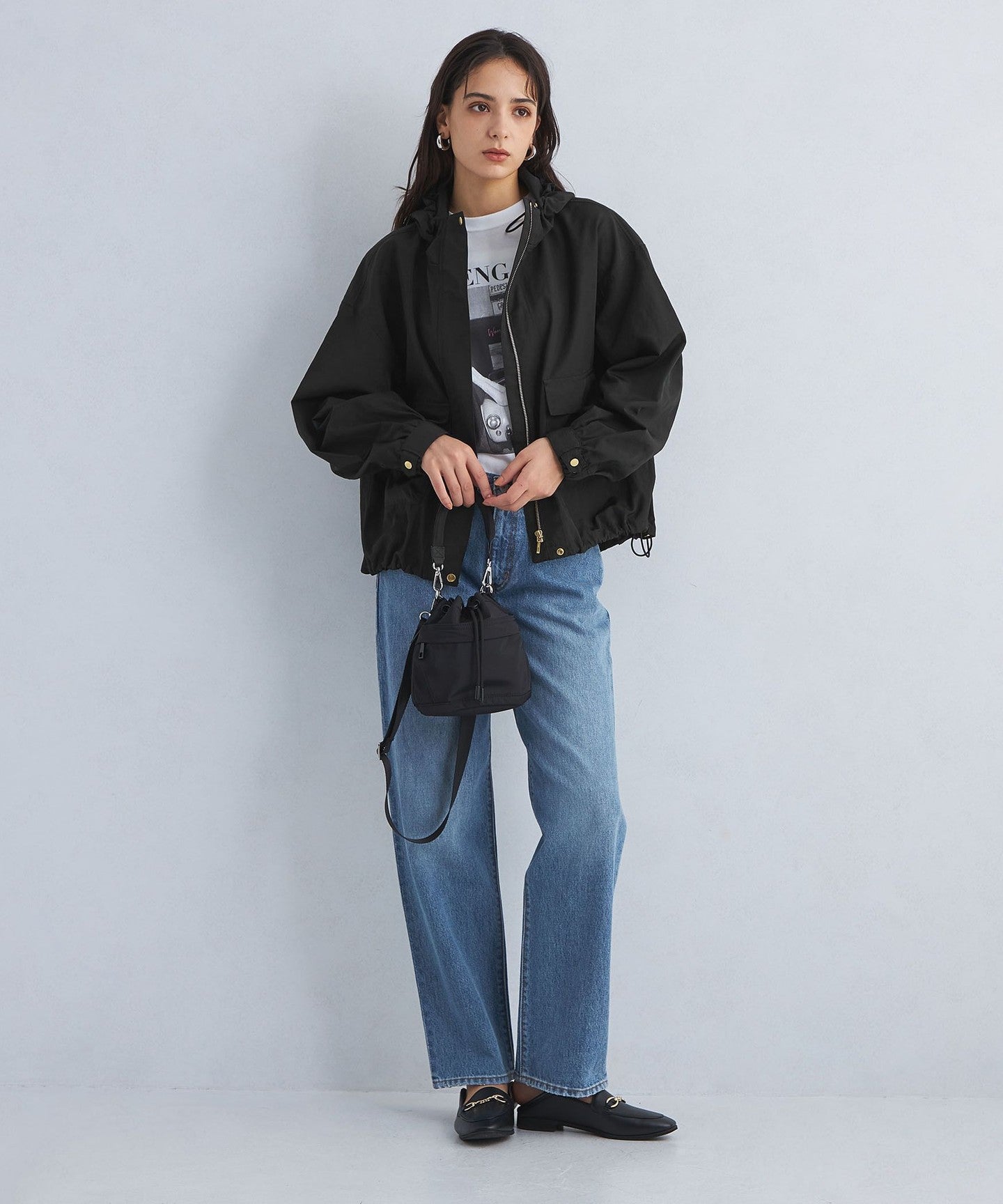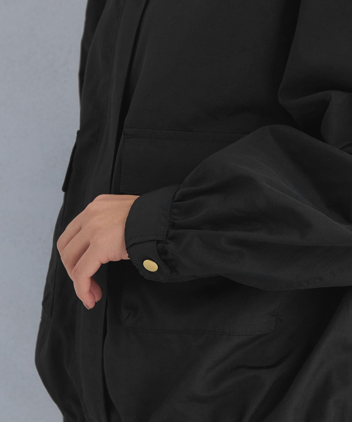 It has a loose silhouette, but the length that covers the waist just enough and the three-dimensional hood give it a clean impression.