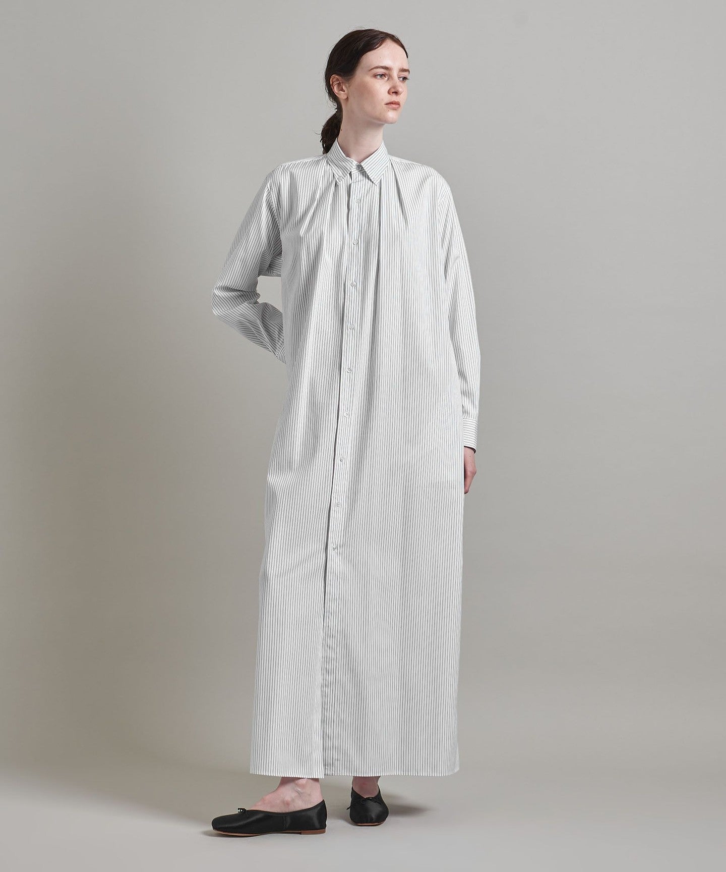 A tent-silhouette shirt dress with voluminous tucks at the collar.