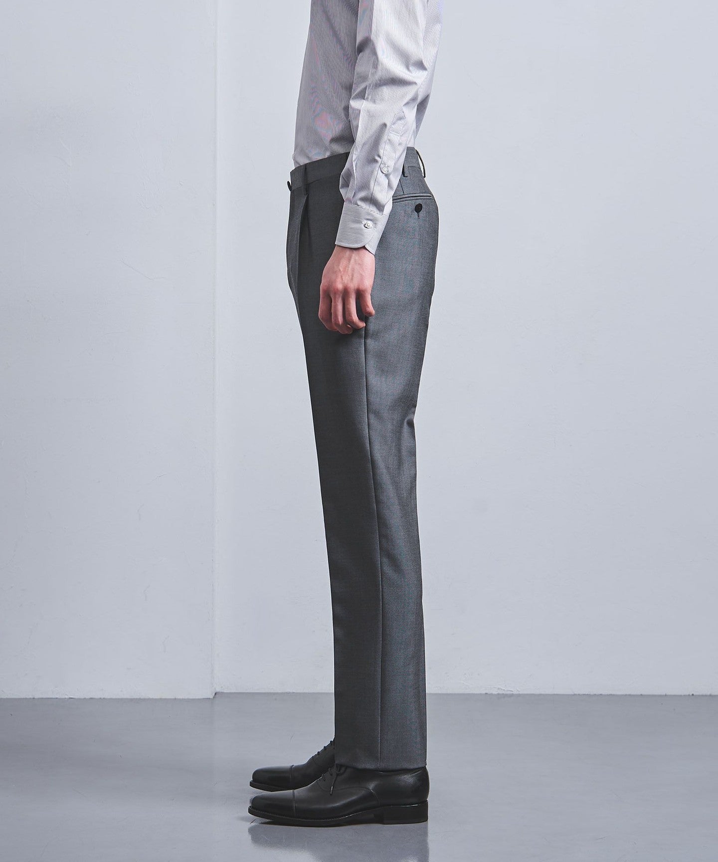 The pants have deep pleats and ample room around the waist, creating a tapered silhouette that balances well with the tailored jacket.