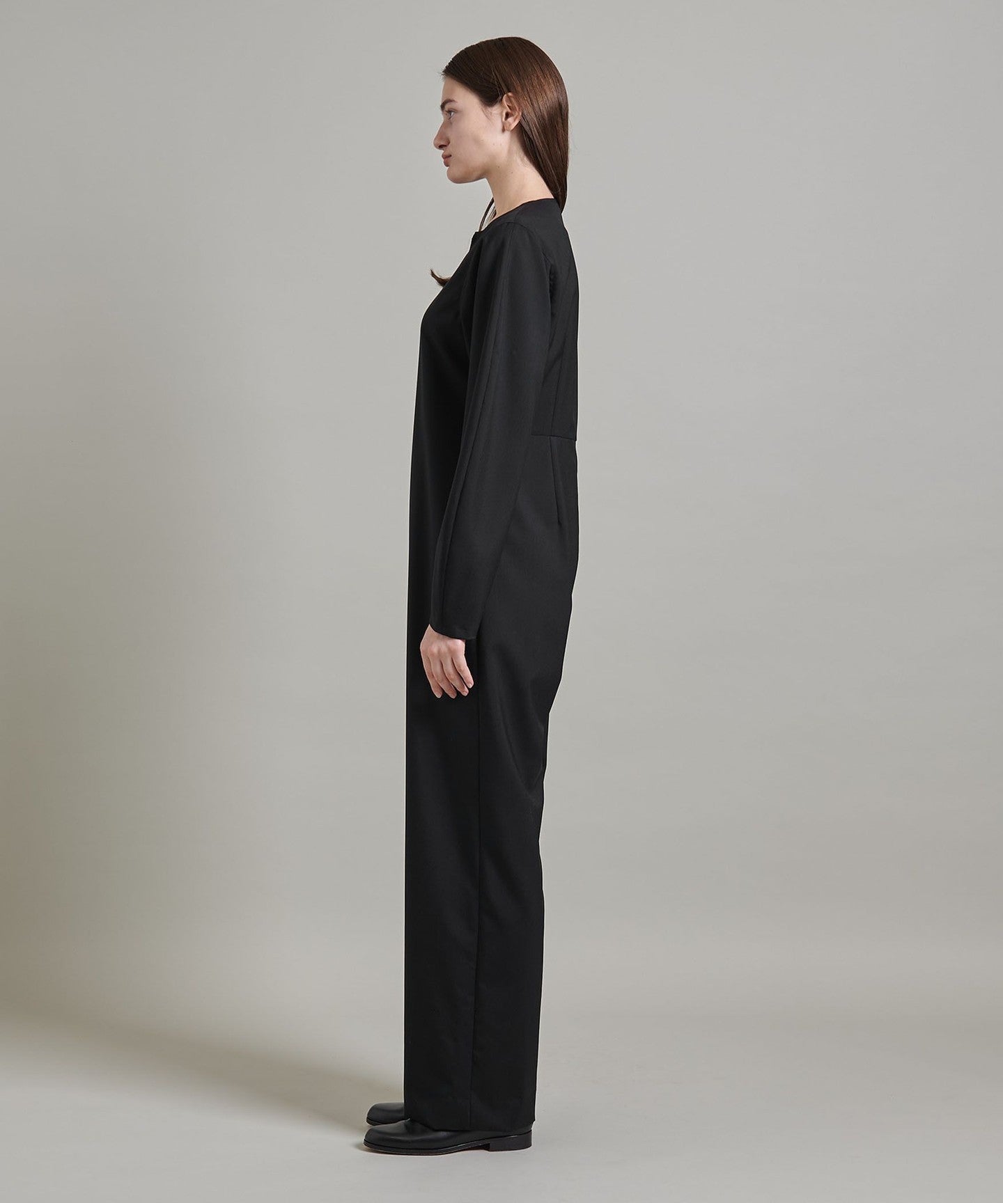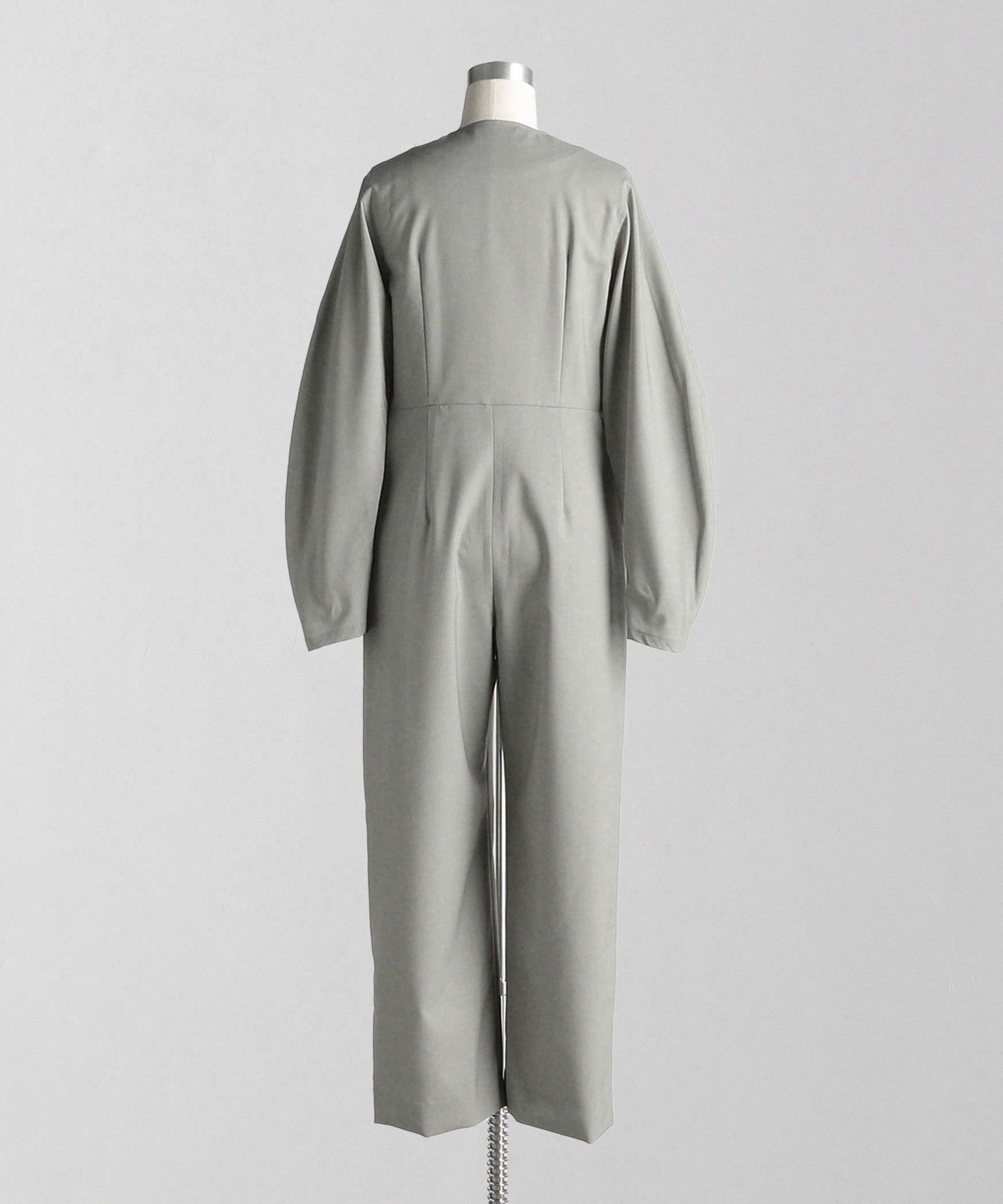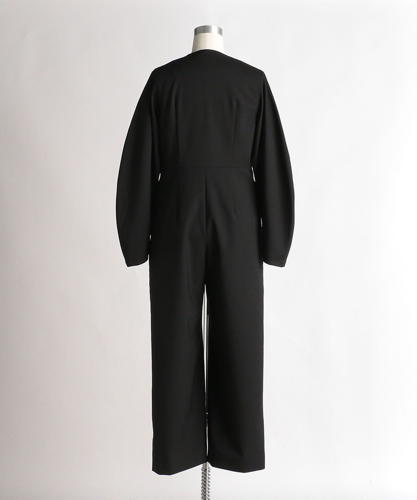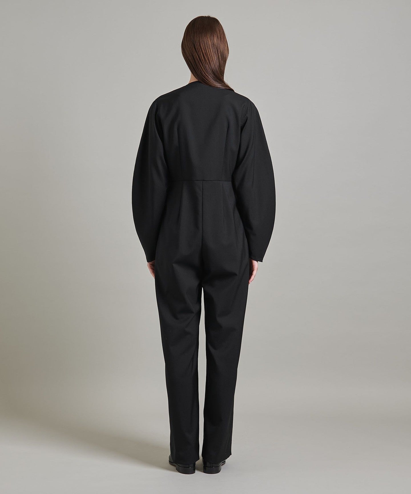 This all-in-one features a waist-shaped silhouette created by darts on the back, and rounded sleeves with flowing lines.
