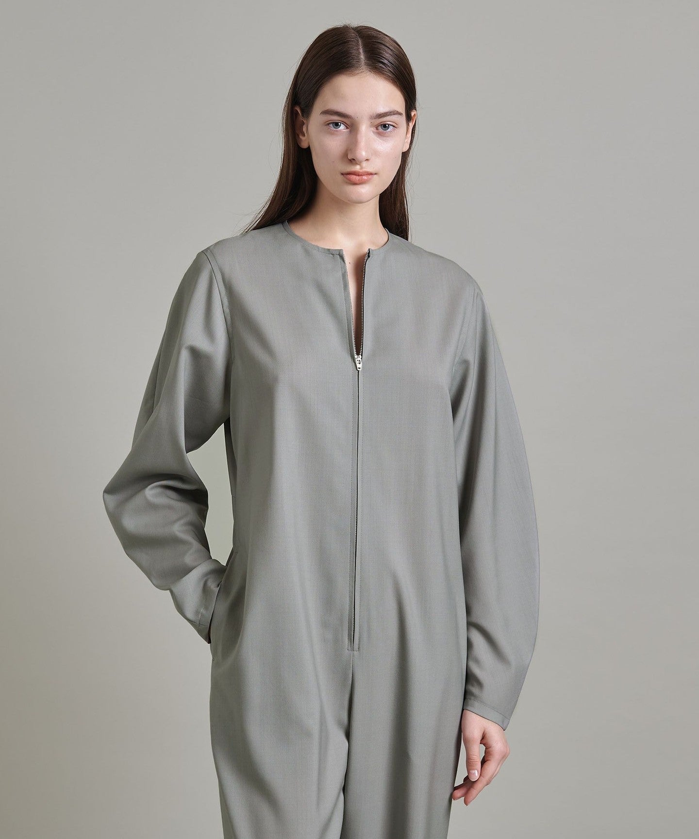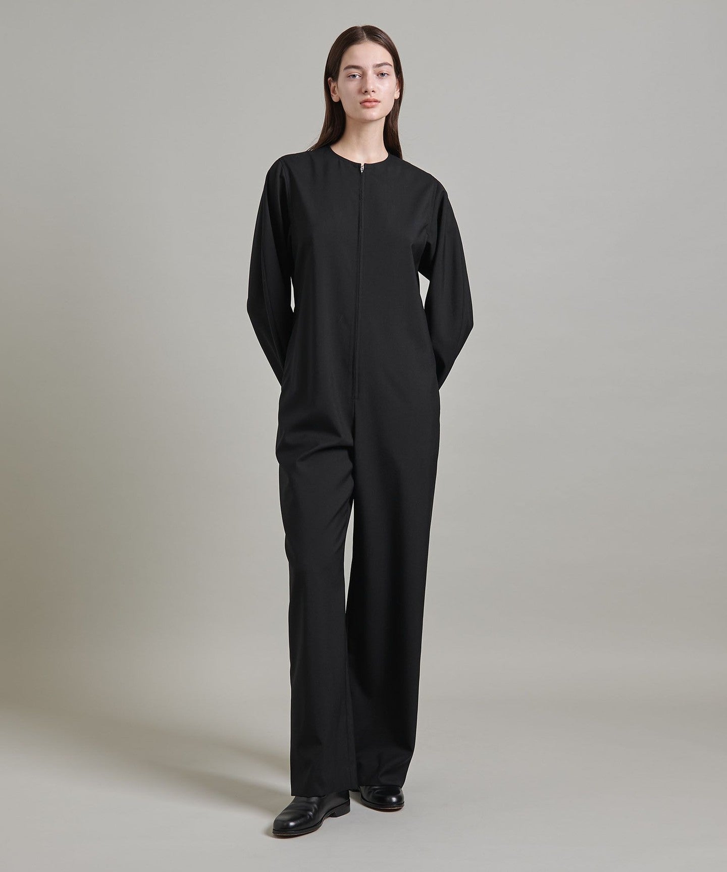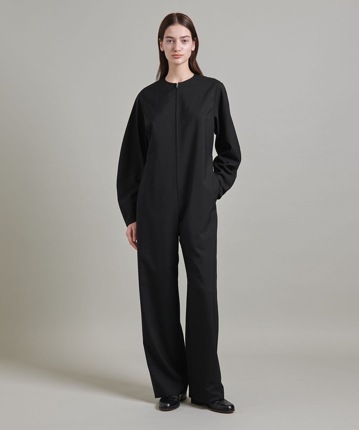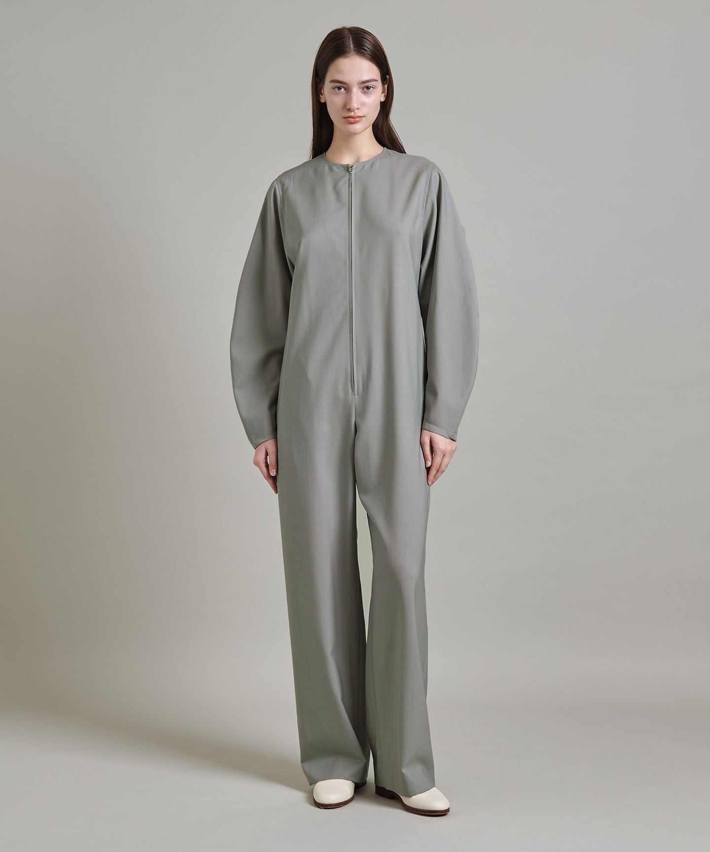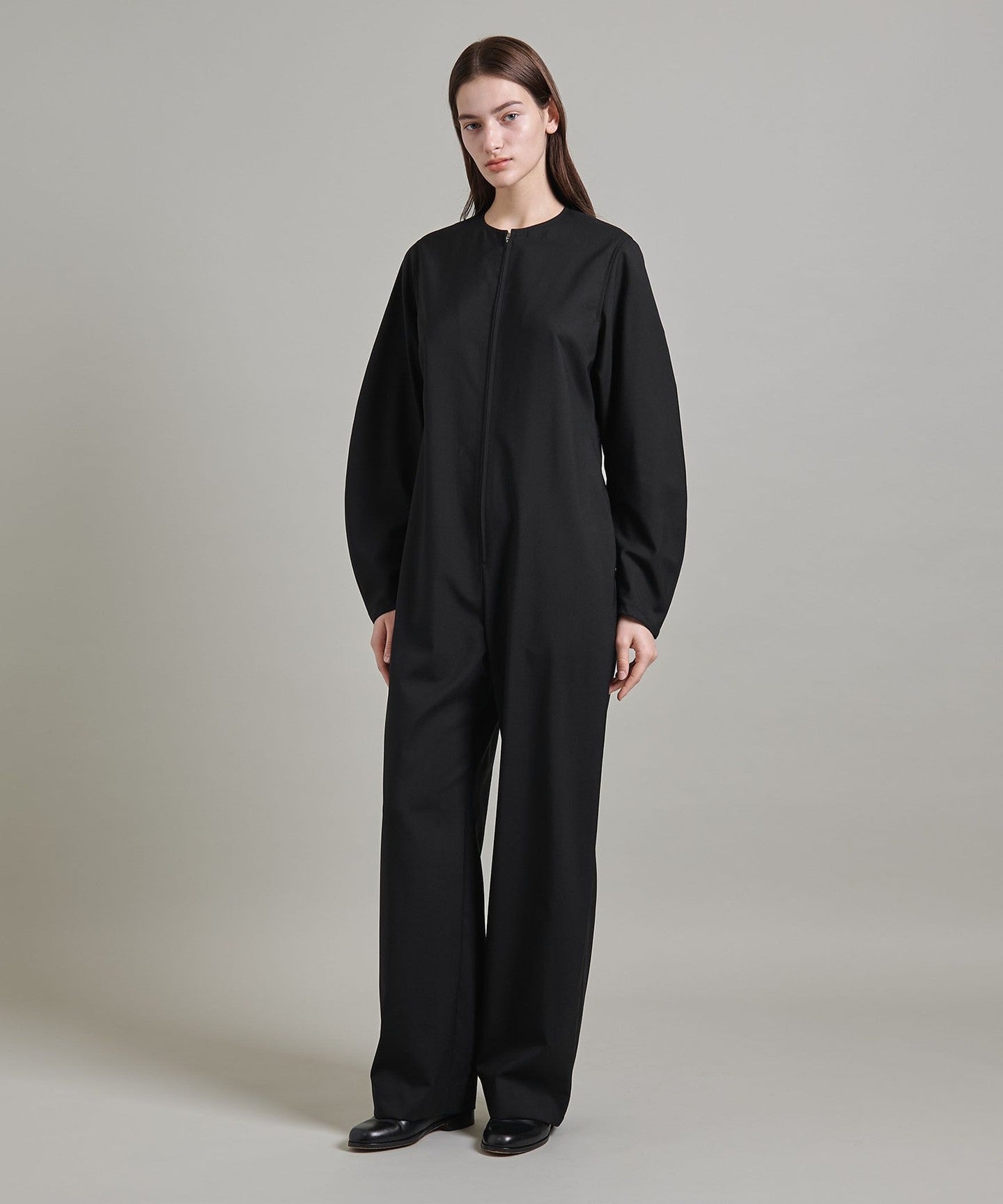 This all-in-one features a waist-shaped silhouette created by darts on the back, and rounded sleeves with flowing lines.