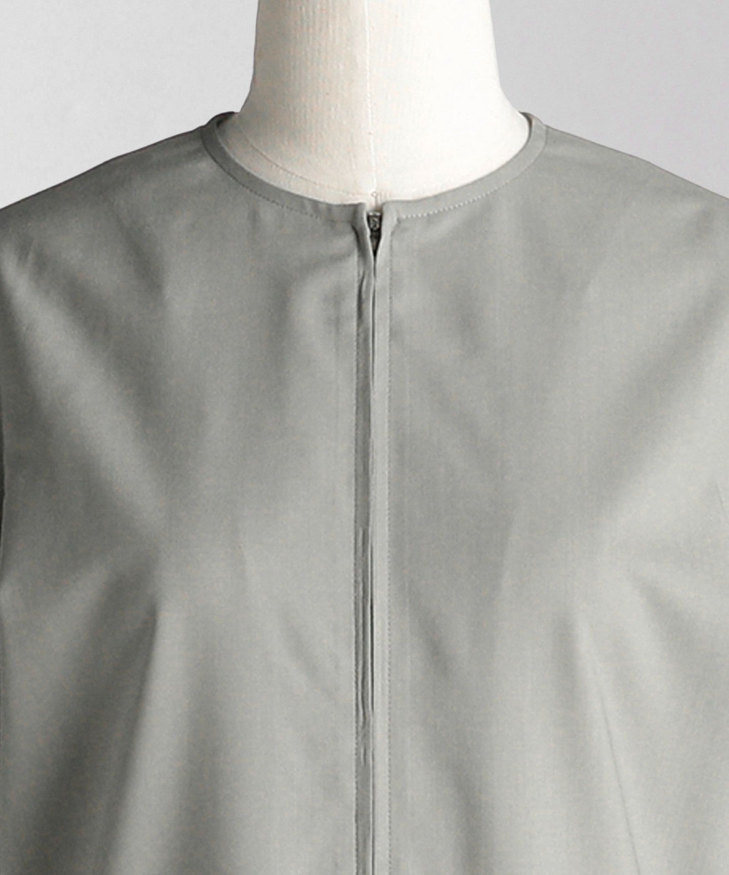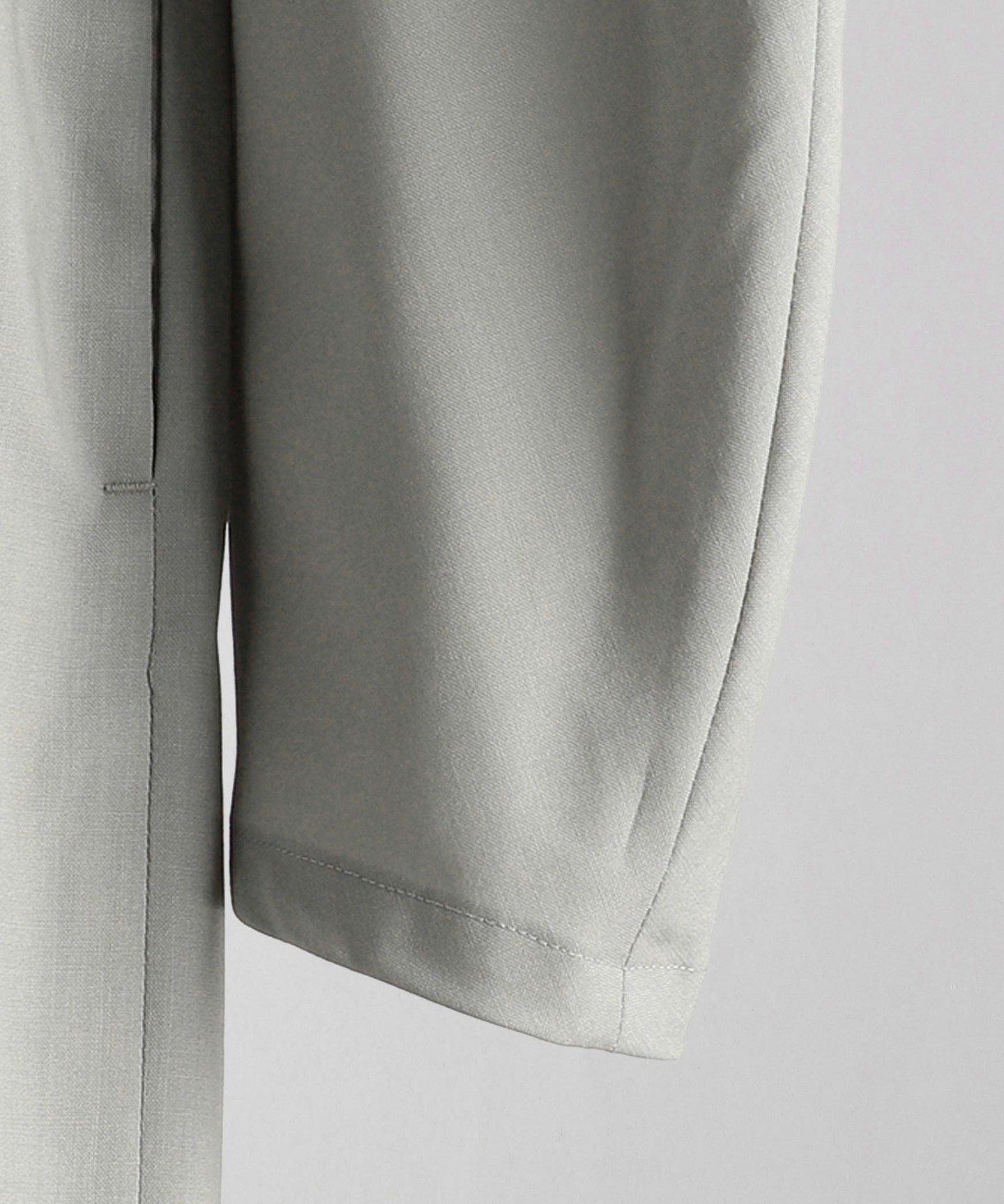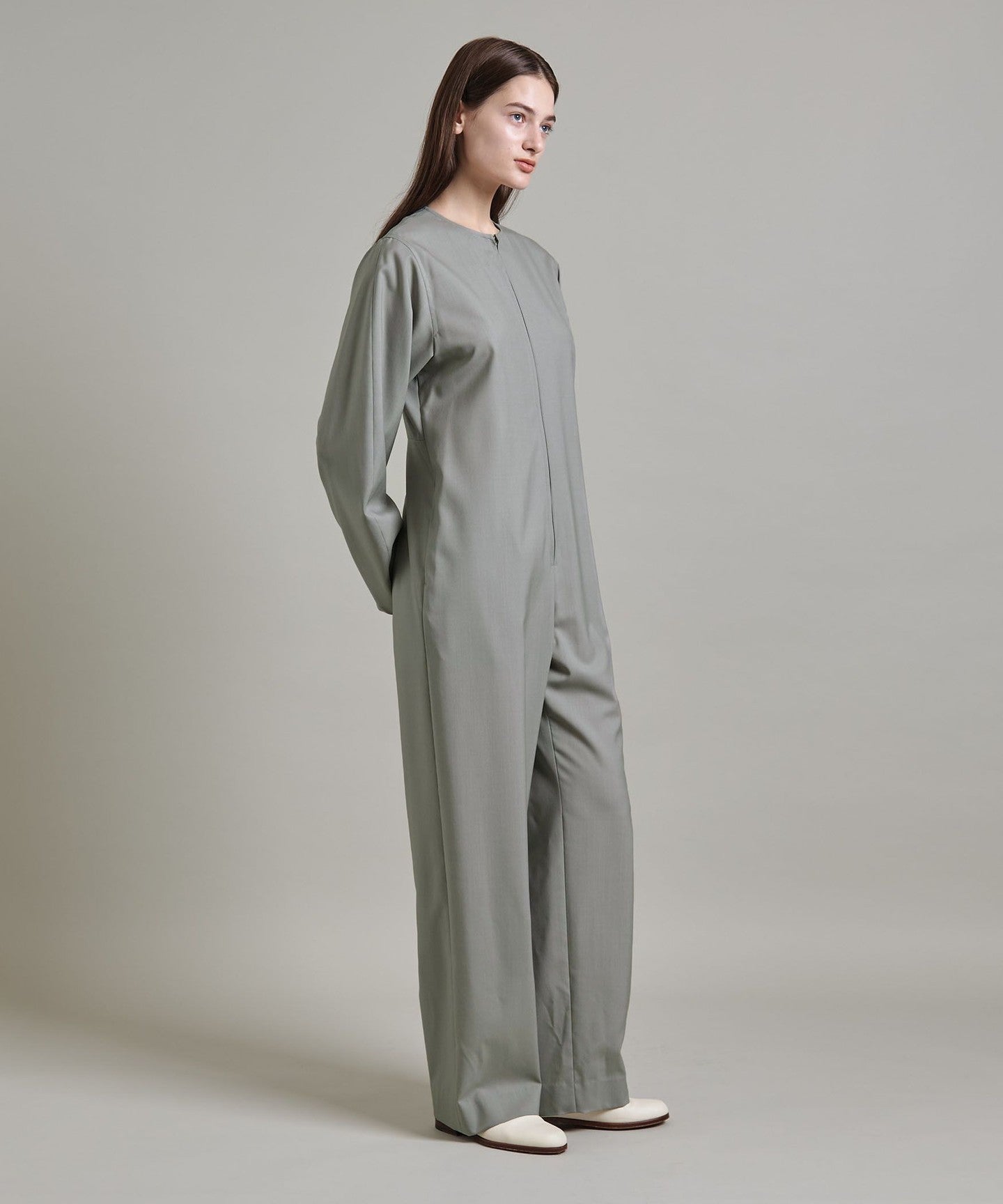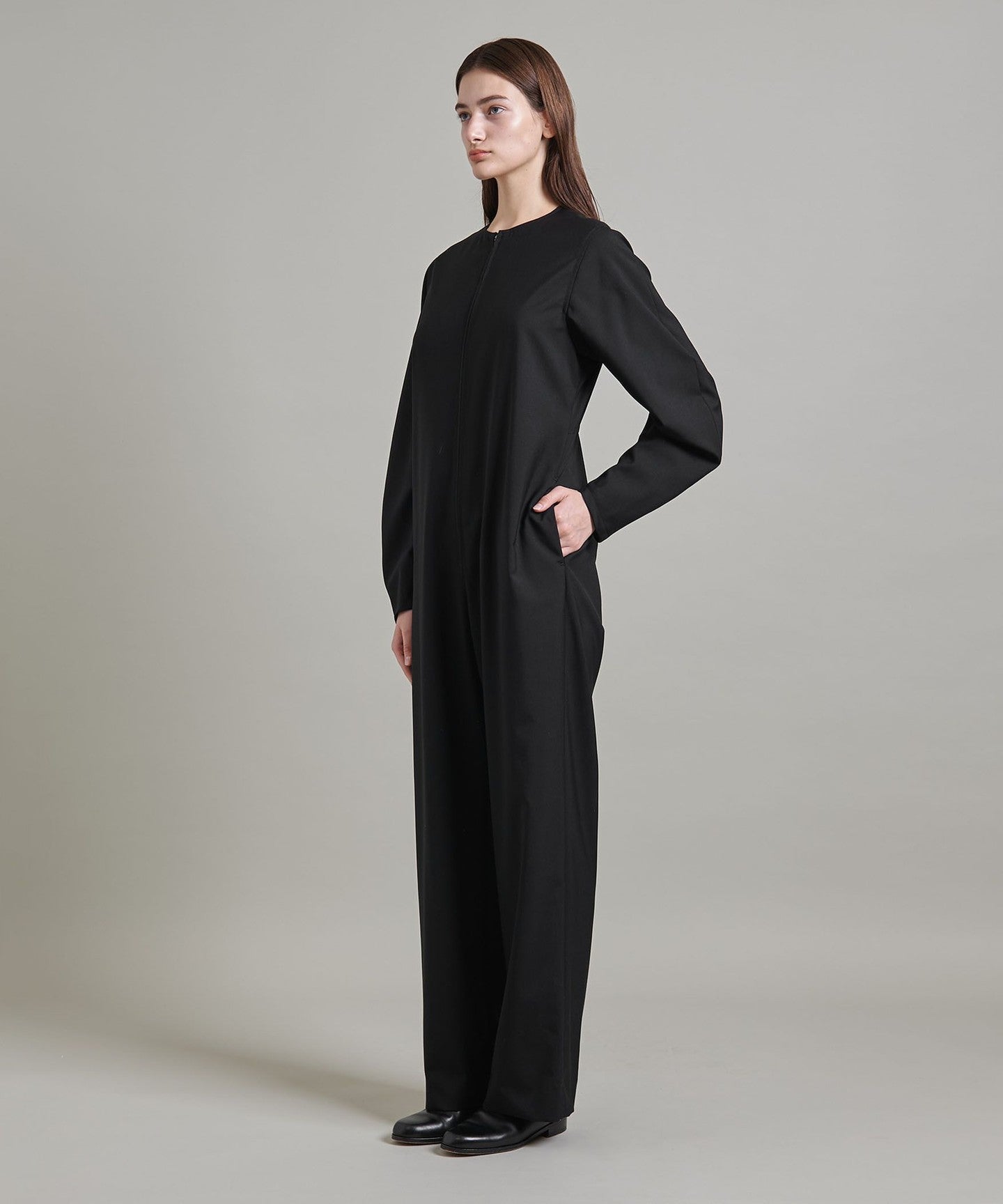 This all-in-one features a waist-shaped silhouette created by darts on the back, and rounded sleeves with flowing lines.