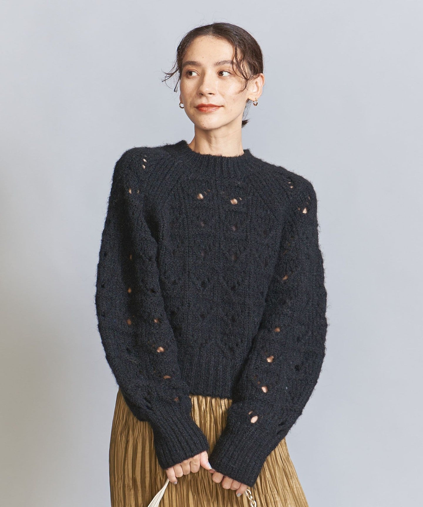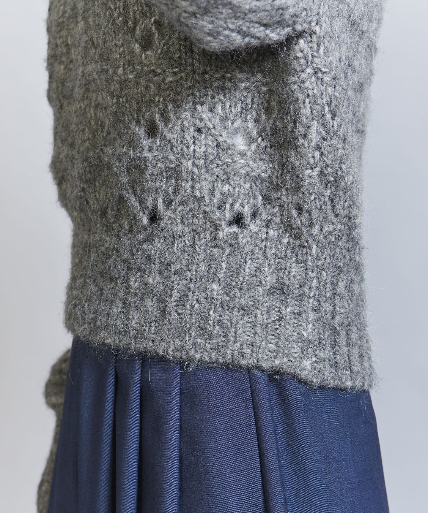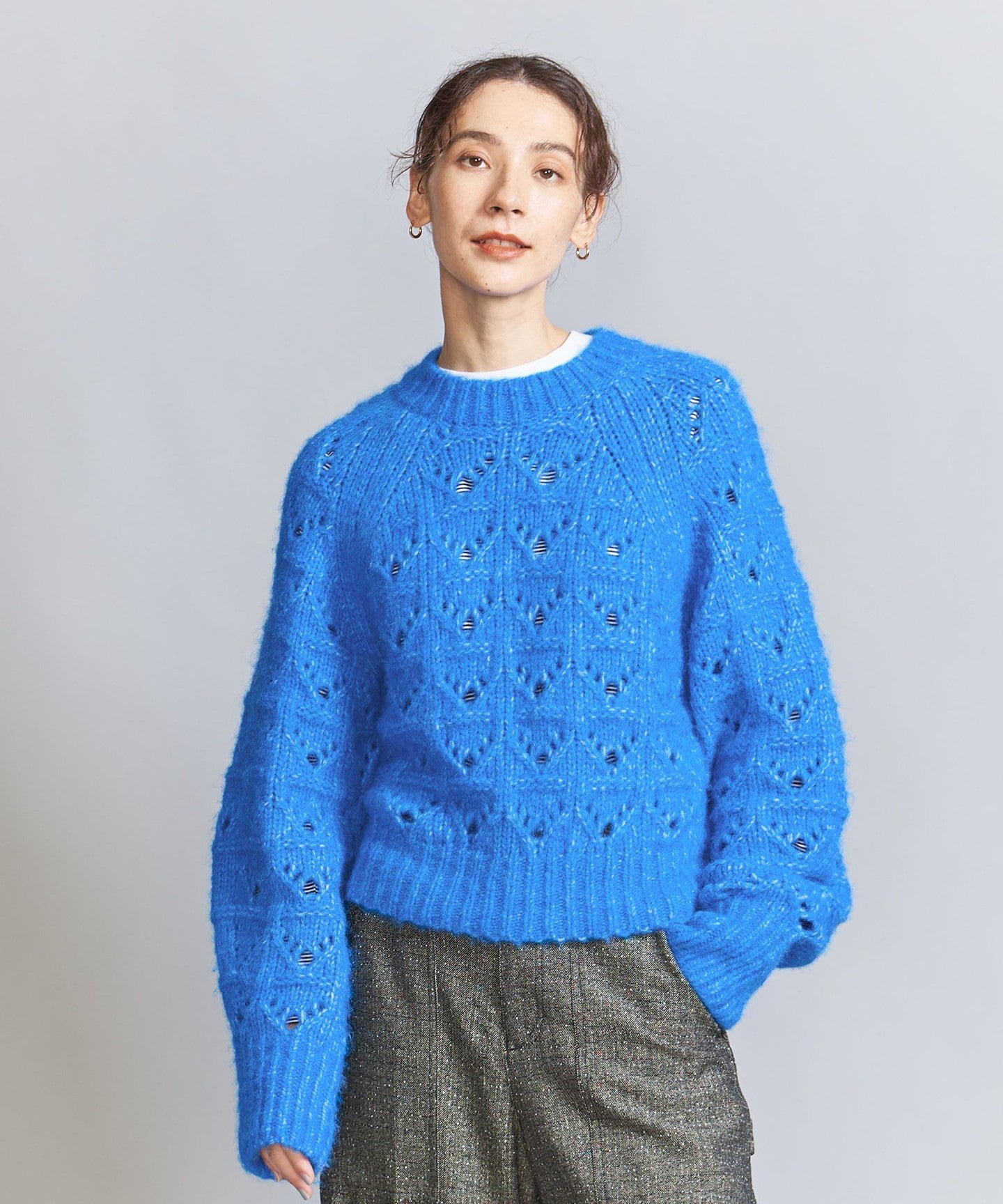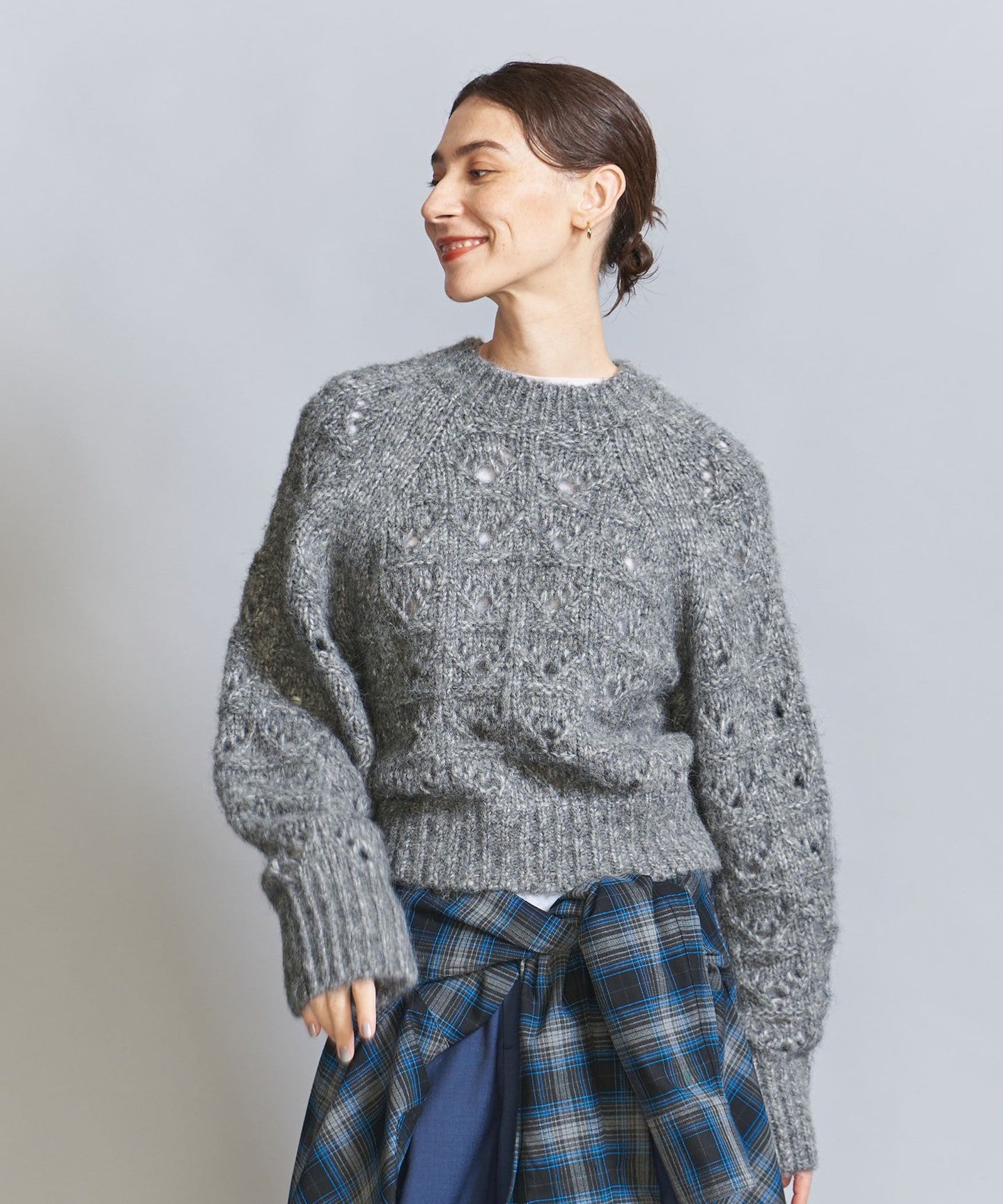 The design has a fluffy and warm surface and moderately sized stitches that create a trendy transparency, enhancing the trendy mood.