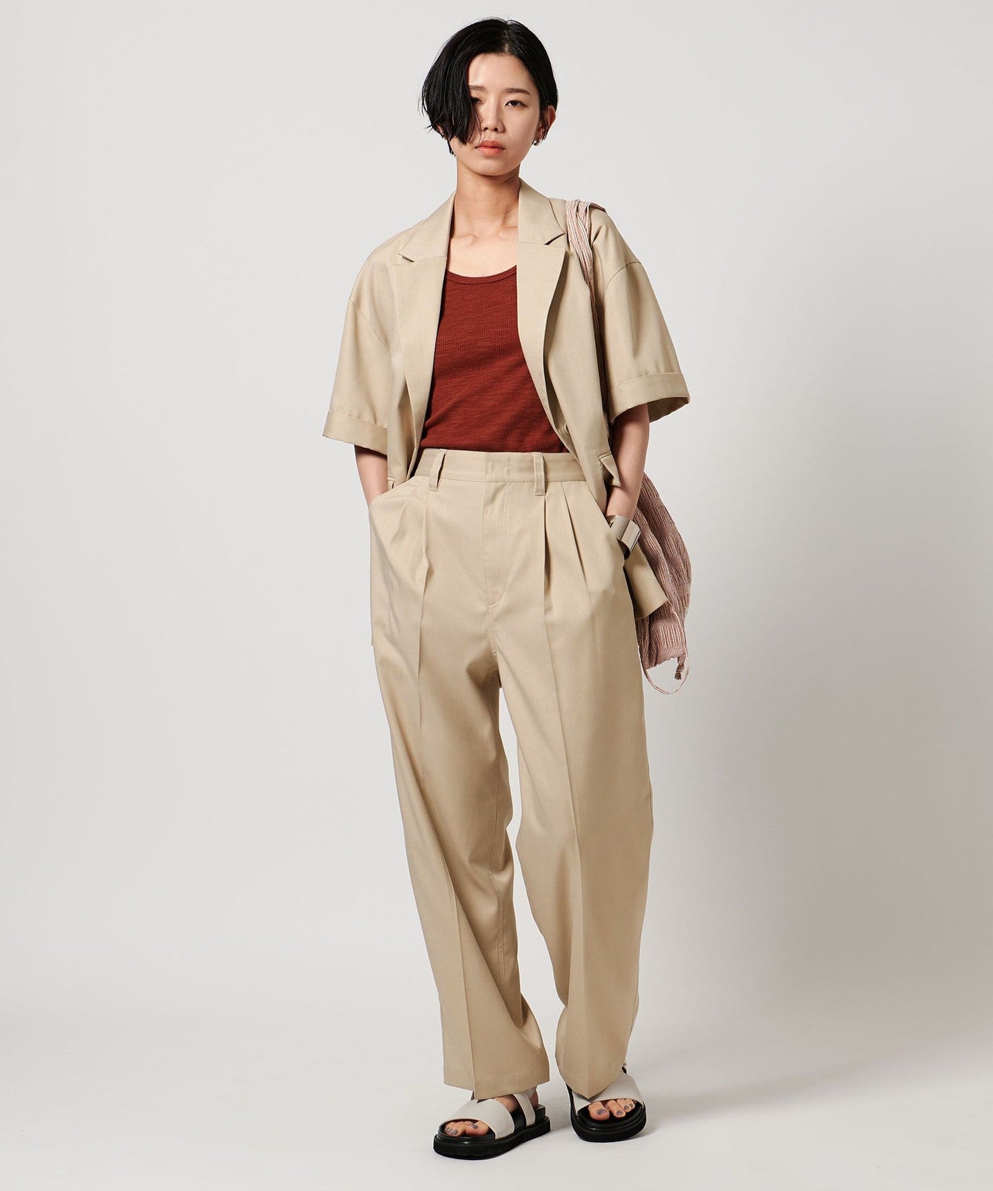 It can also be worn as a set with slacks made of the same material.