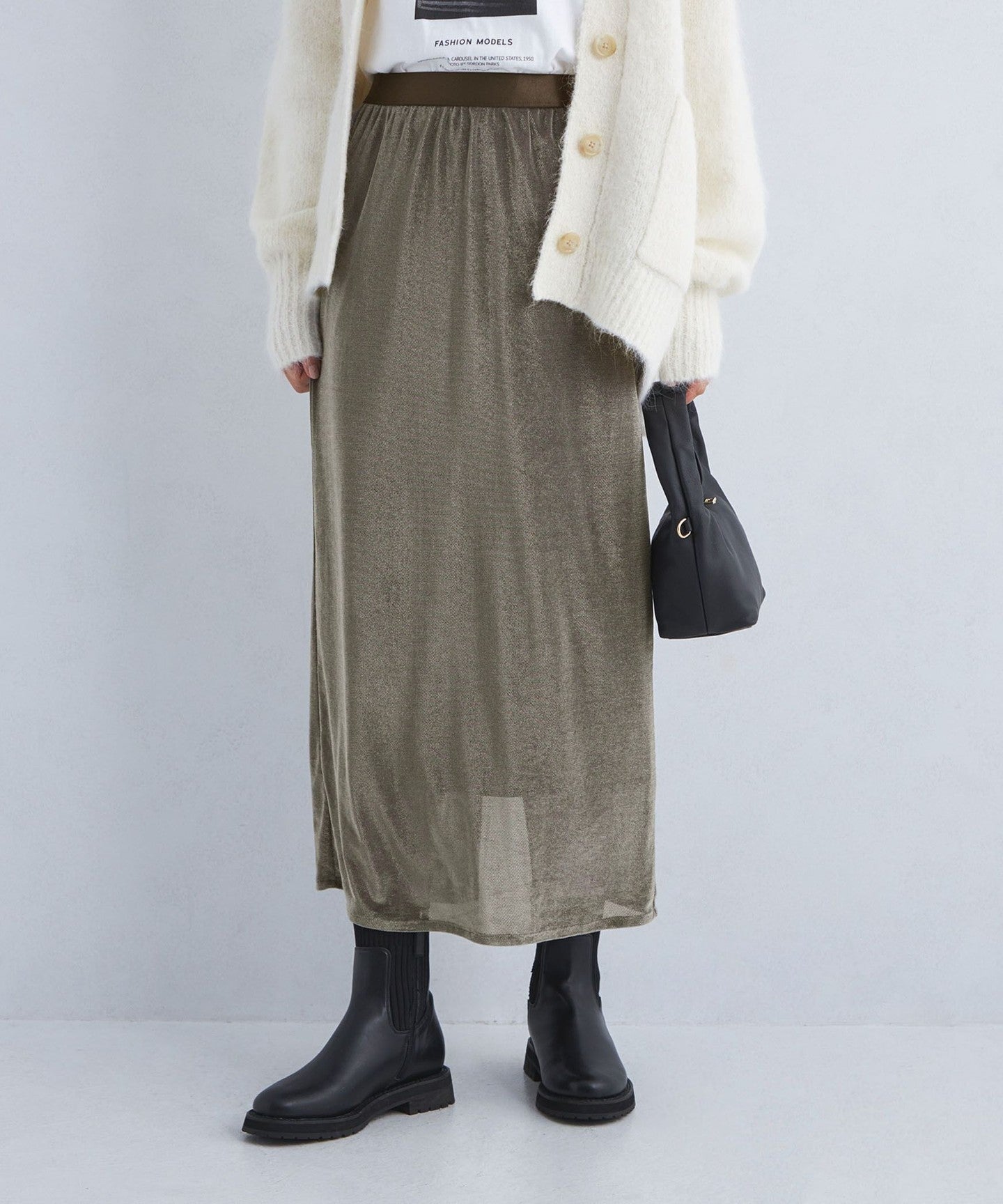 A long skirt with a moderate sheen that gives it an elegant impression