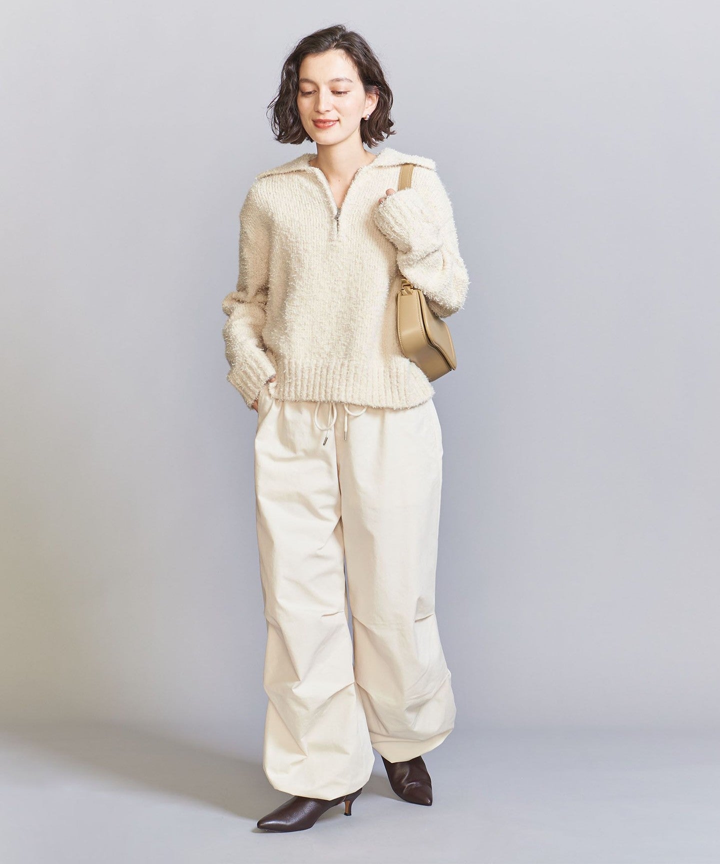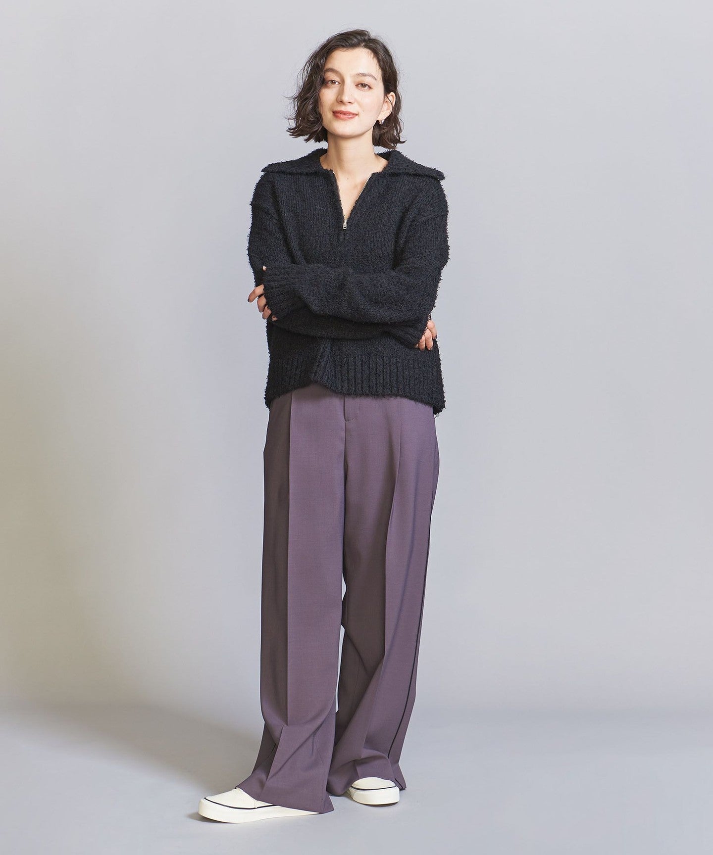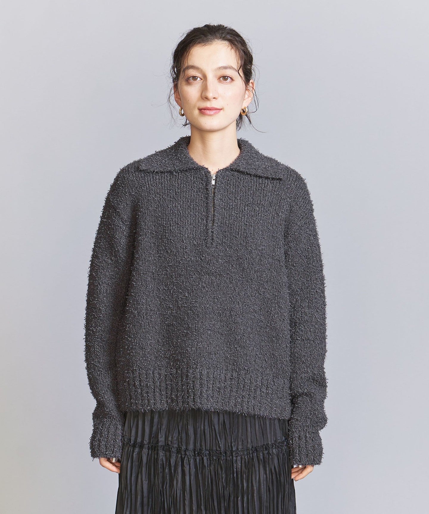 EXTERIOR This piece makes the most of the rich texture of the material and is finished with a simple half-zip design.