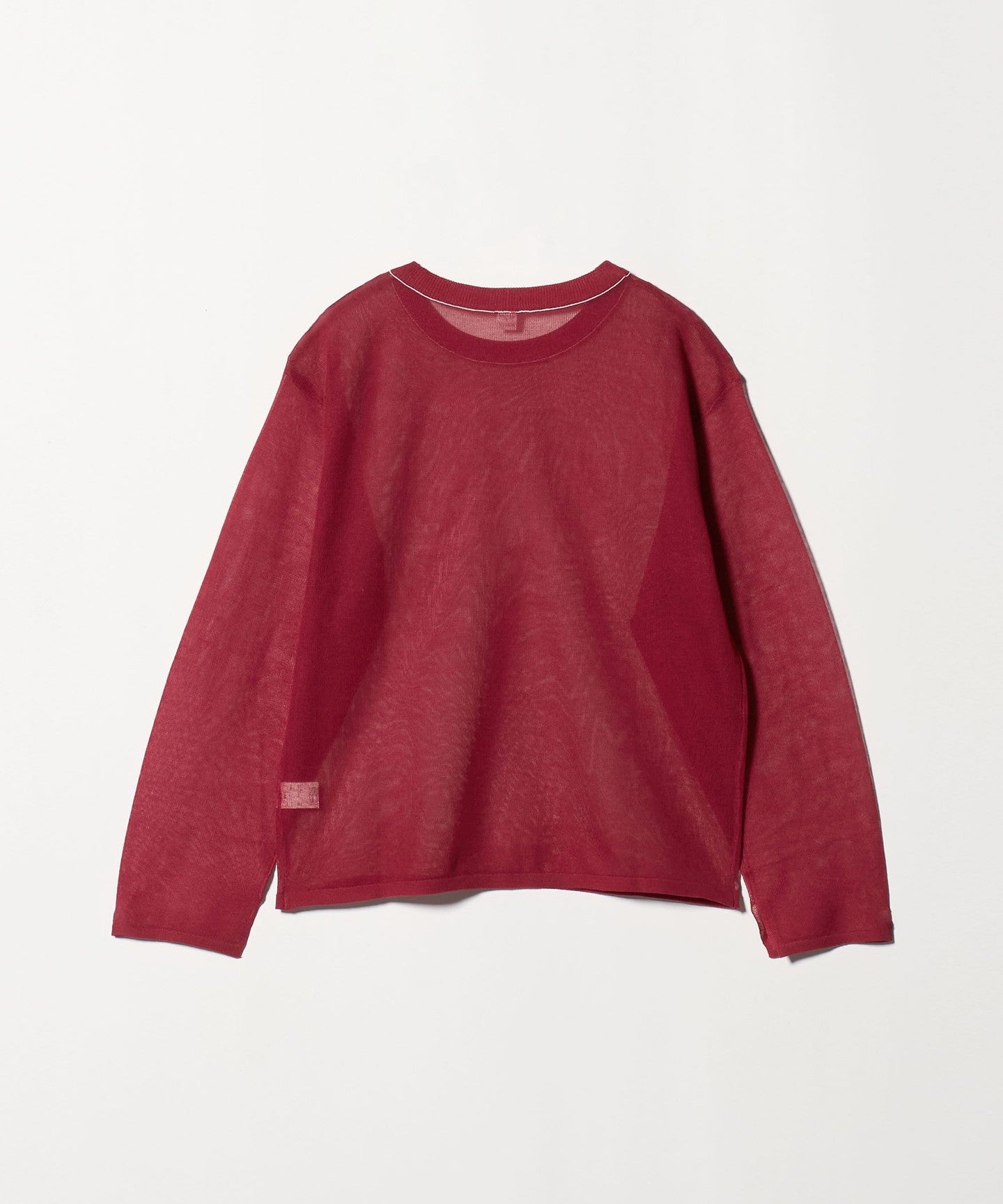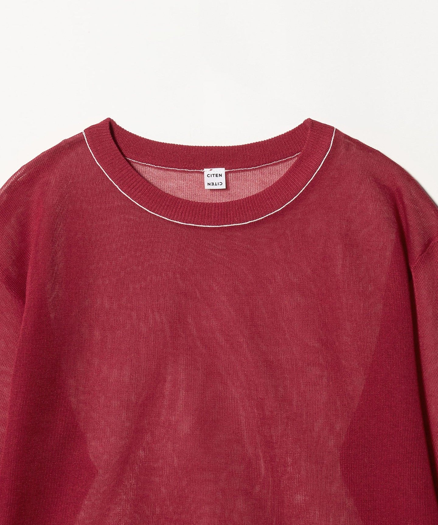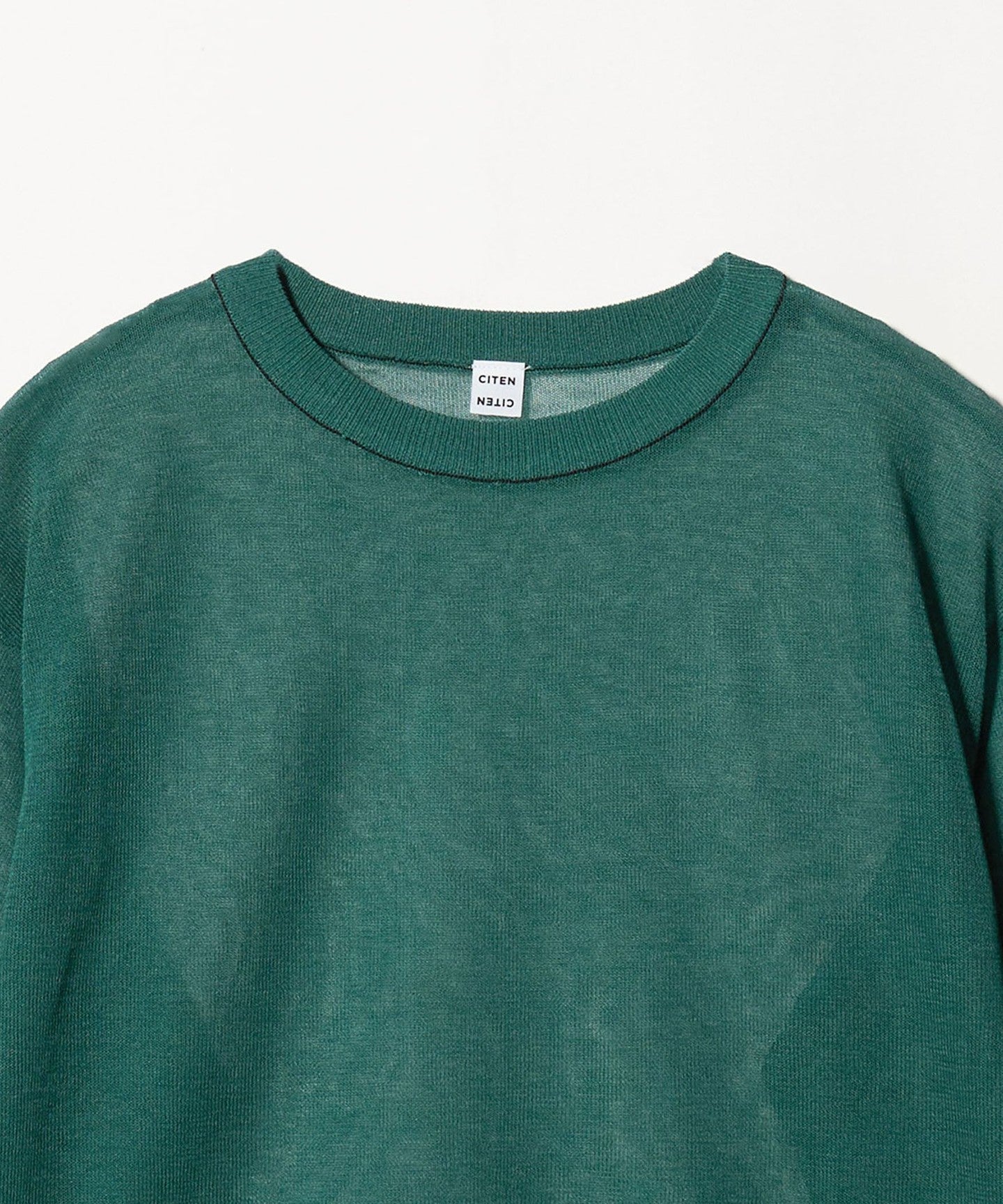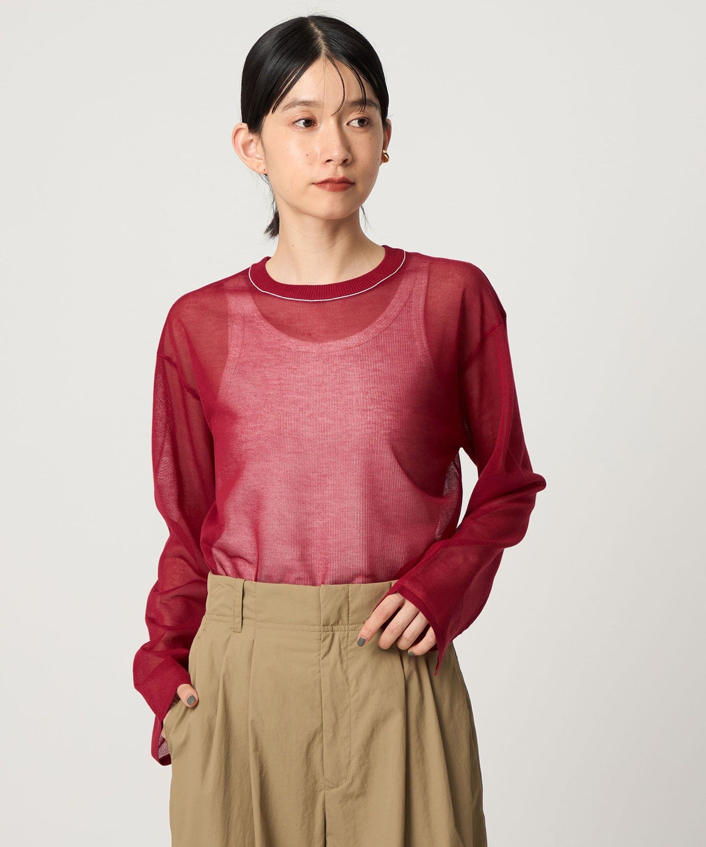 This piece has a feminine, relaxed silhouette and a well-balanced crew neck, and the subtle color-coordinated lines on the neck add an accent.