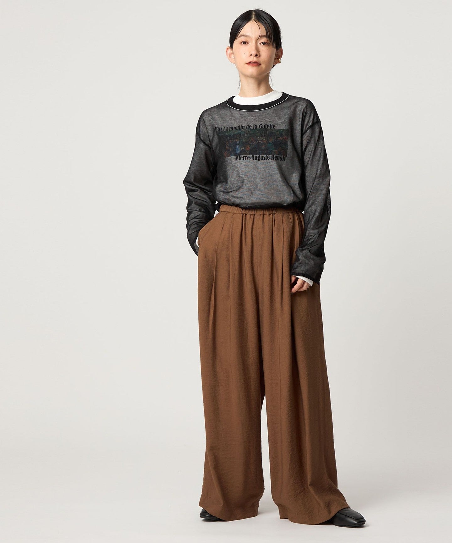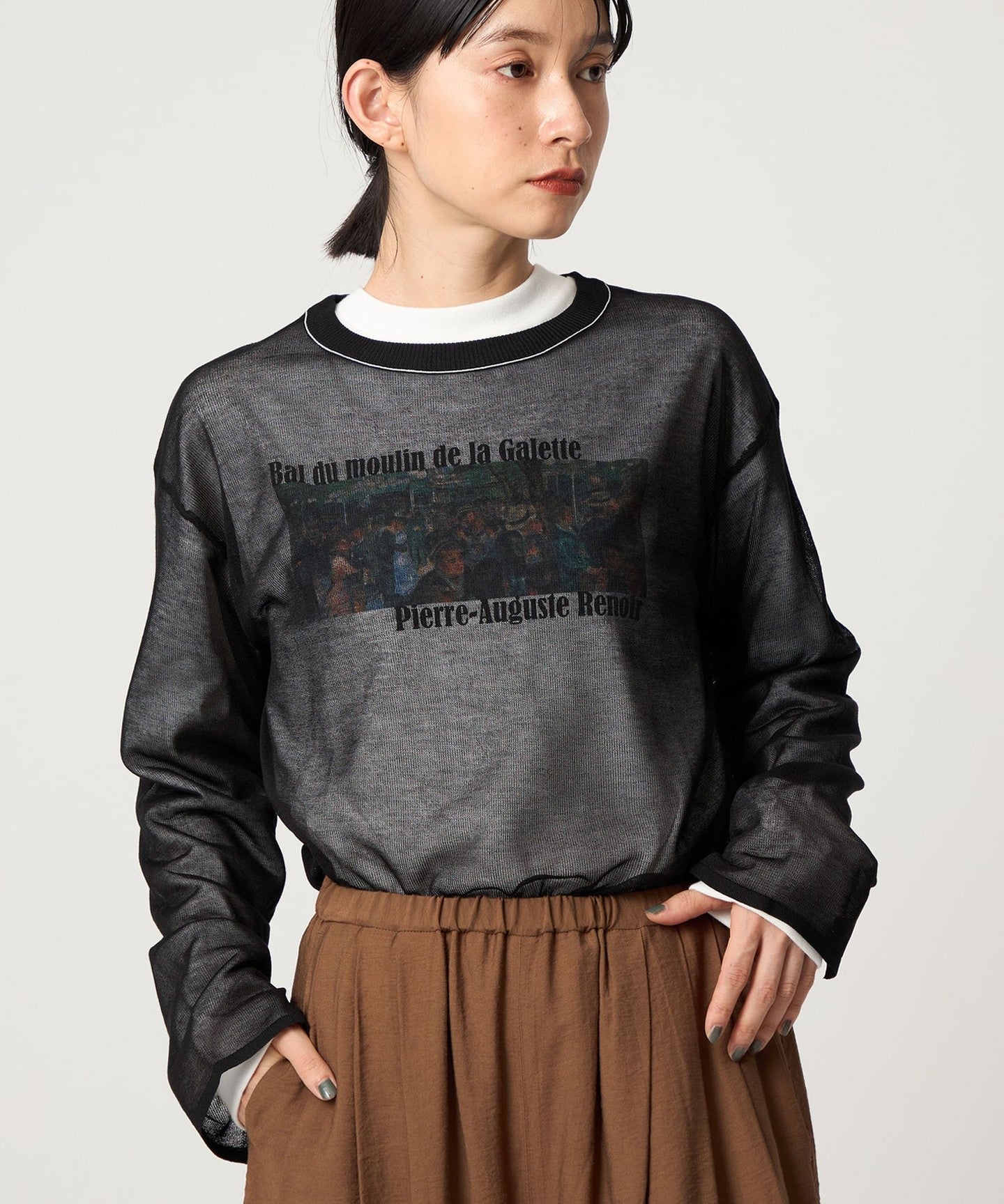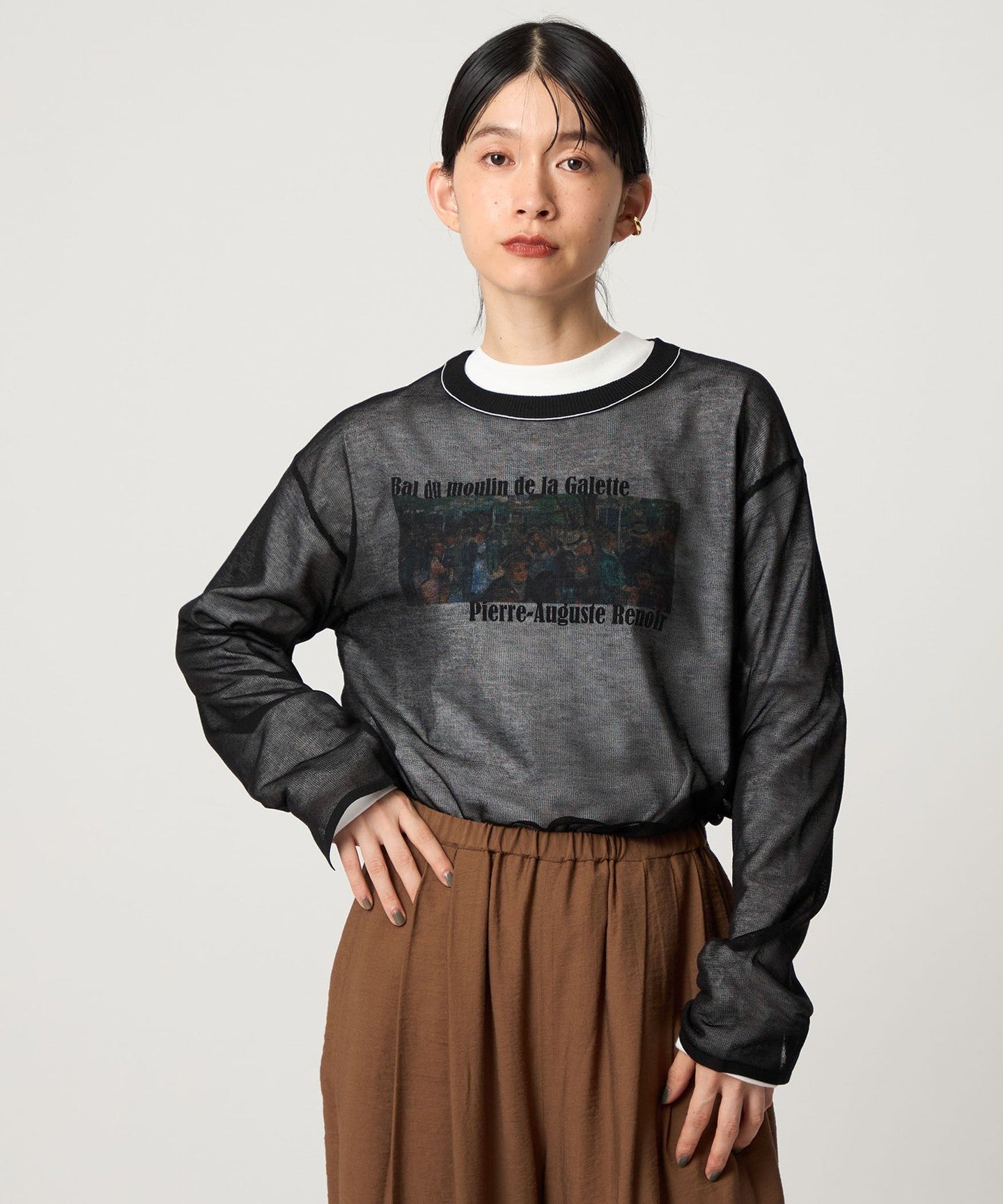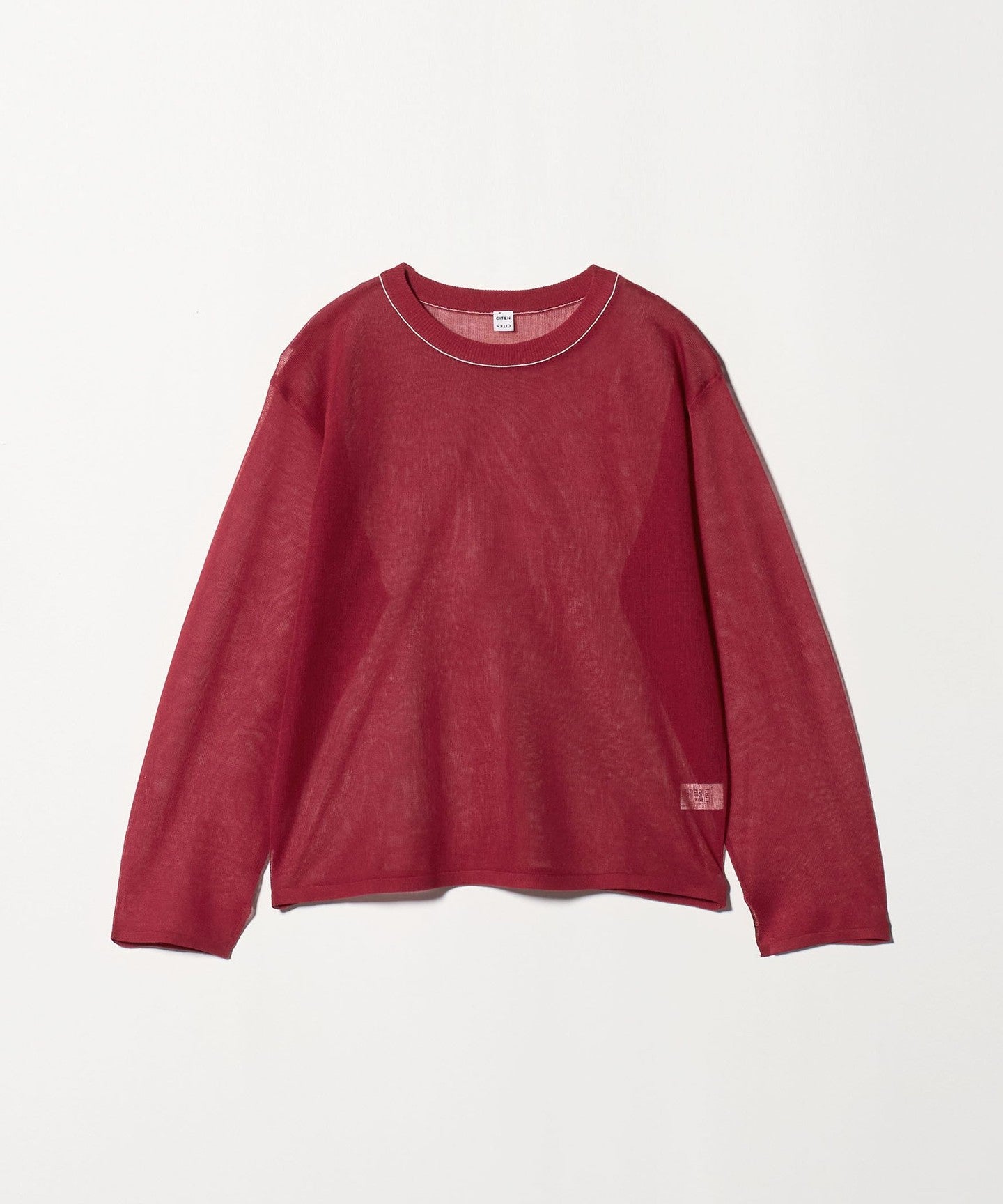 This piece has a feminine, relaxed silhouette and a well-balanced crew neck, and the subtle color-coordinated lines on the neck add an accent.