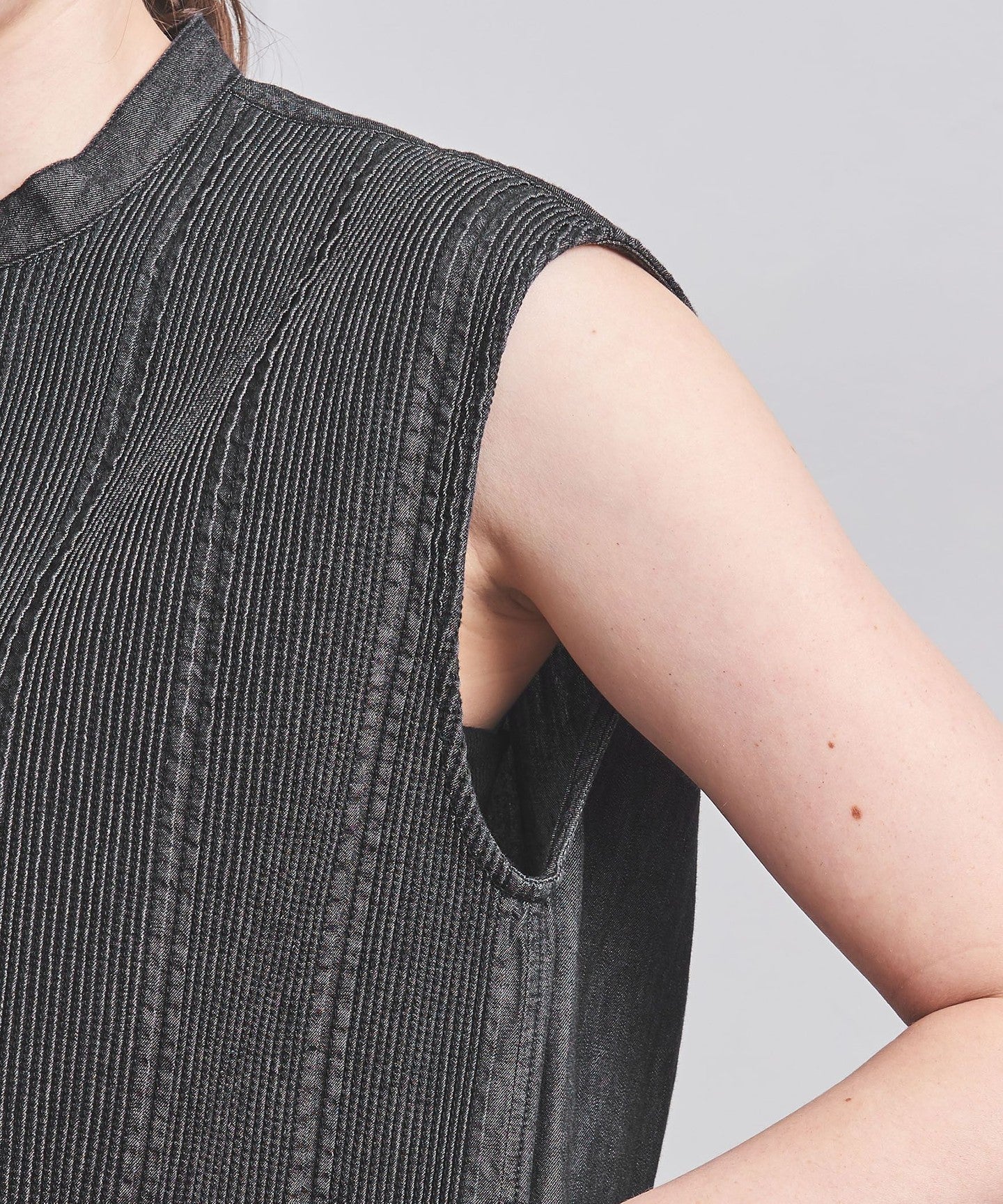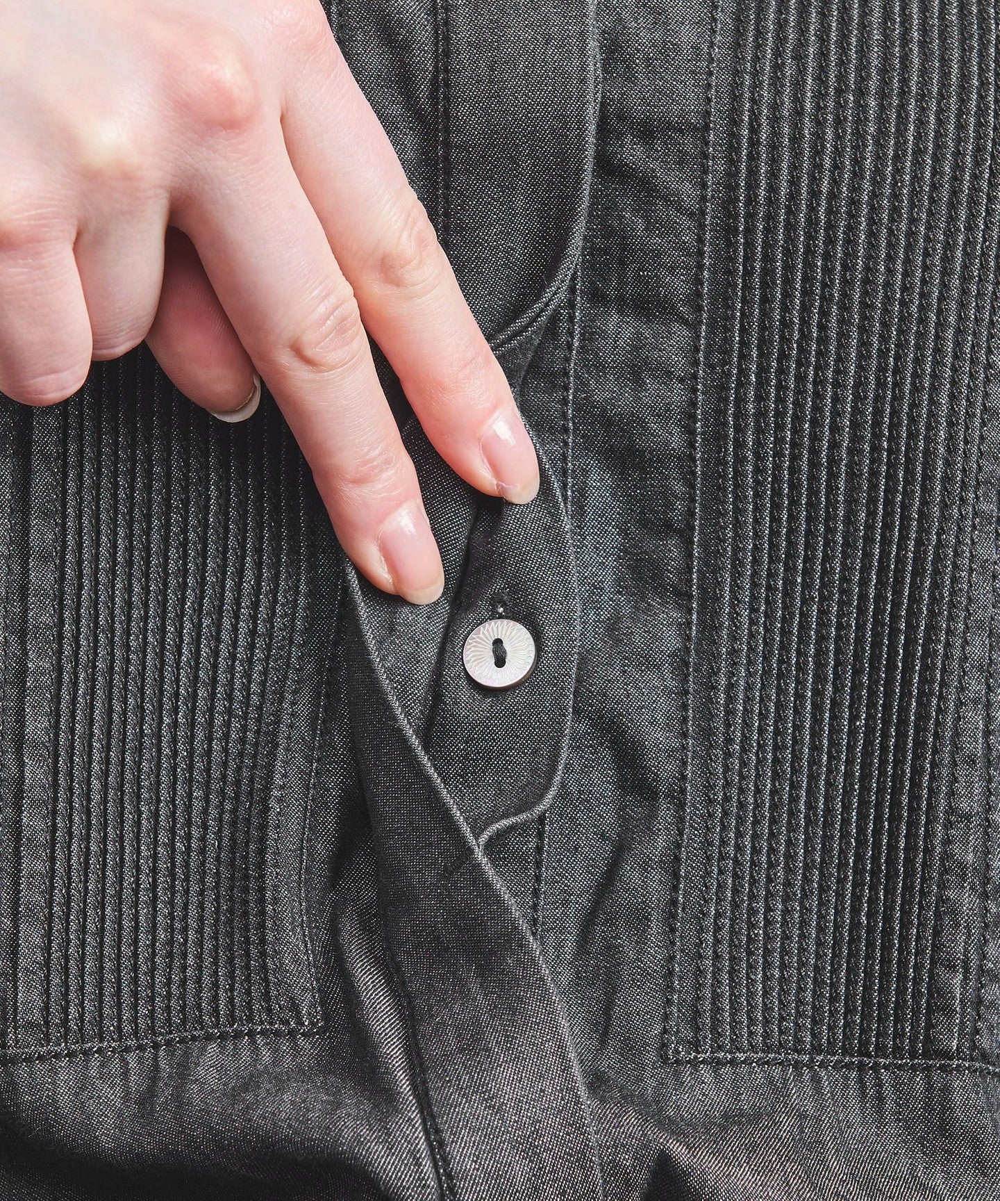 "Trinity" is a series that incorporates men's formal bustle shirts with contrasting fabrics around the chest into women's everyday wear.