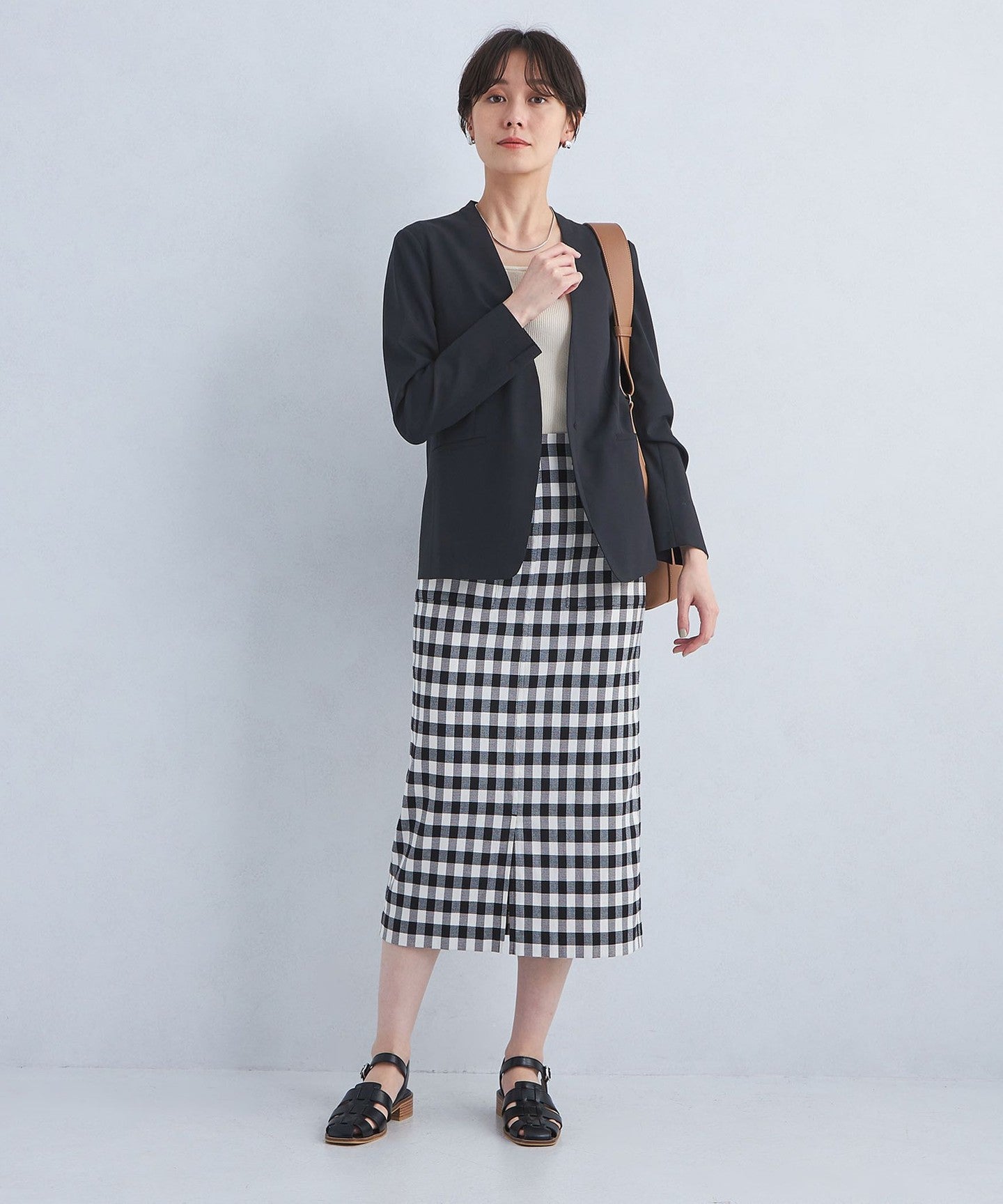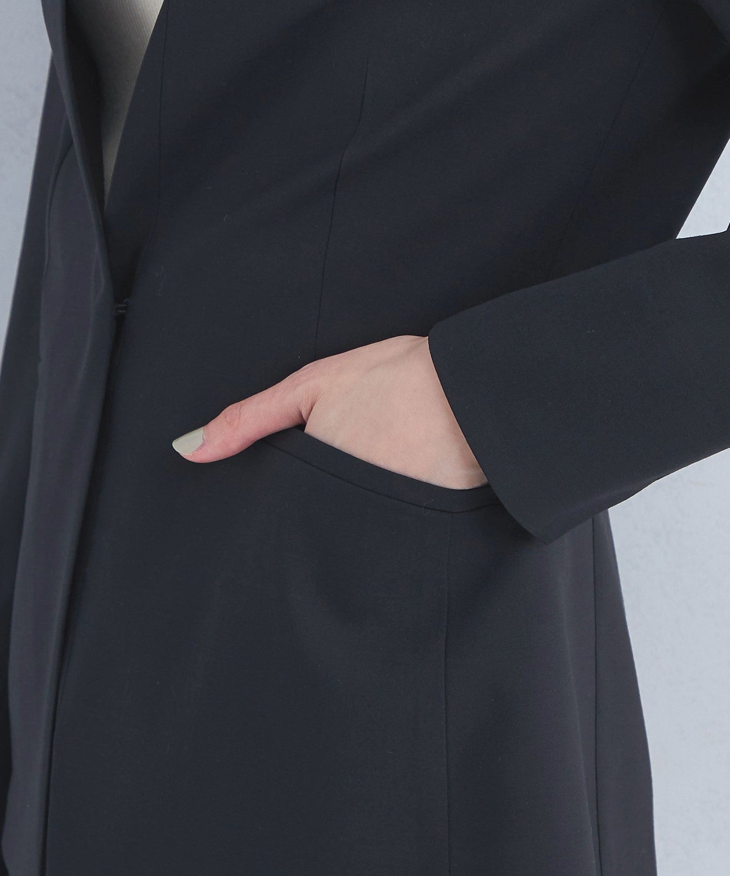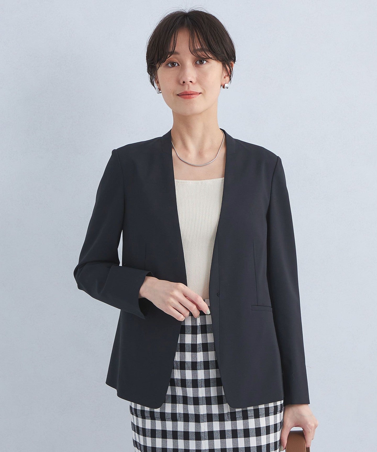 This no-lapel jacket has a clean, unadorned design that makes it easy to mix and match.