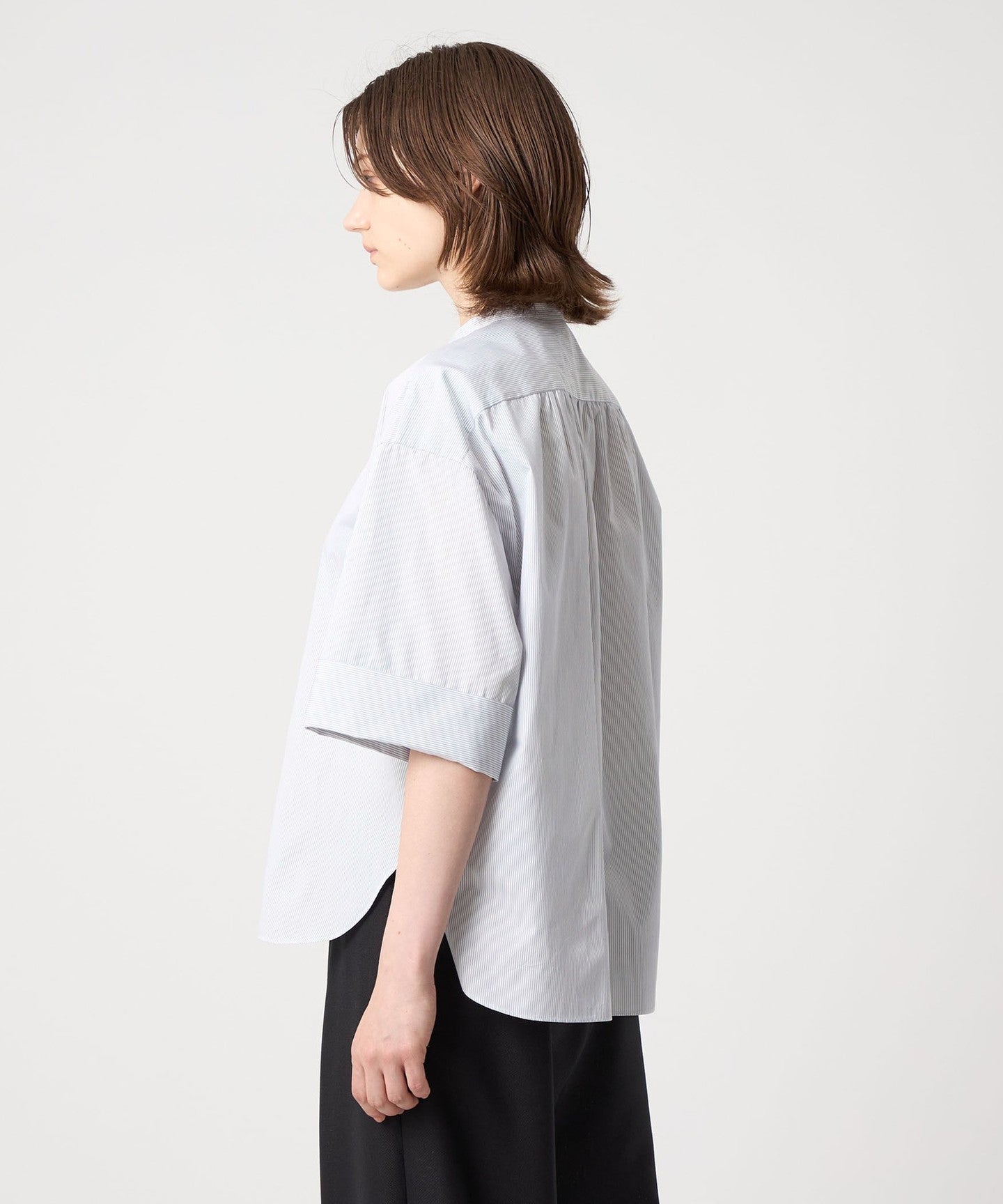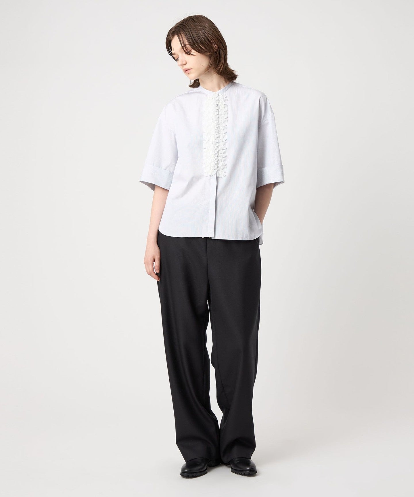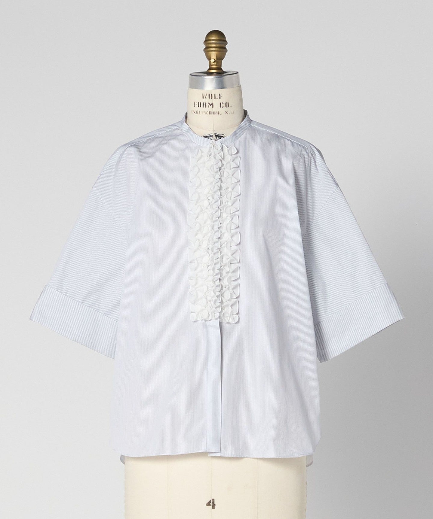 This short-sleeved shirt features a shirt body with a round hem and back yoke, and a ruffle motif on the front to add a touch of elegance.
