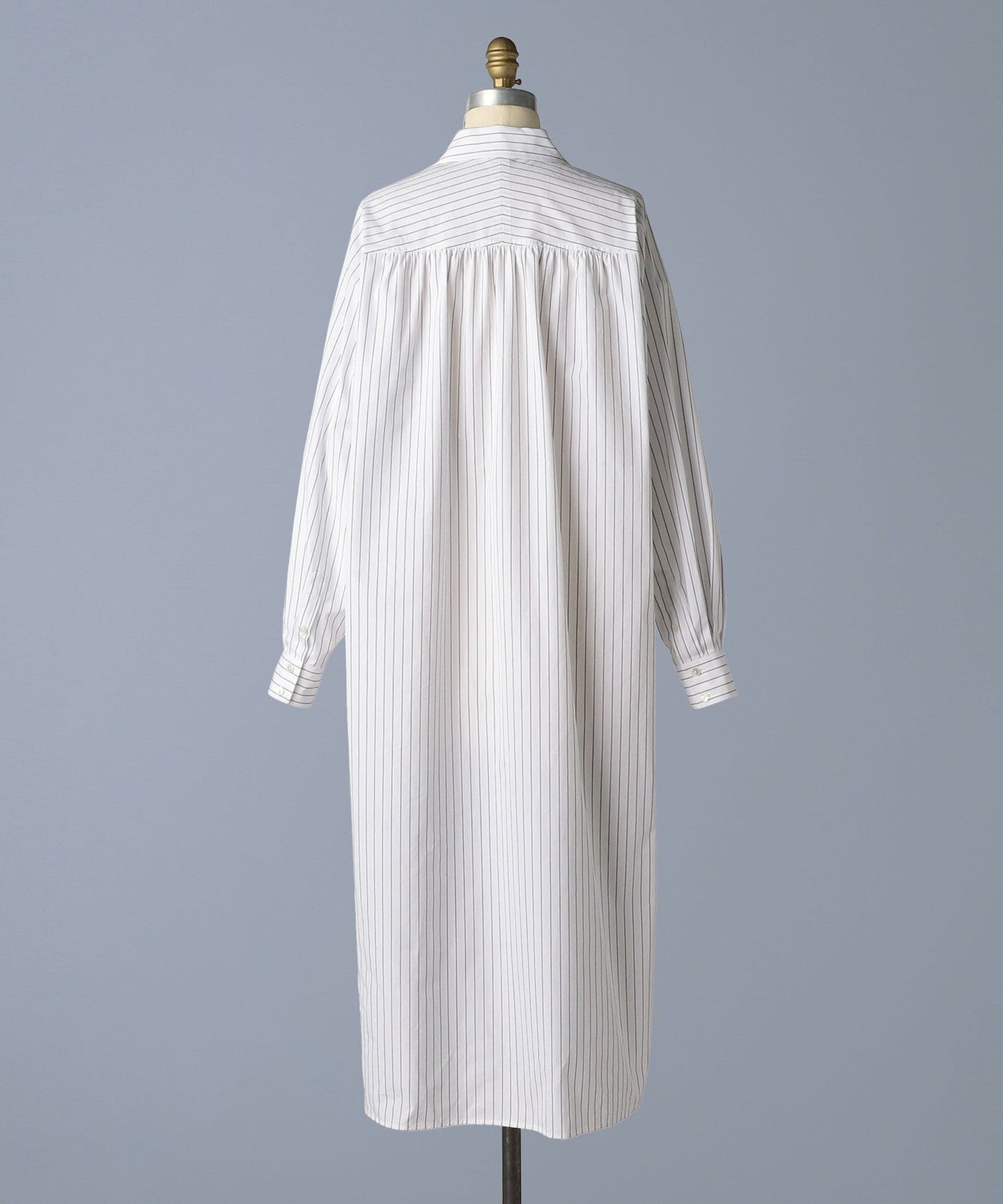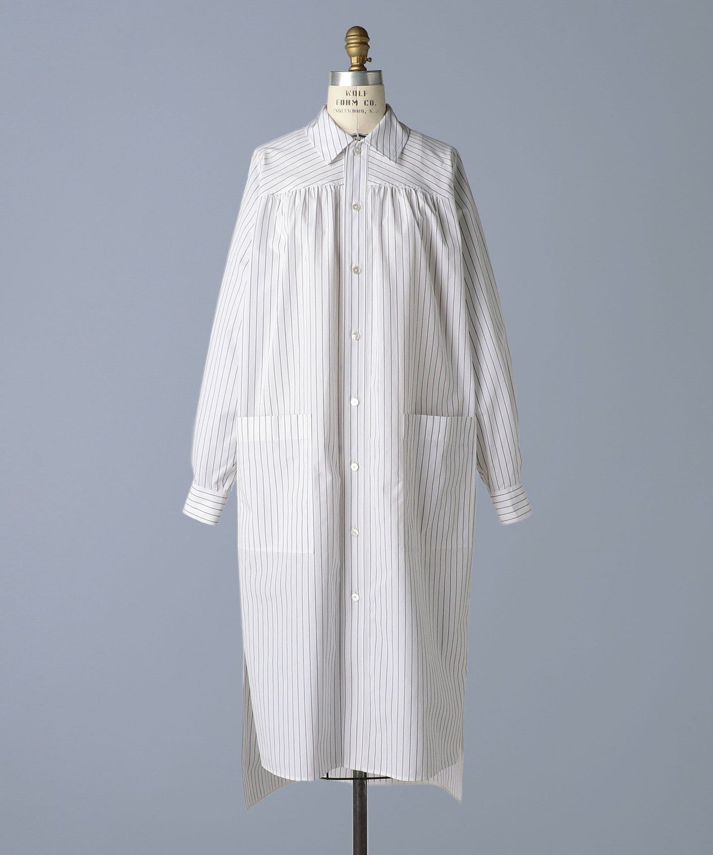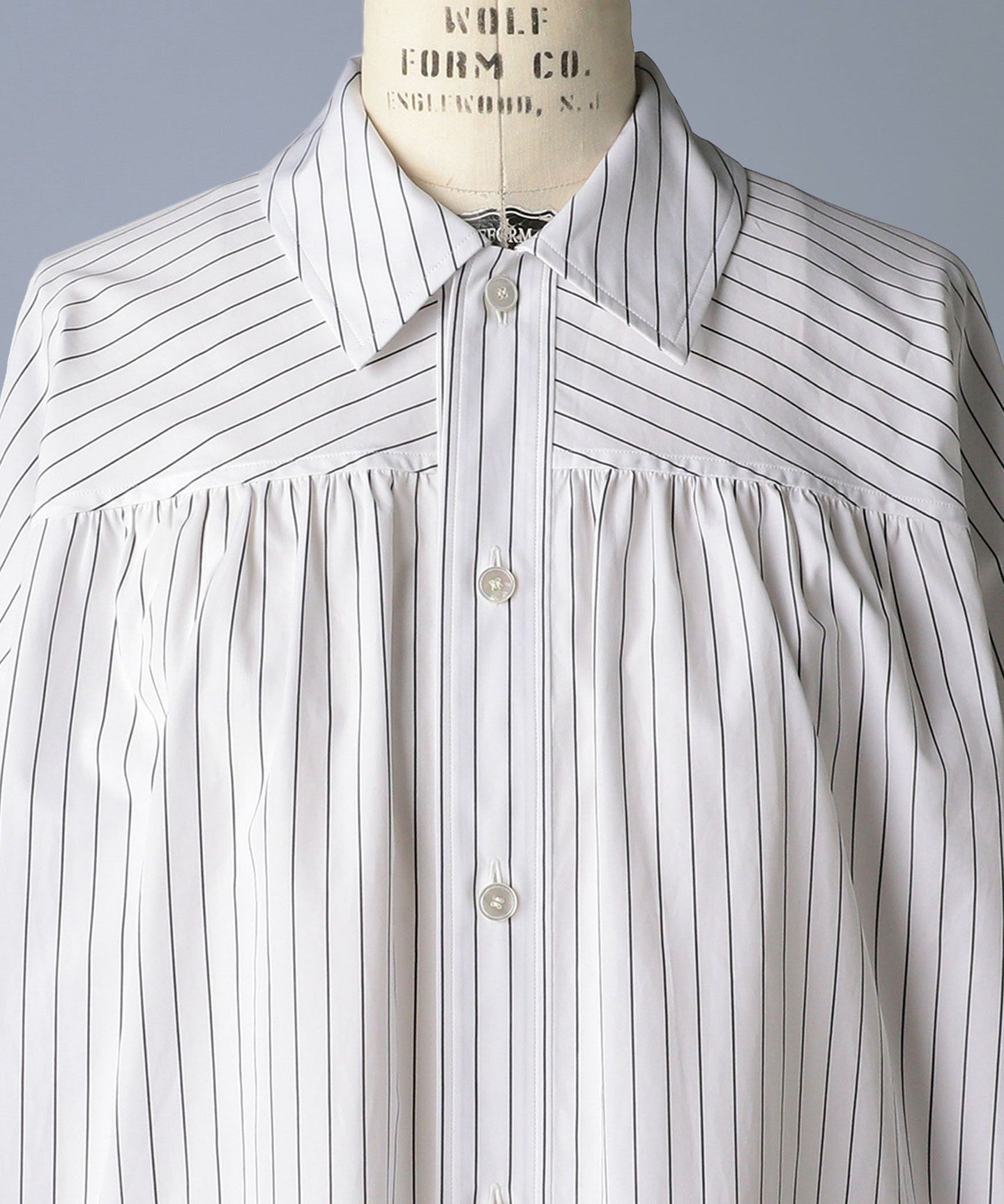 The three-dimensional silhouette created by gathering and the striped pattern are the highlights.