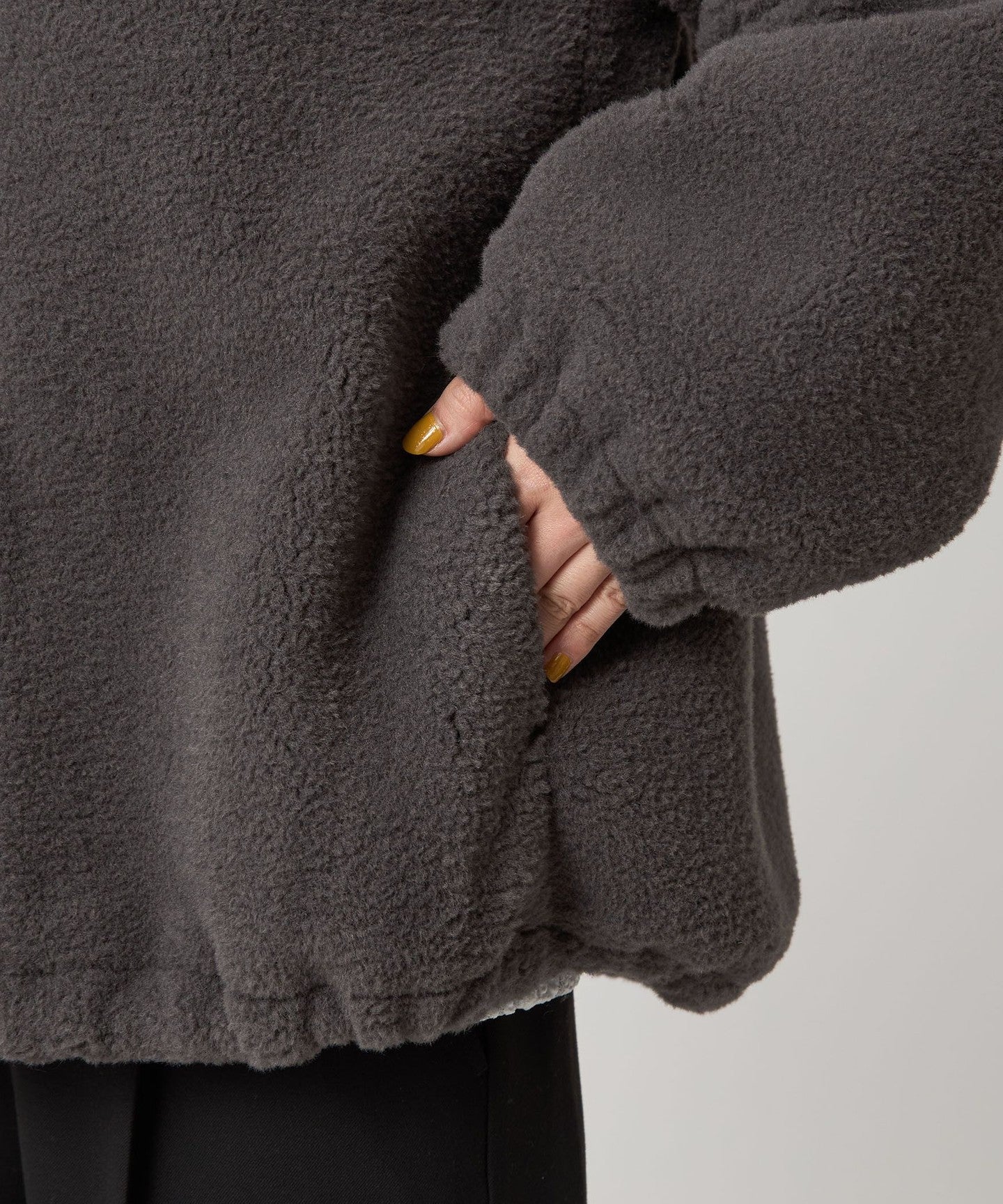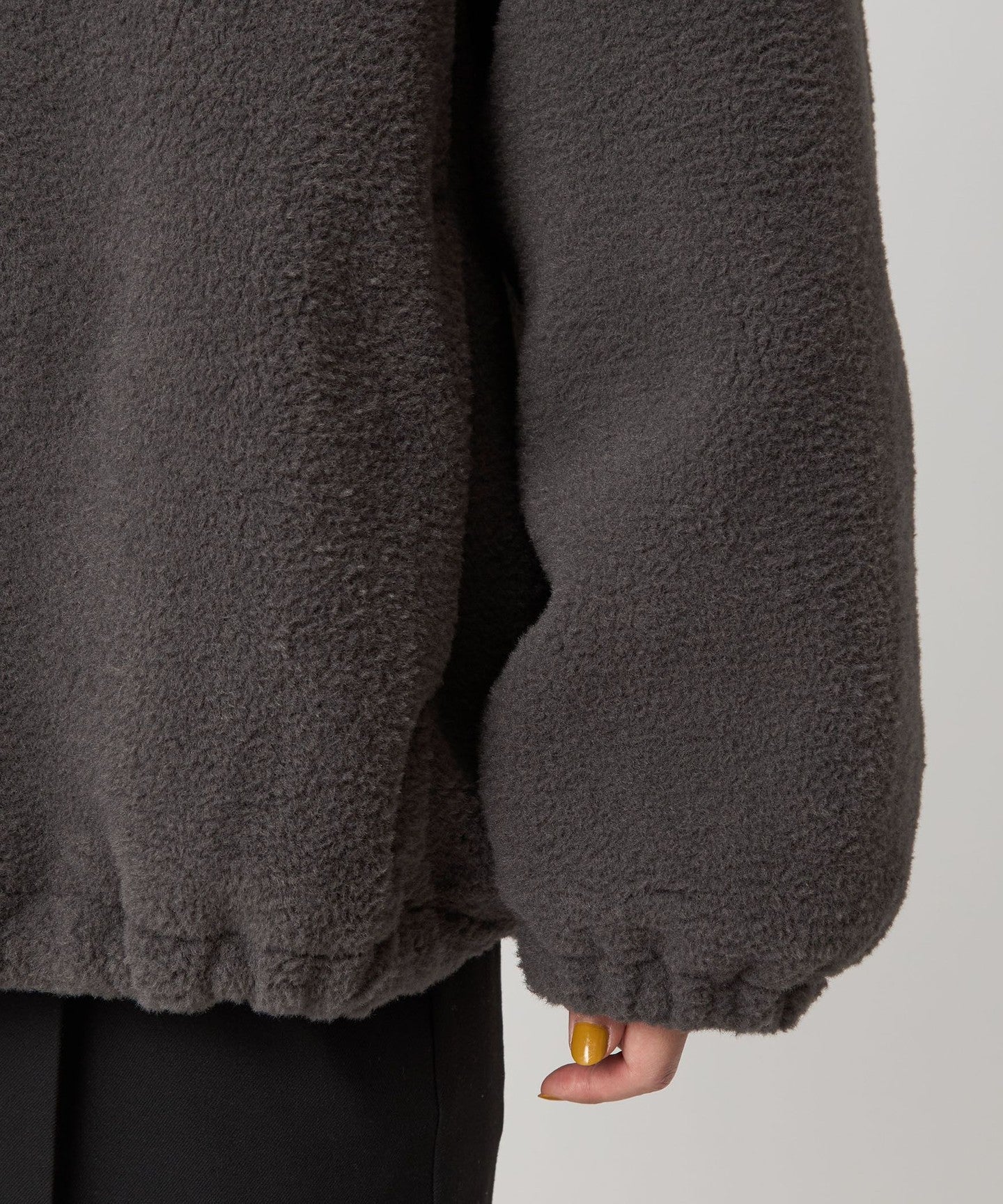 A faux fur blouson with a curly, fuzzy feel.