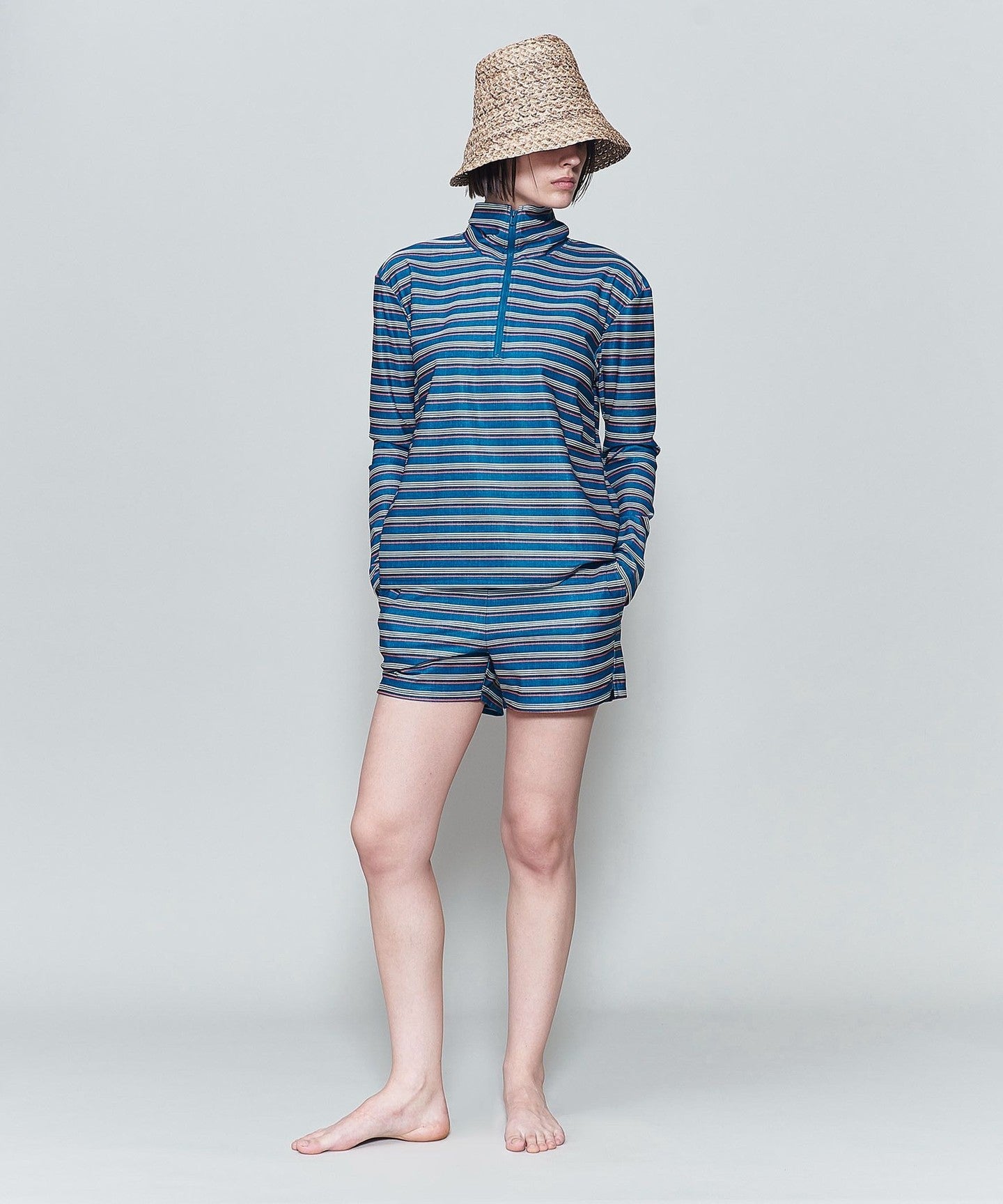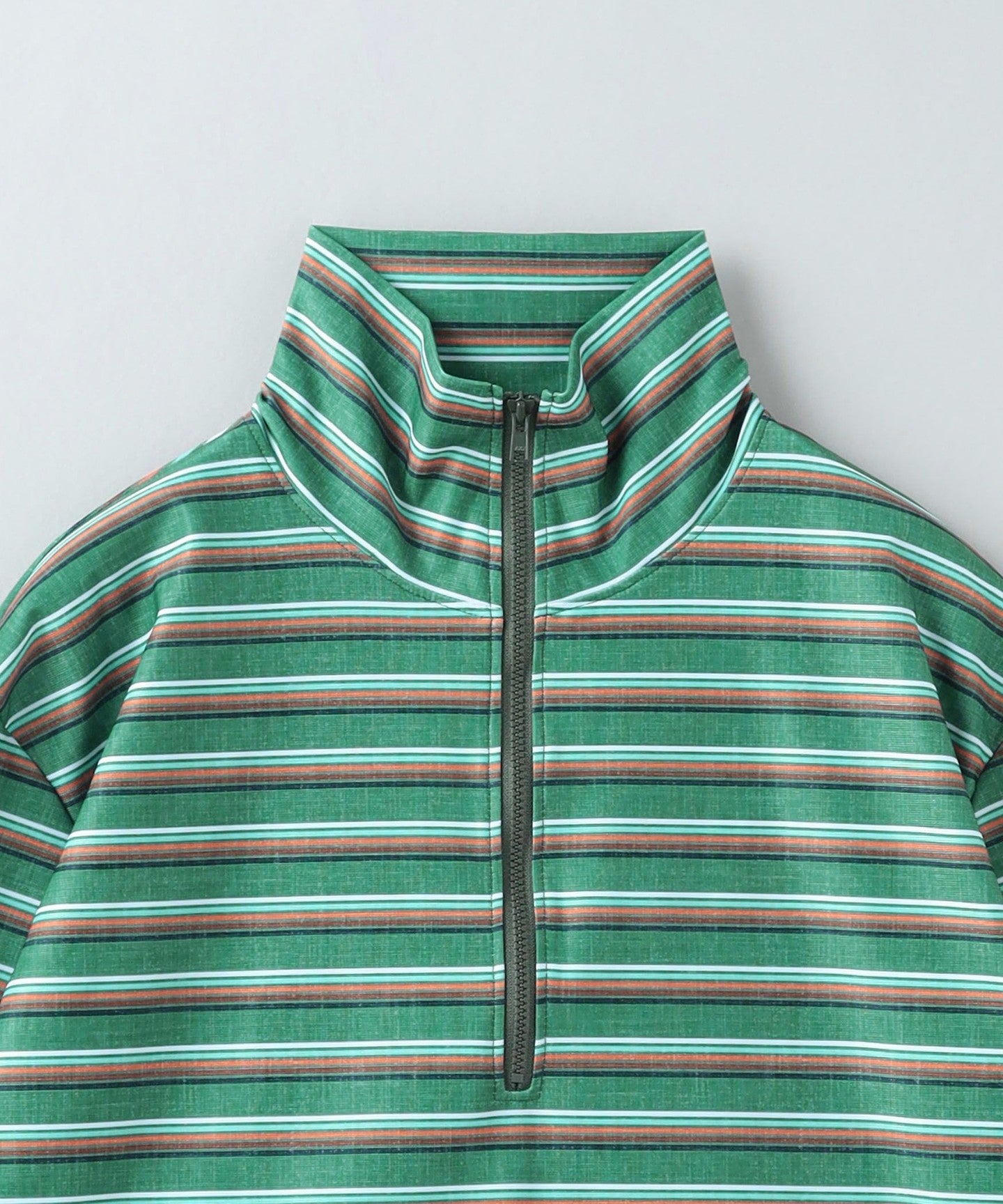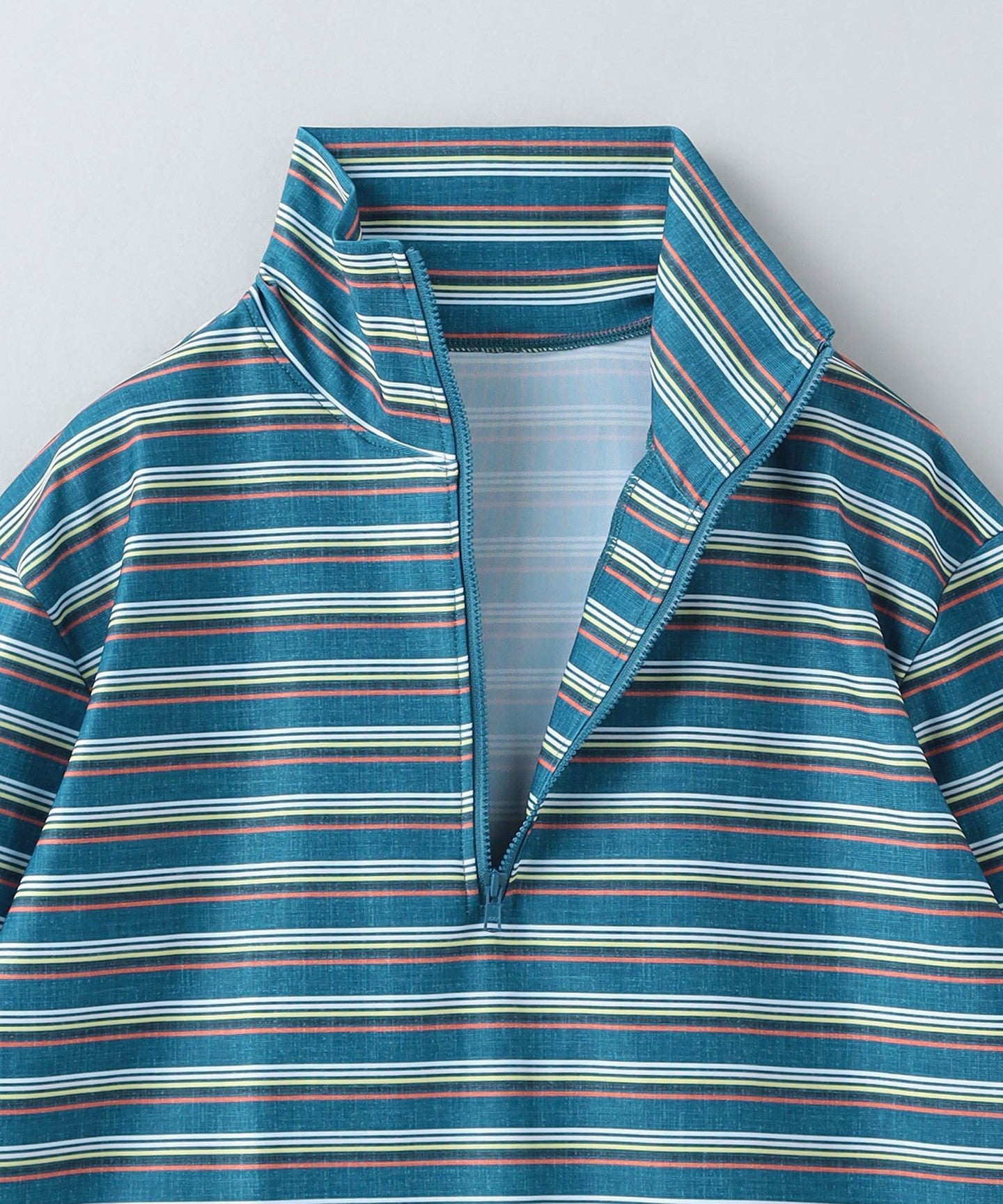 A half-zip rash guard with a faded striped pattern that gives it a retro chic look.