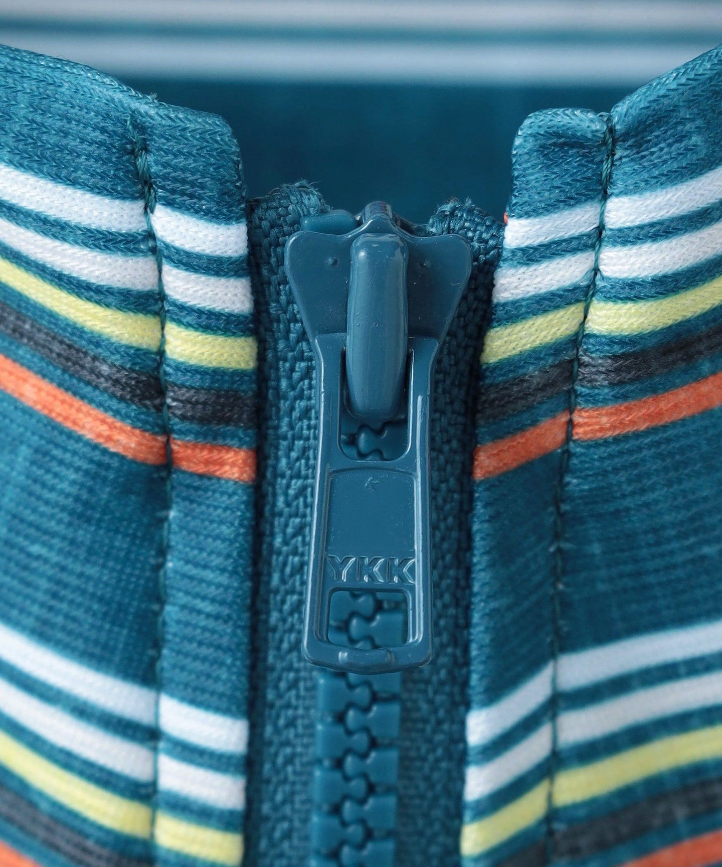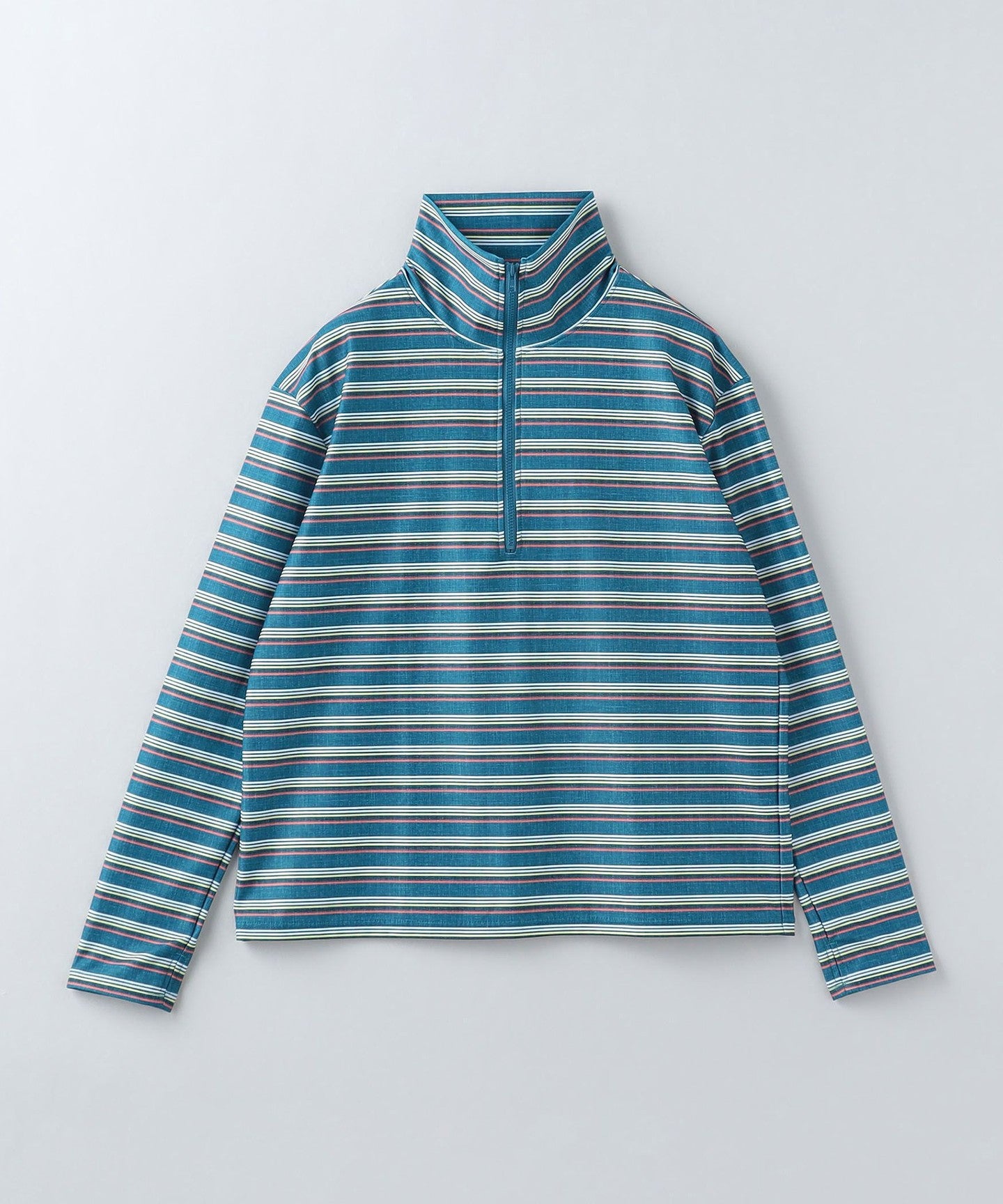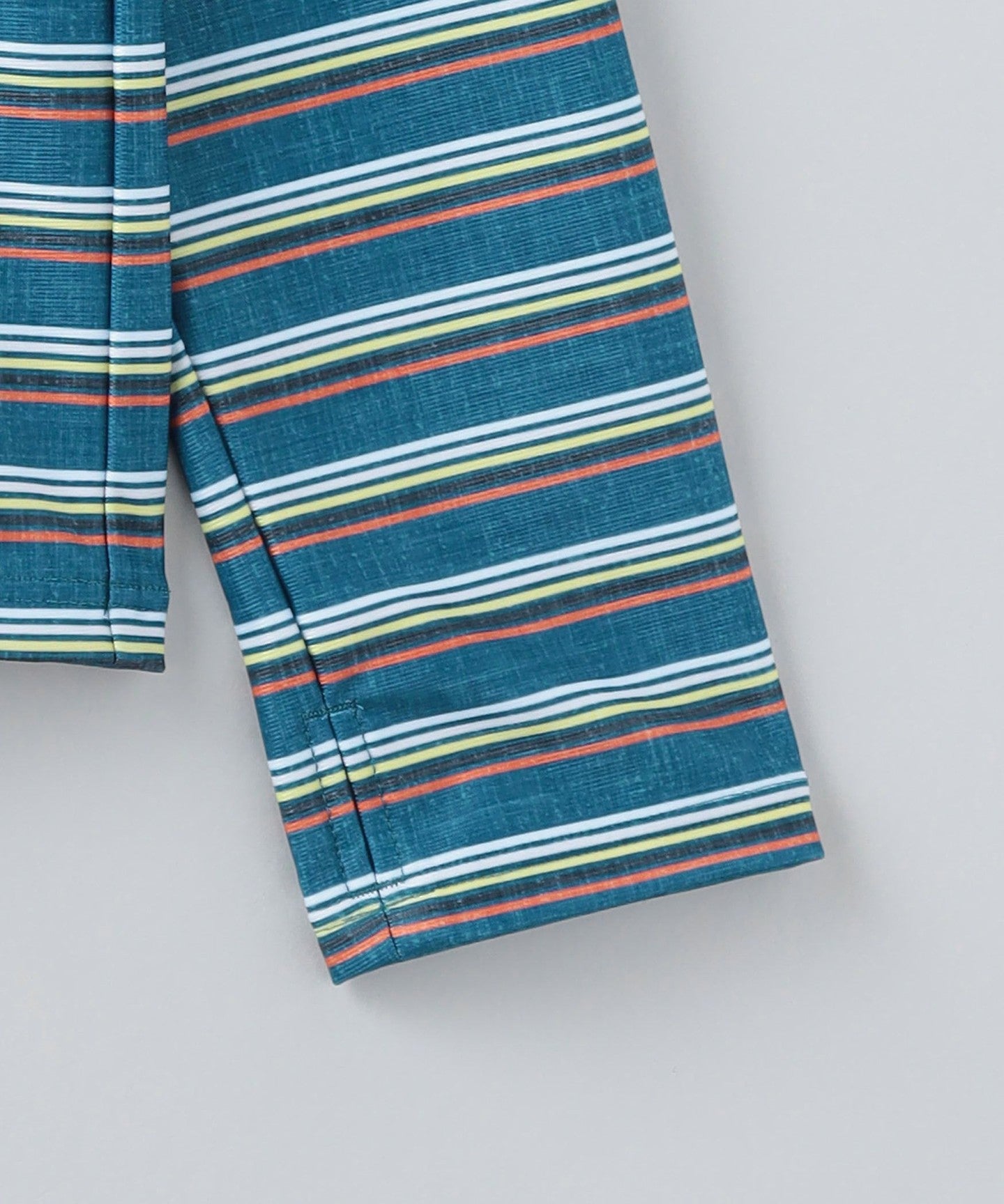 A half-zip rash guard with a faded striped pattern that gives it a retro chic look.