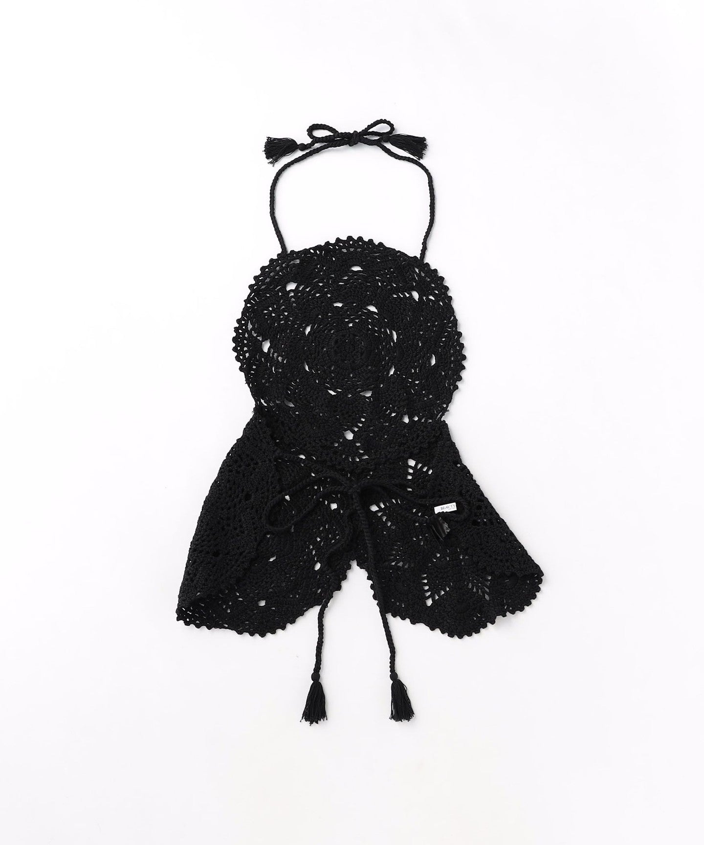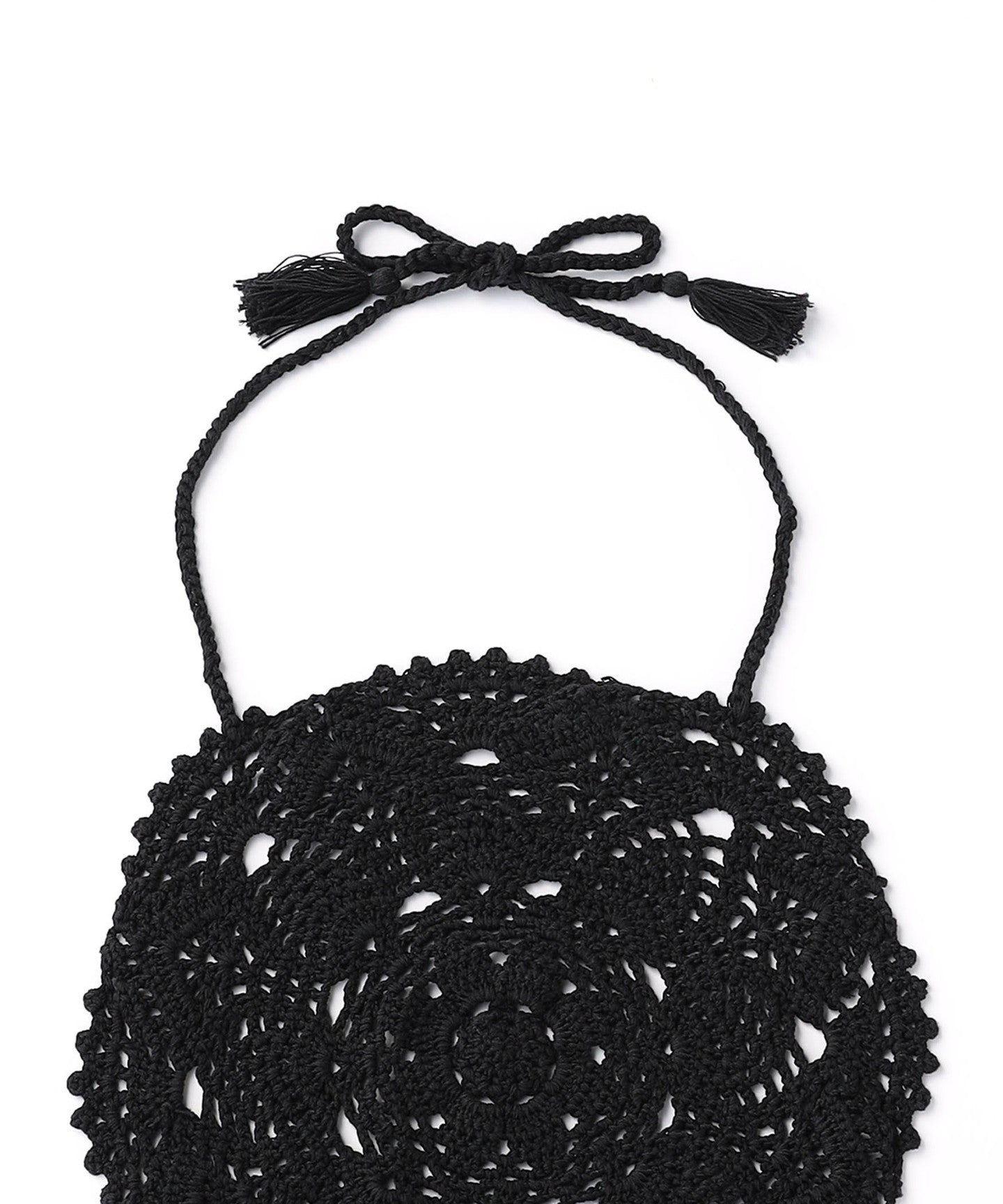 A halter neck design that combines hand-knitted circular patterns by knitters.