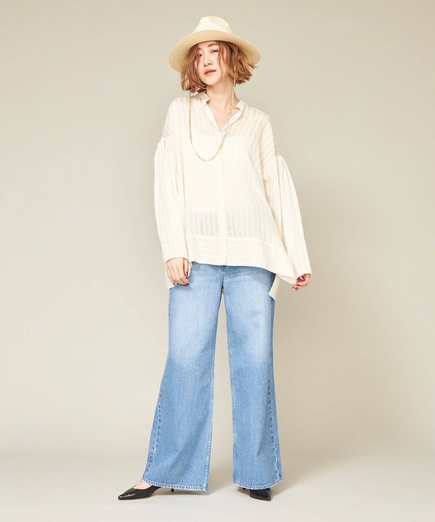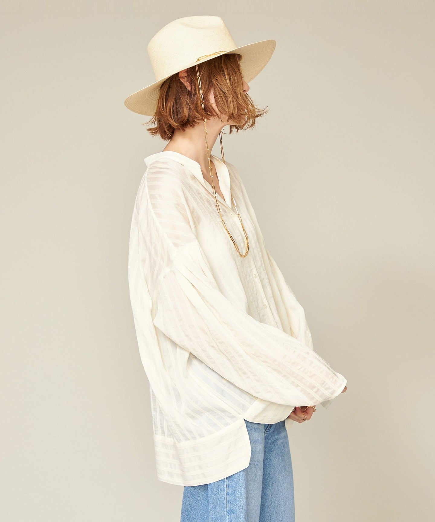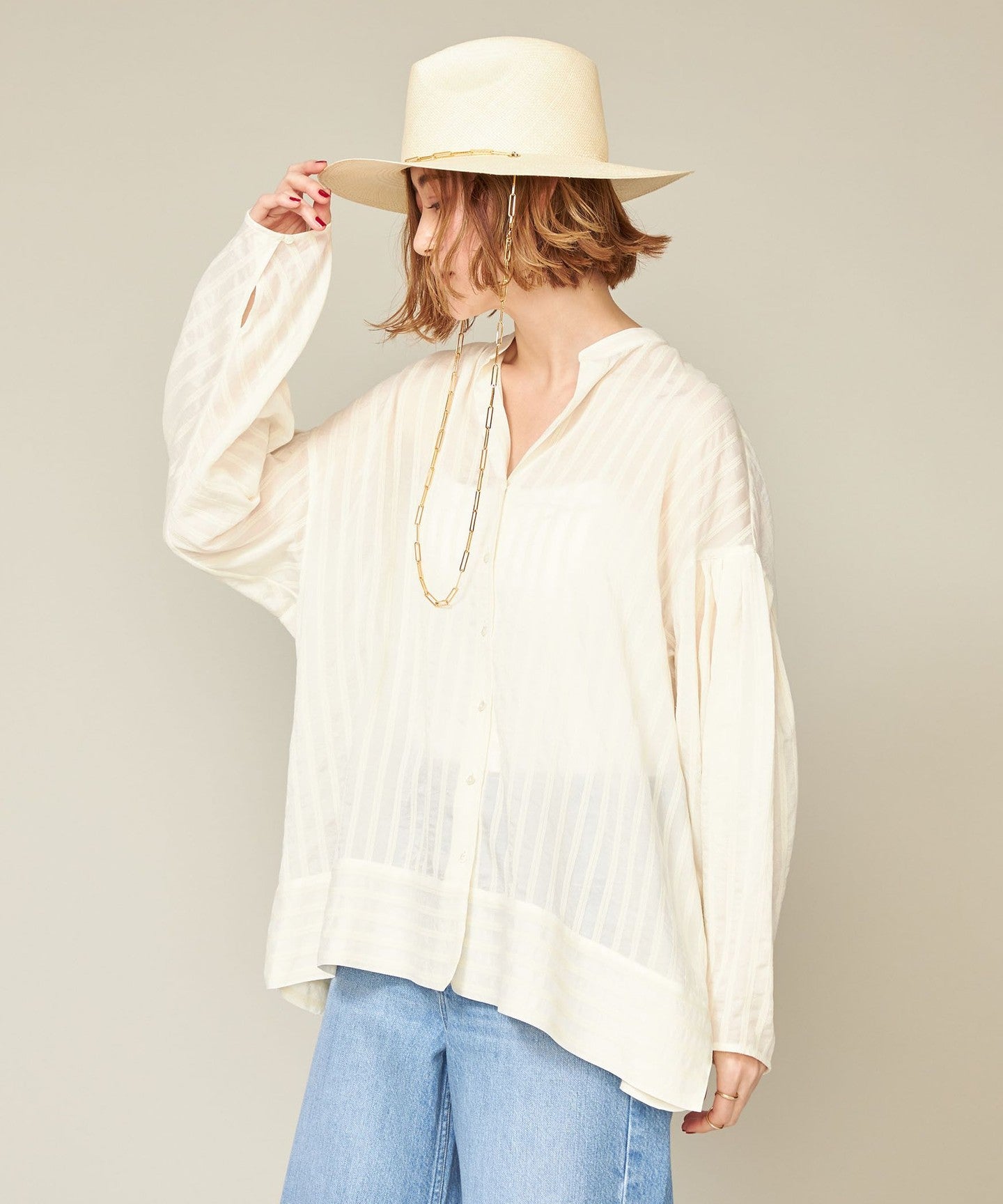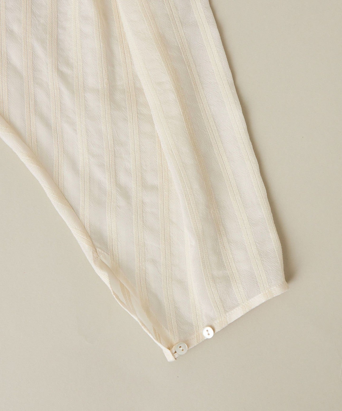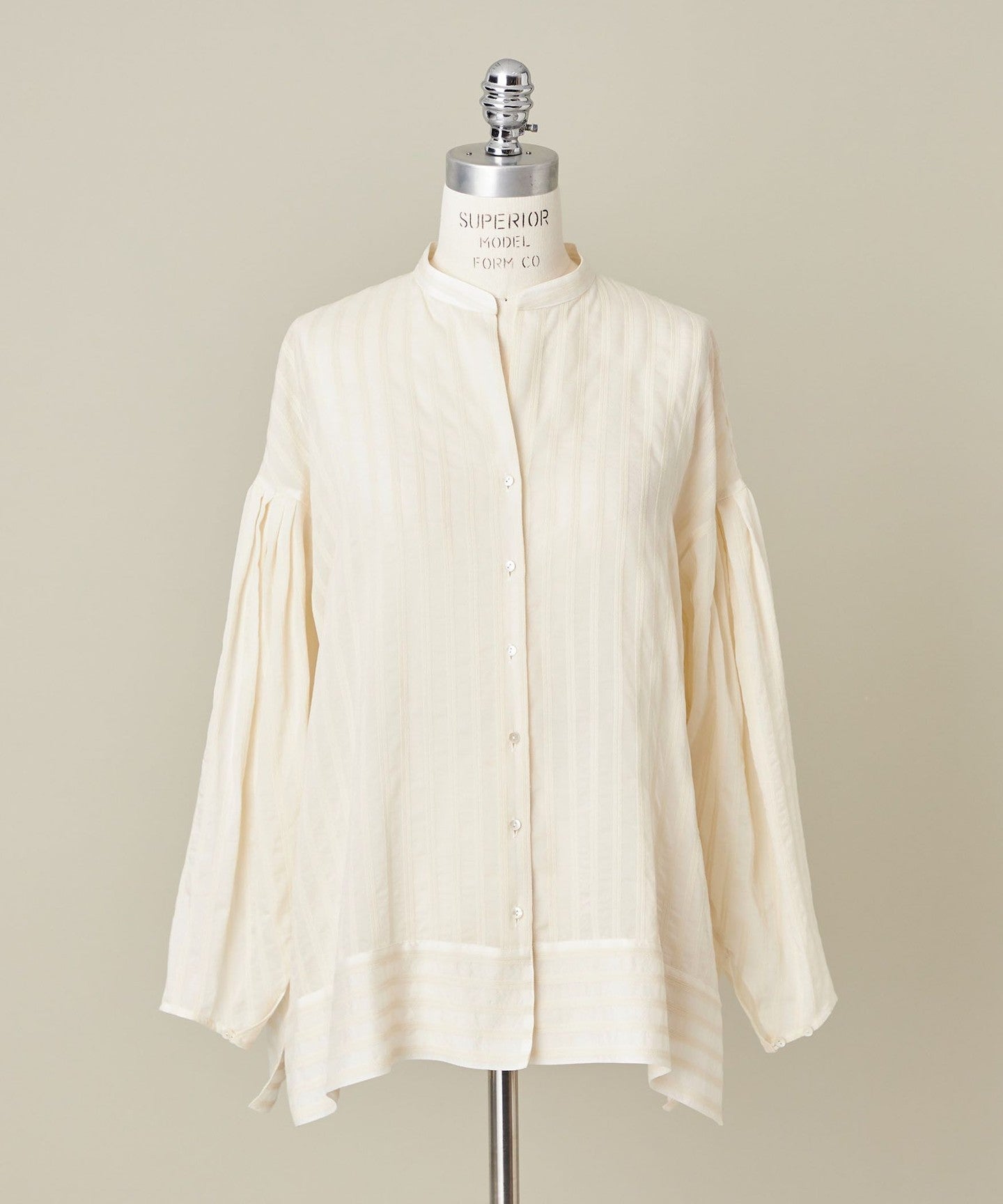 This piece features random tucks in the sleeves, and attention has been paid to the balance of details such as the wide hem and button size.