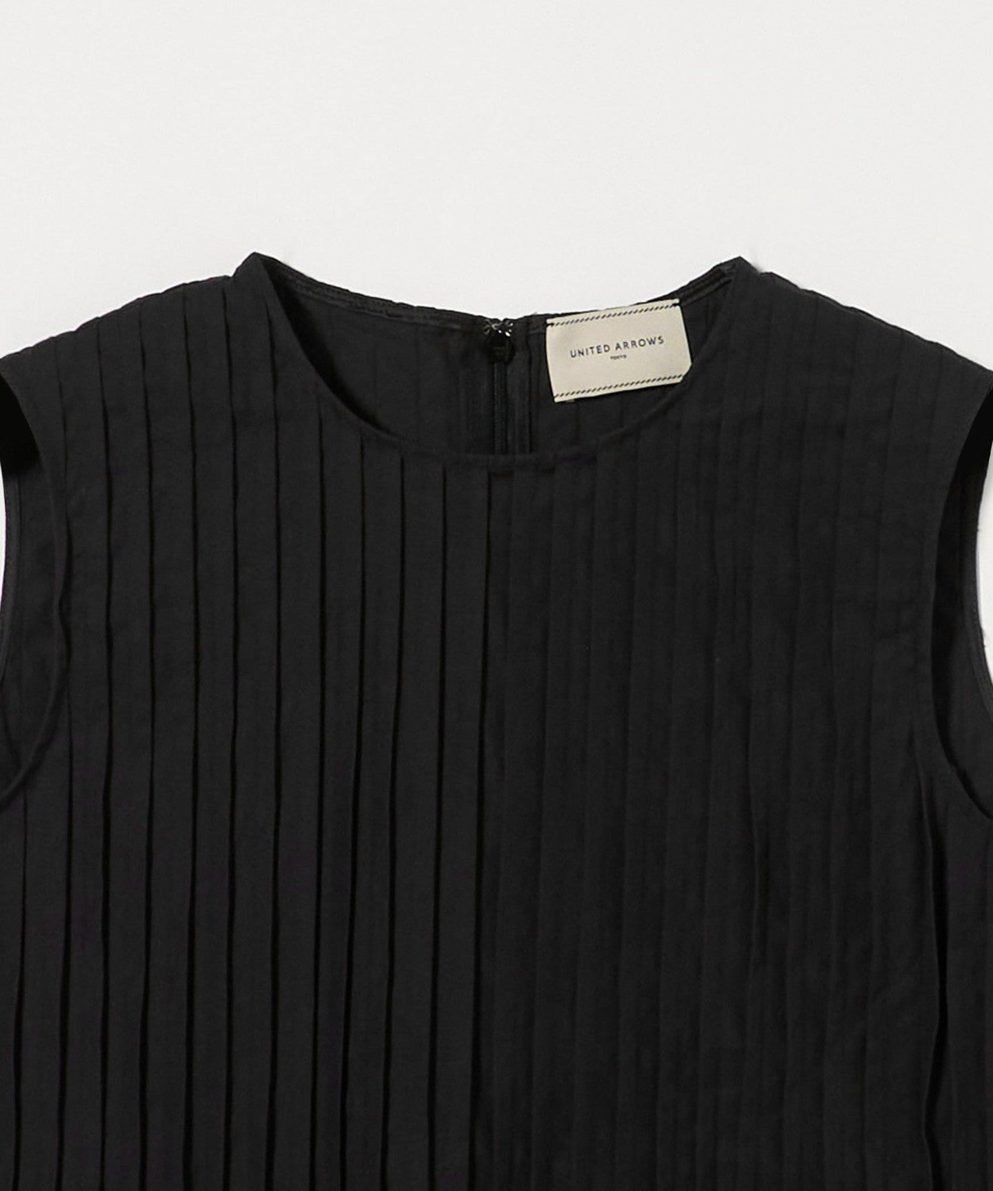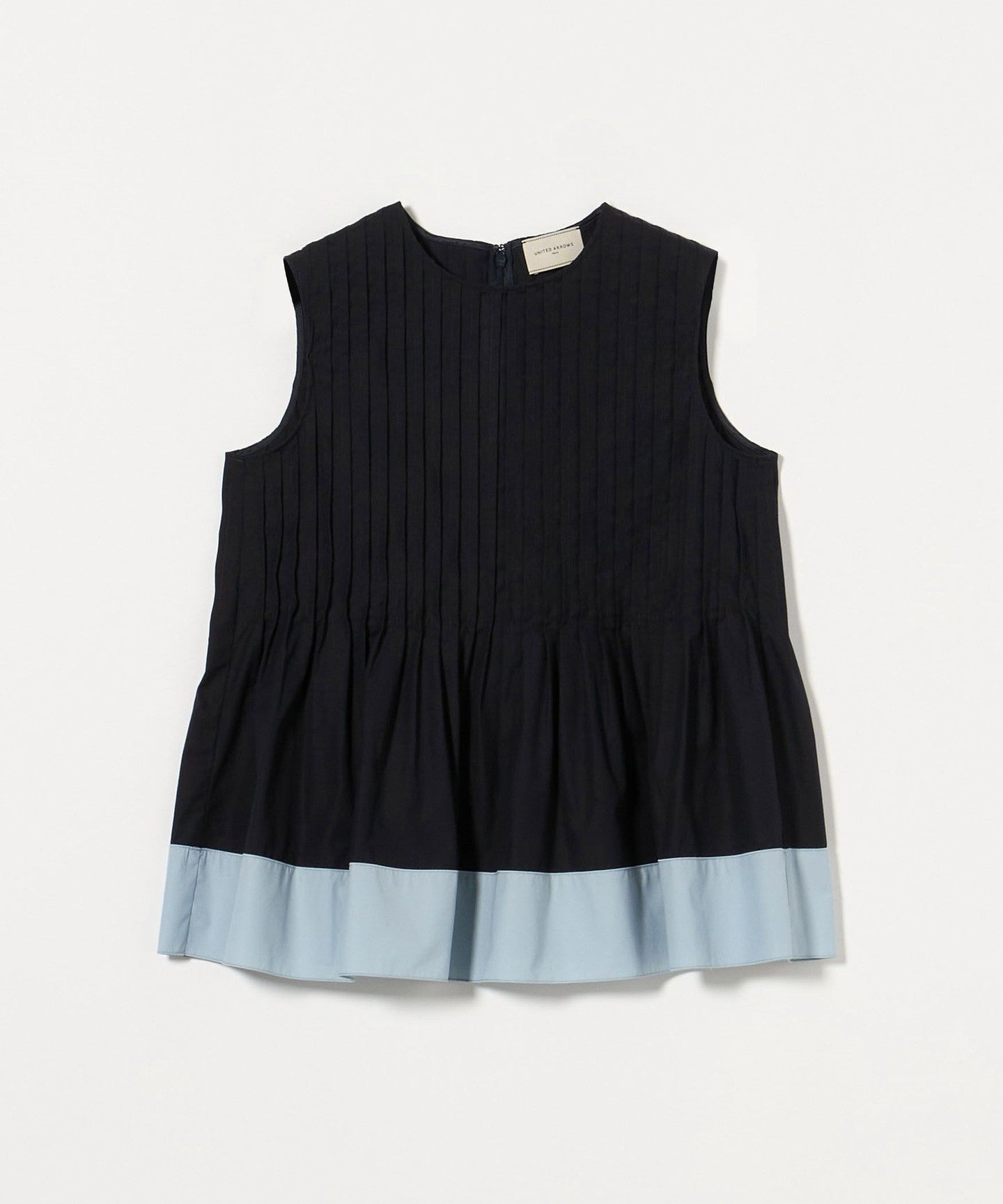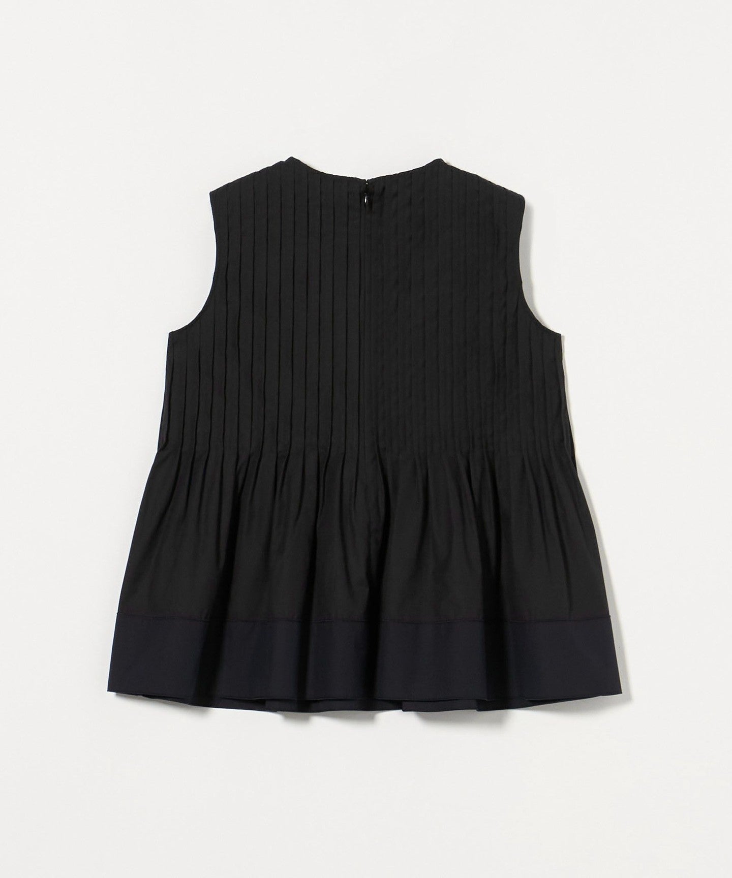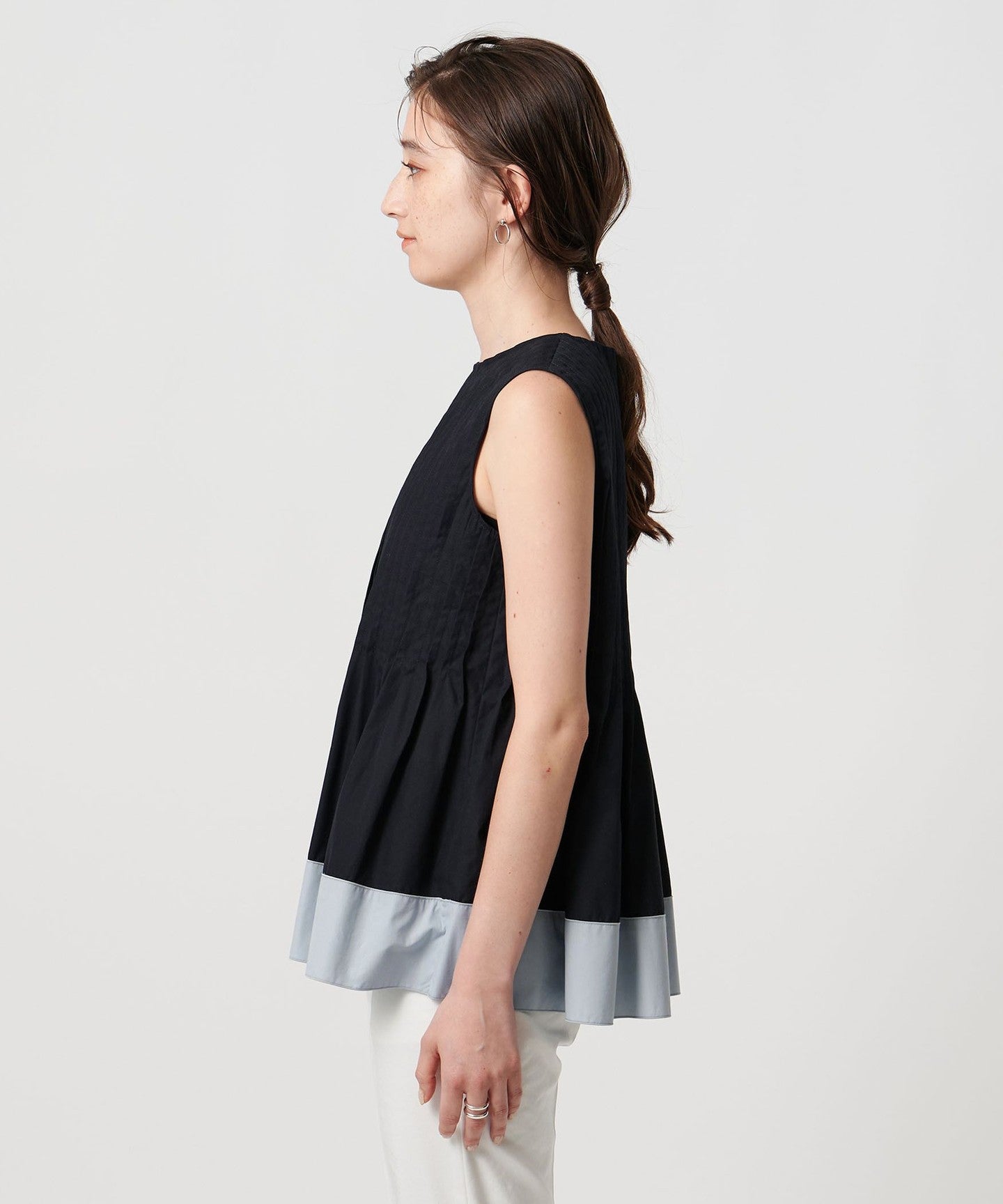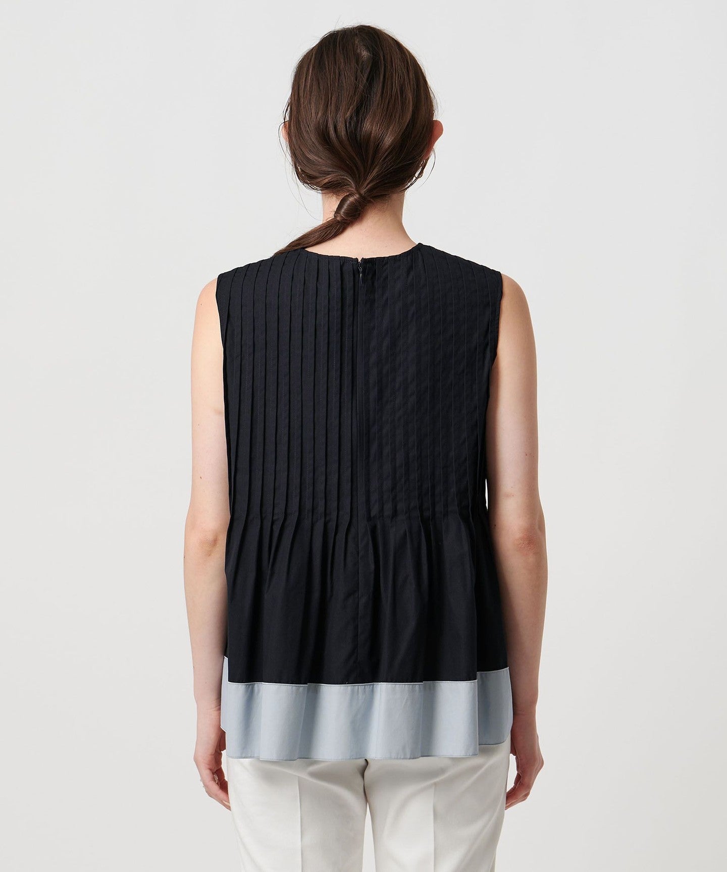 This sleeveless blouse features tucks and stitch work details throughout the body, and a voluminous silhouette that widens towards the hem, giving it a feminine impression.