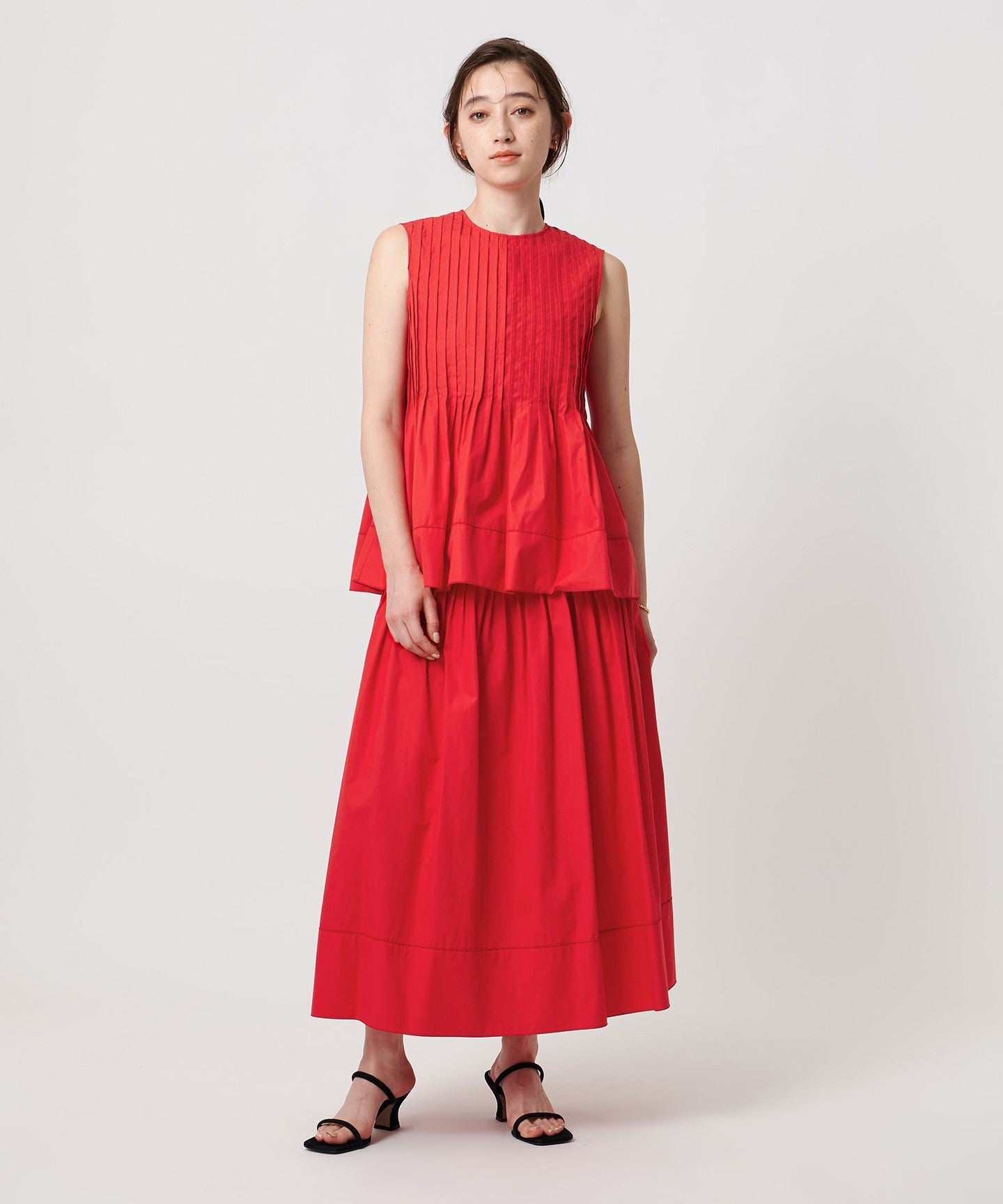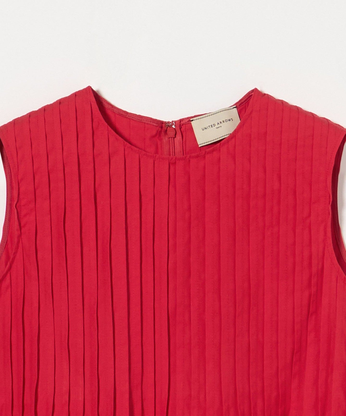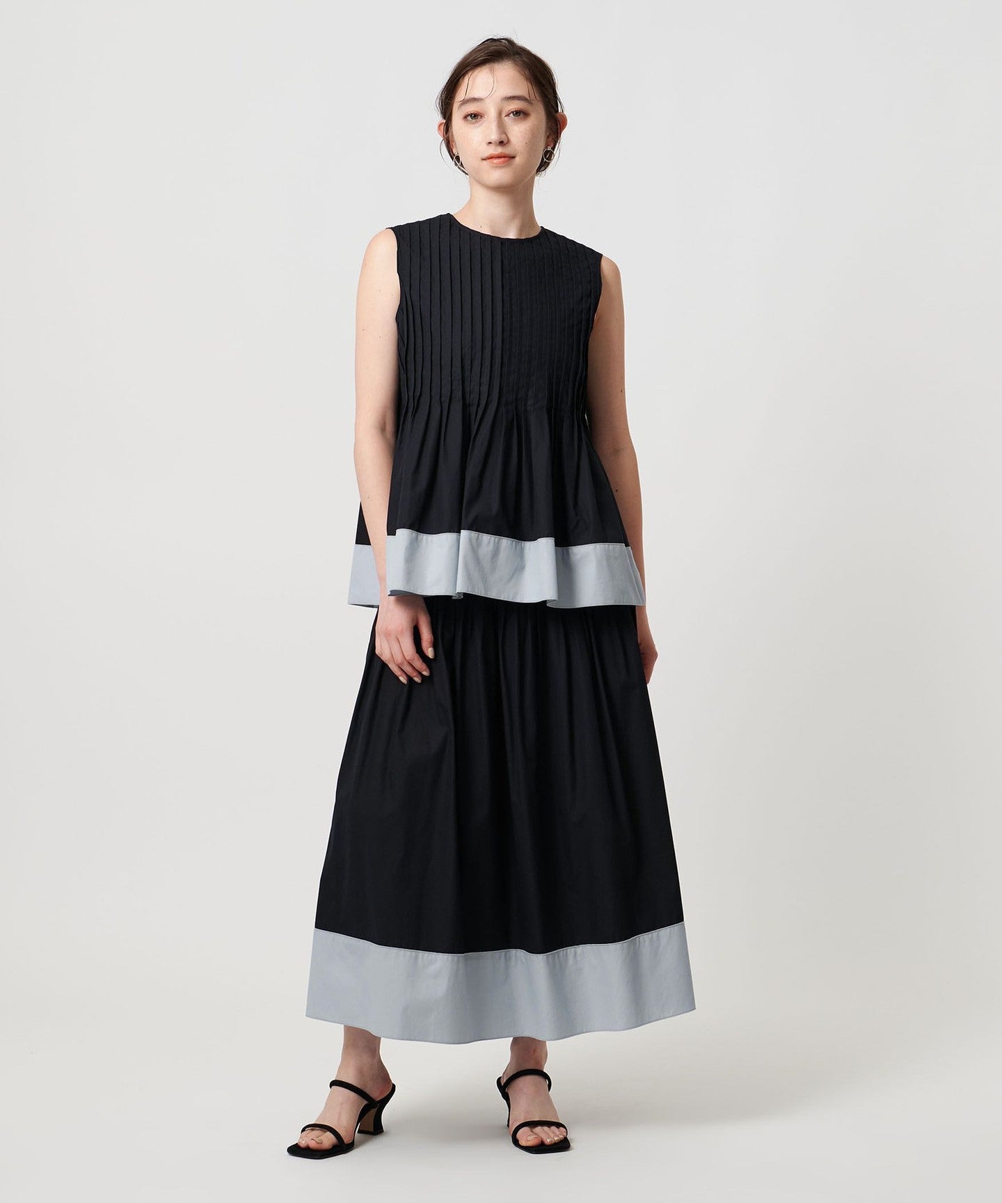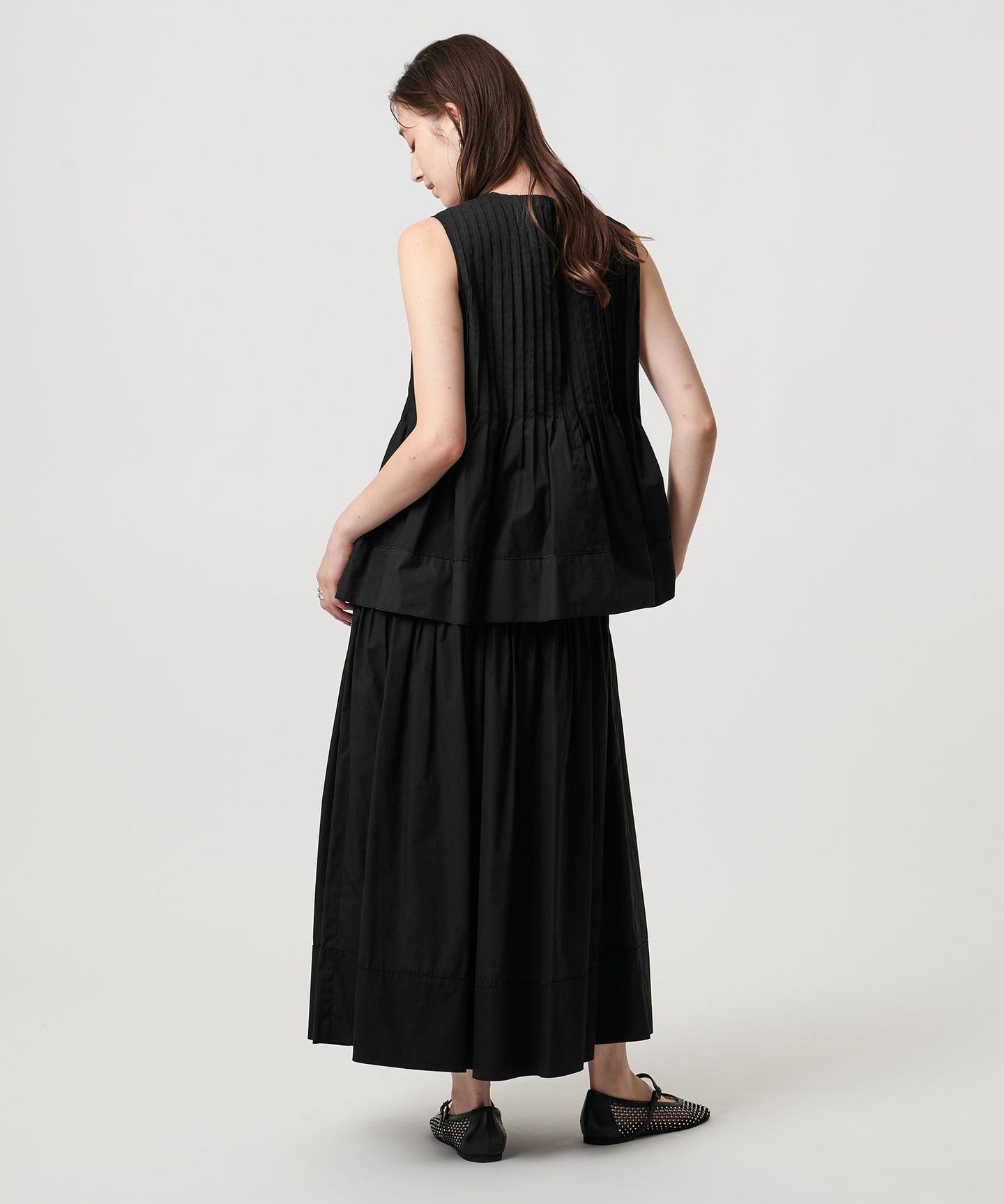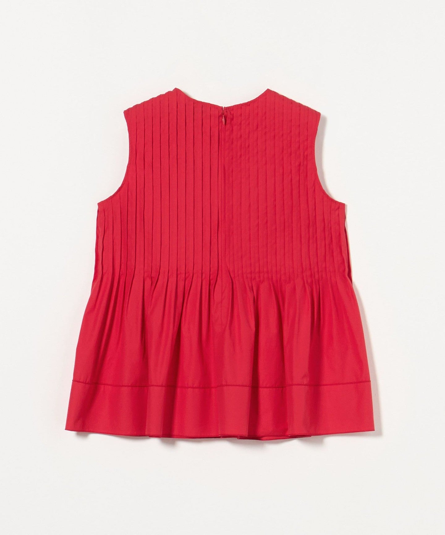 This sleeveless blouse features tucks and stitch work details throughout the body, and a voluminous silhouette that widens towards the hem, giving it a feminine impression.