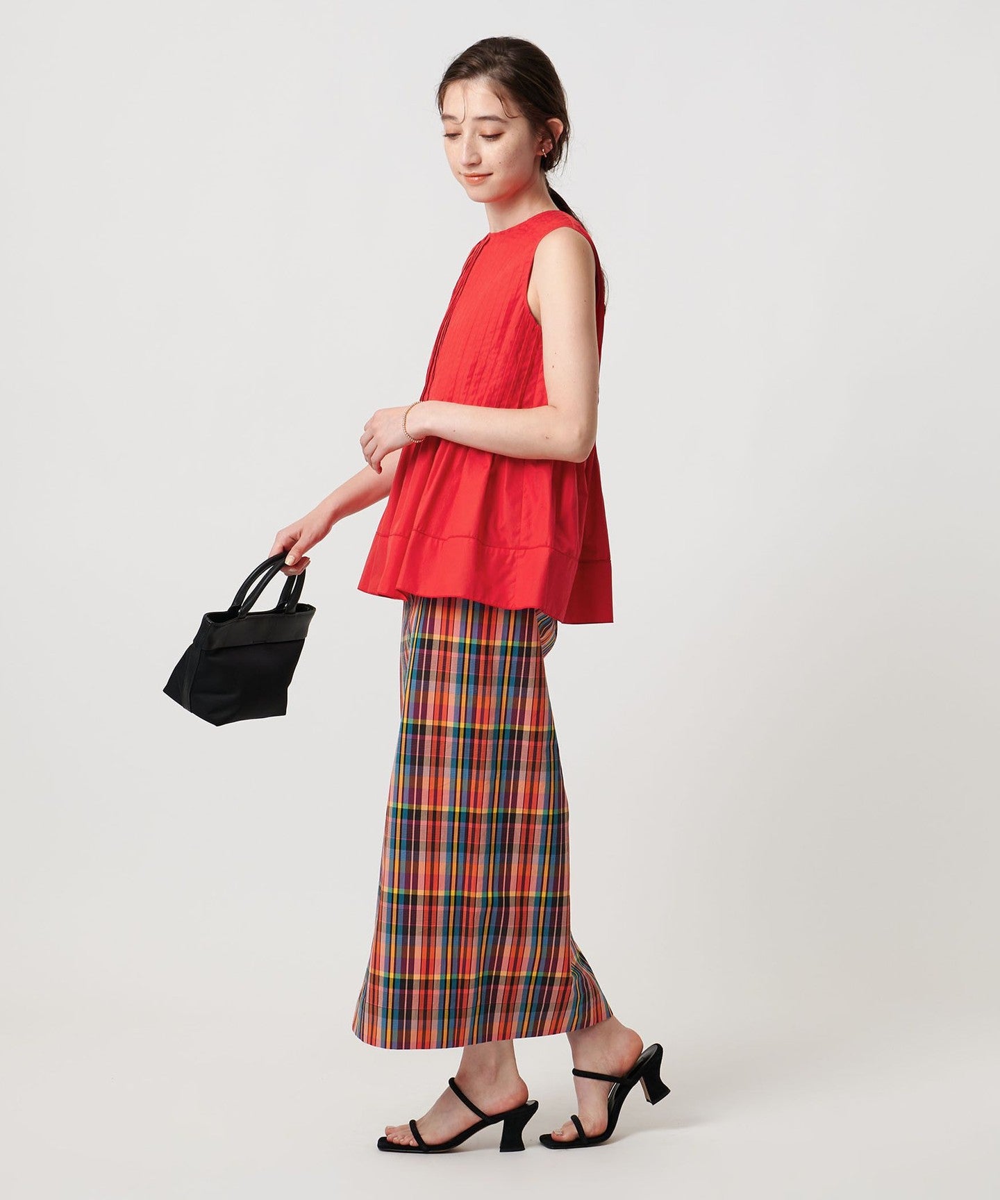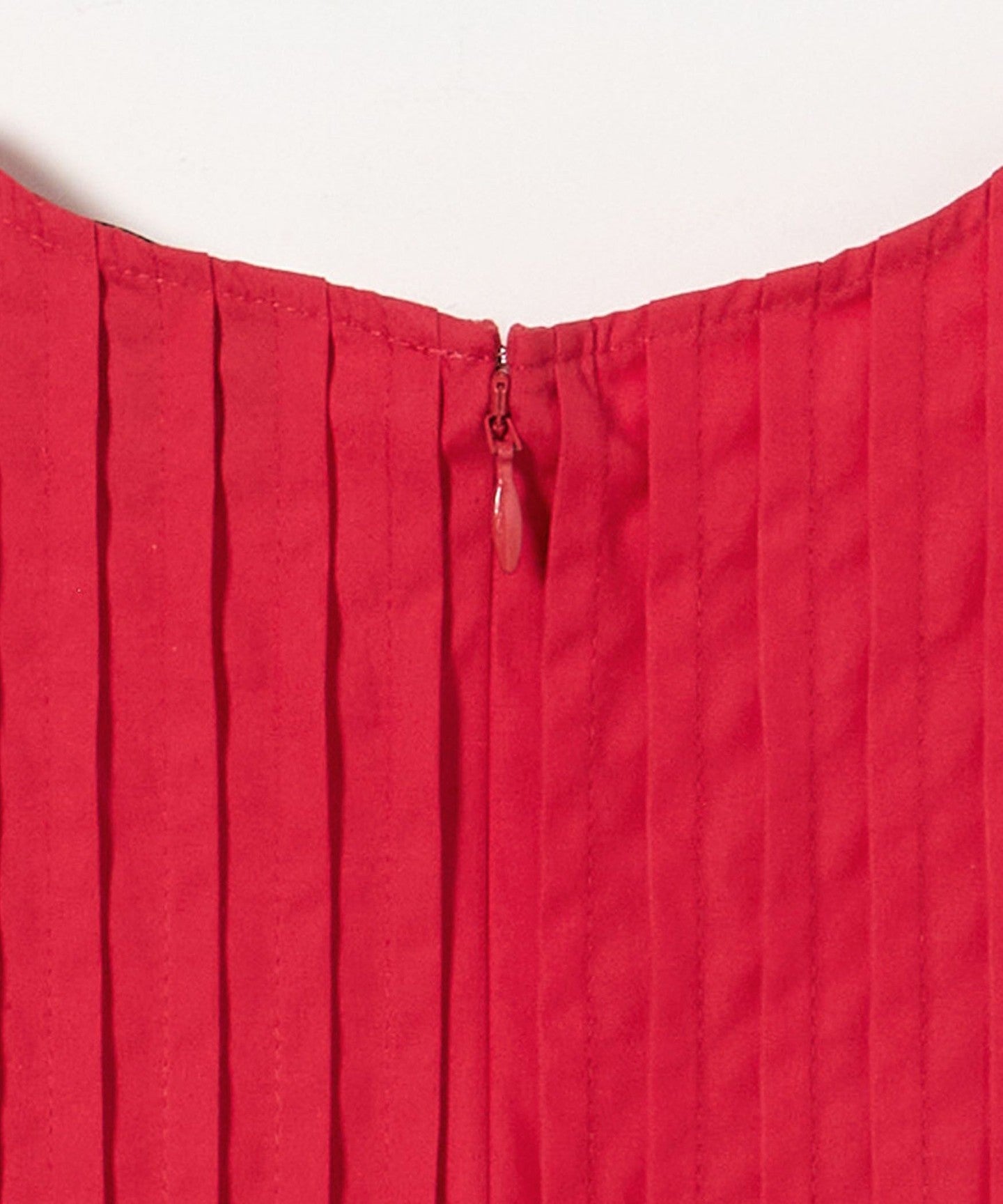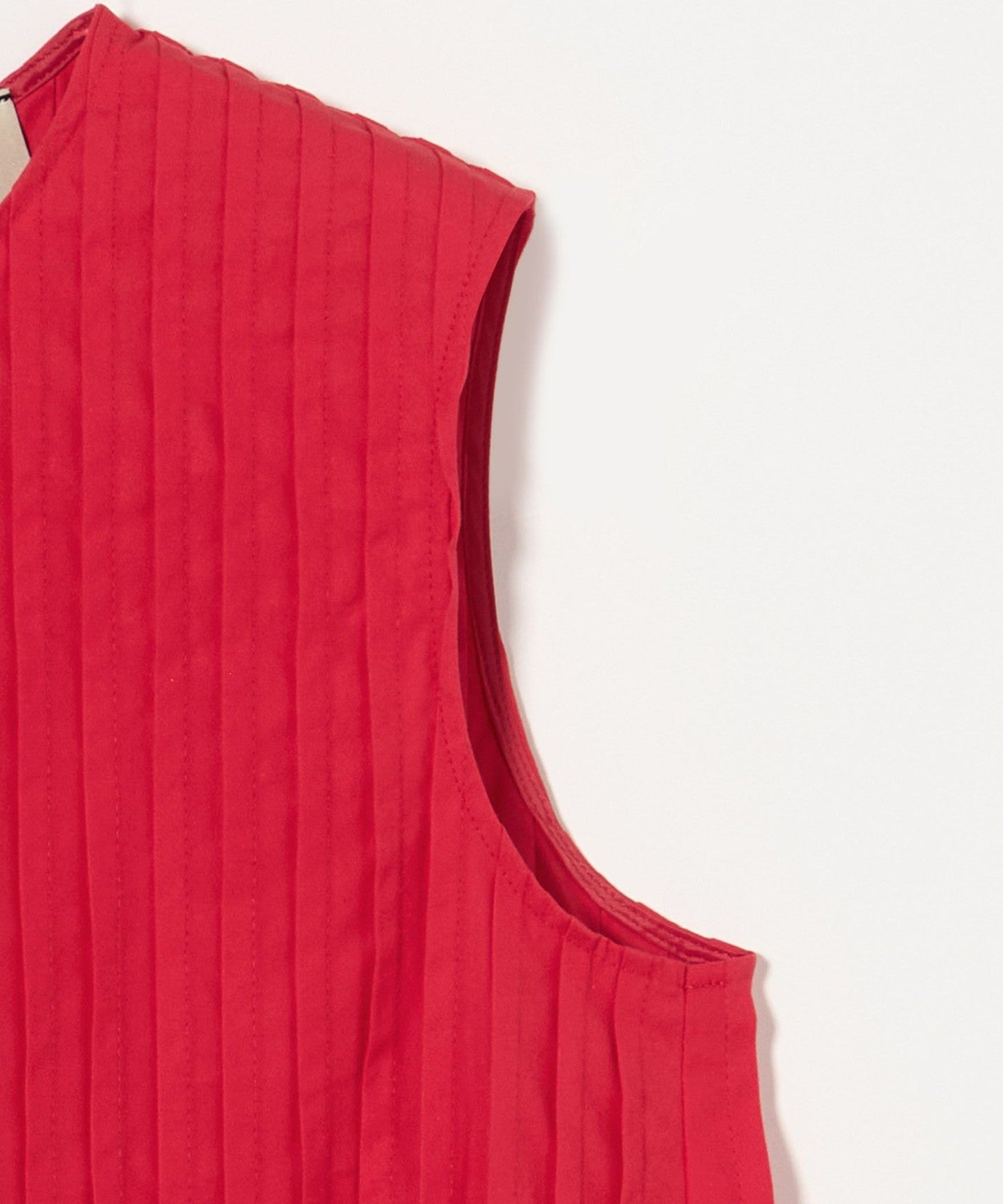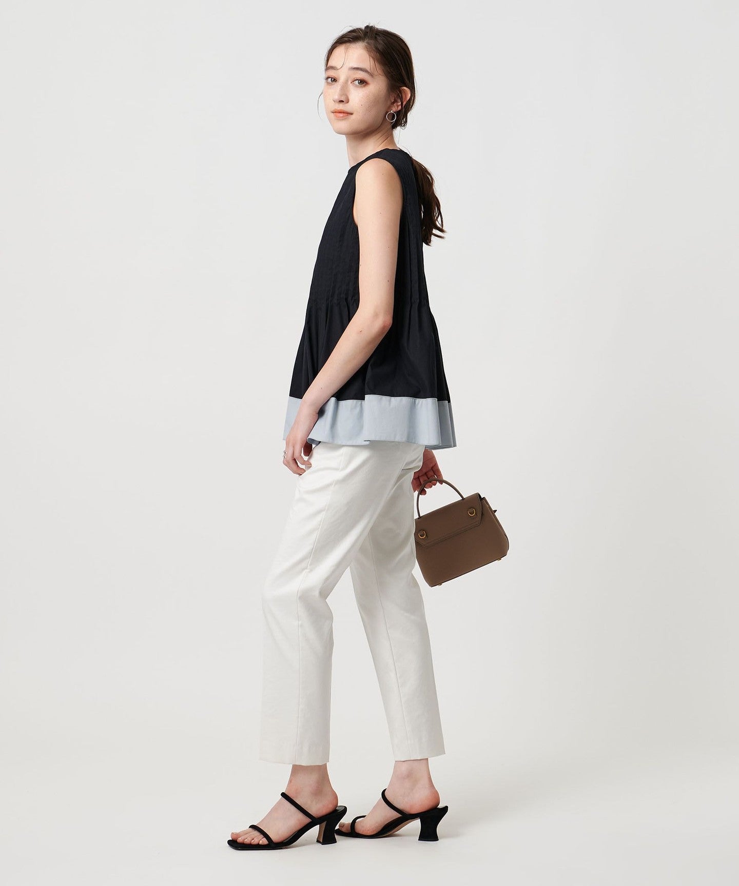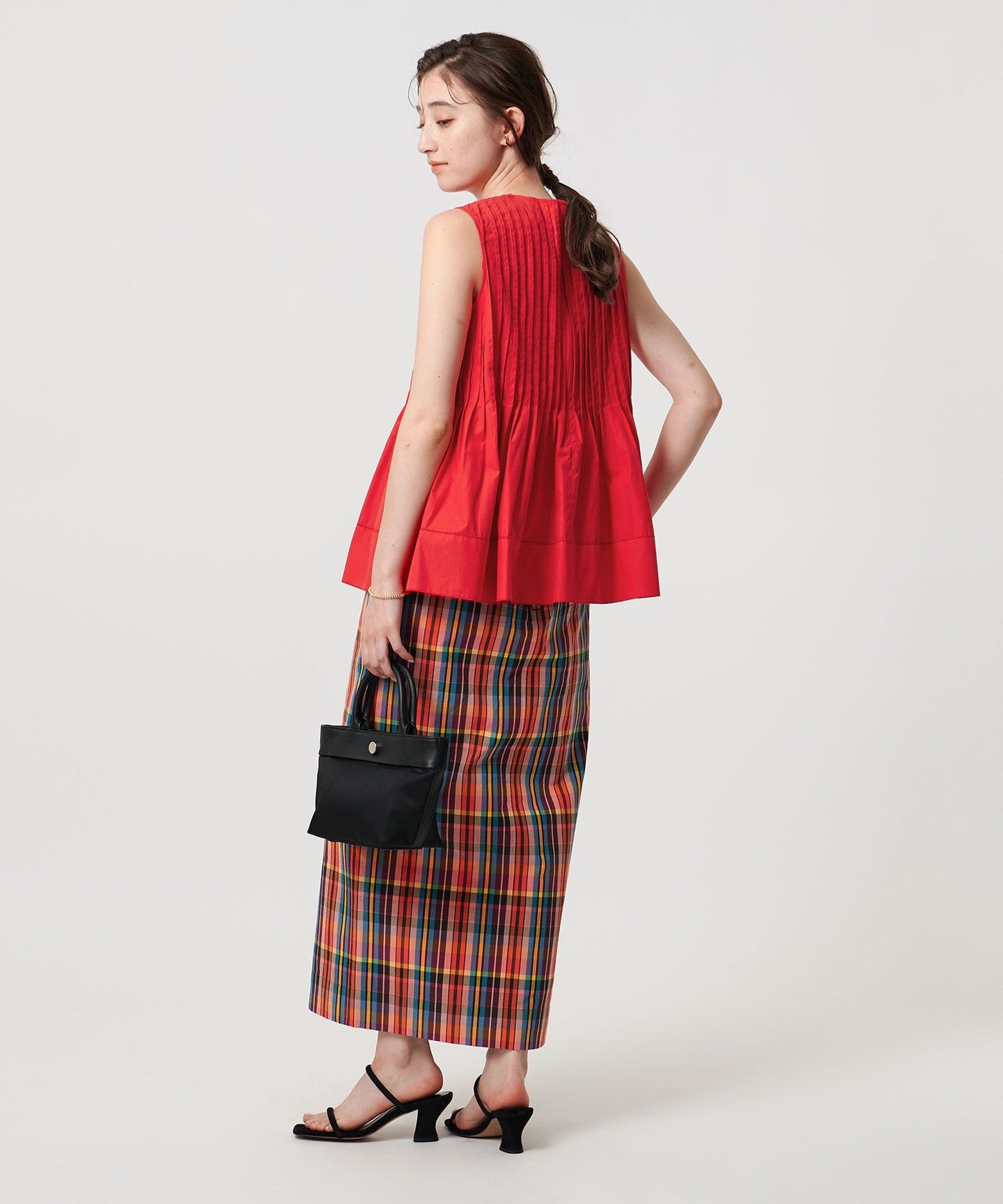 This sleeveless blouse features tucks and stitch work details throughout the body, and a voluminous silhouette that widens towards the hem, giving it a feminine impression.