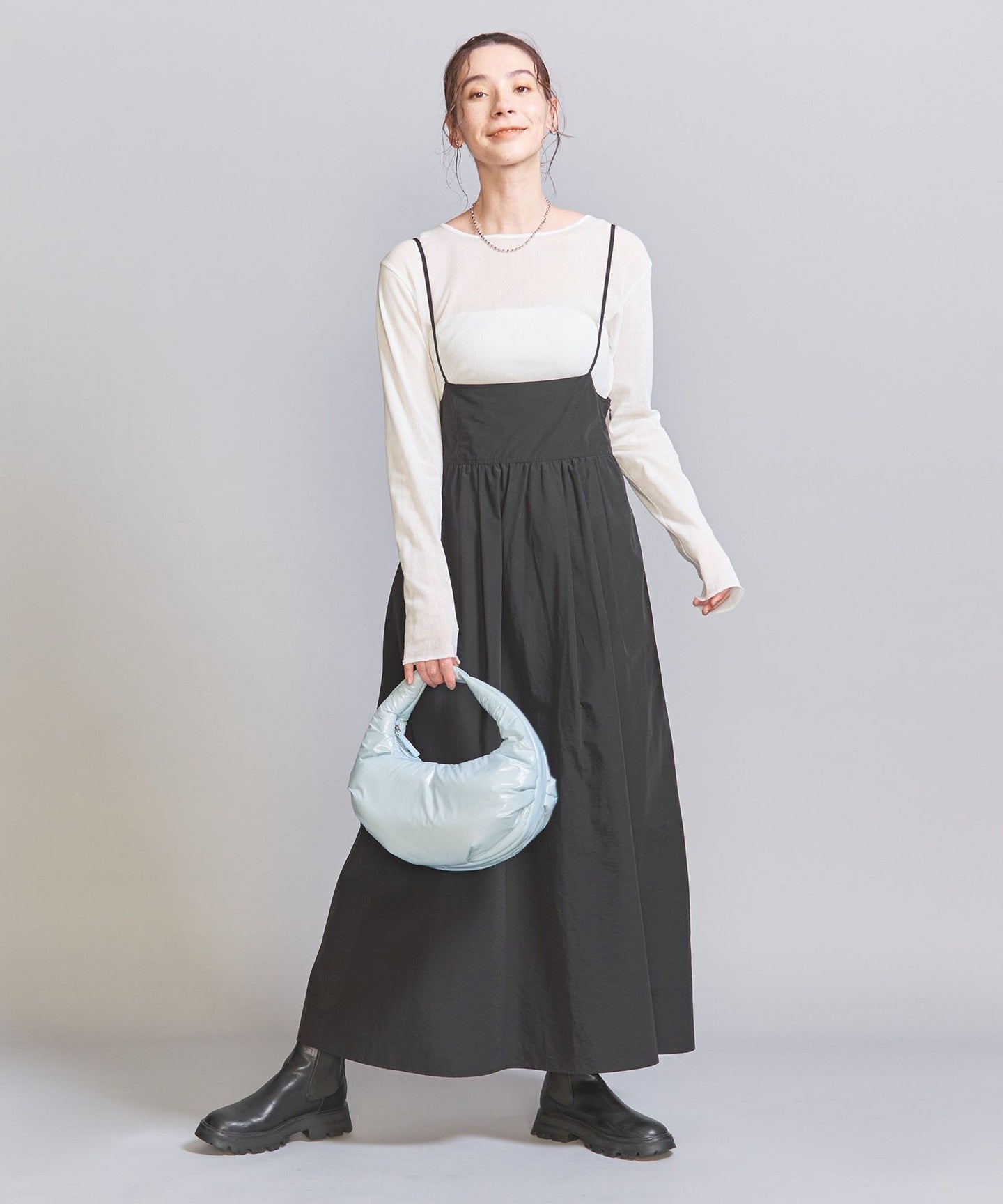 The natural volume that spreads from the gathers on the sleek body accentuates the feminine look.