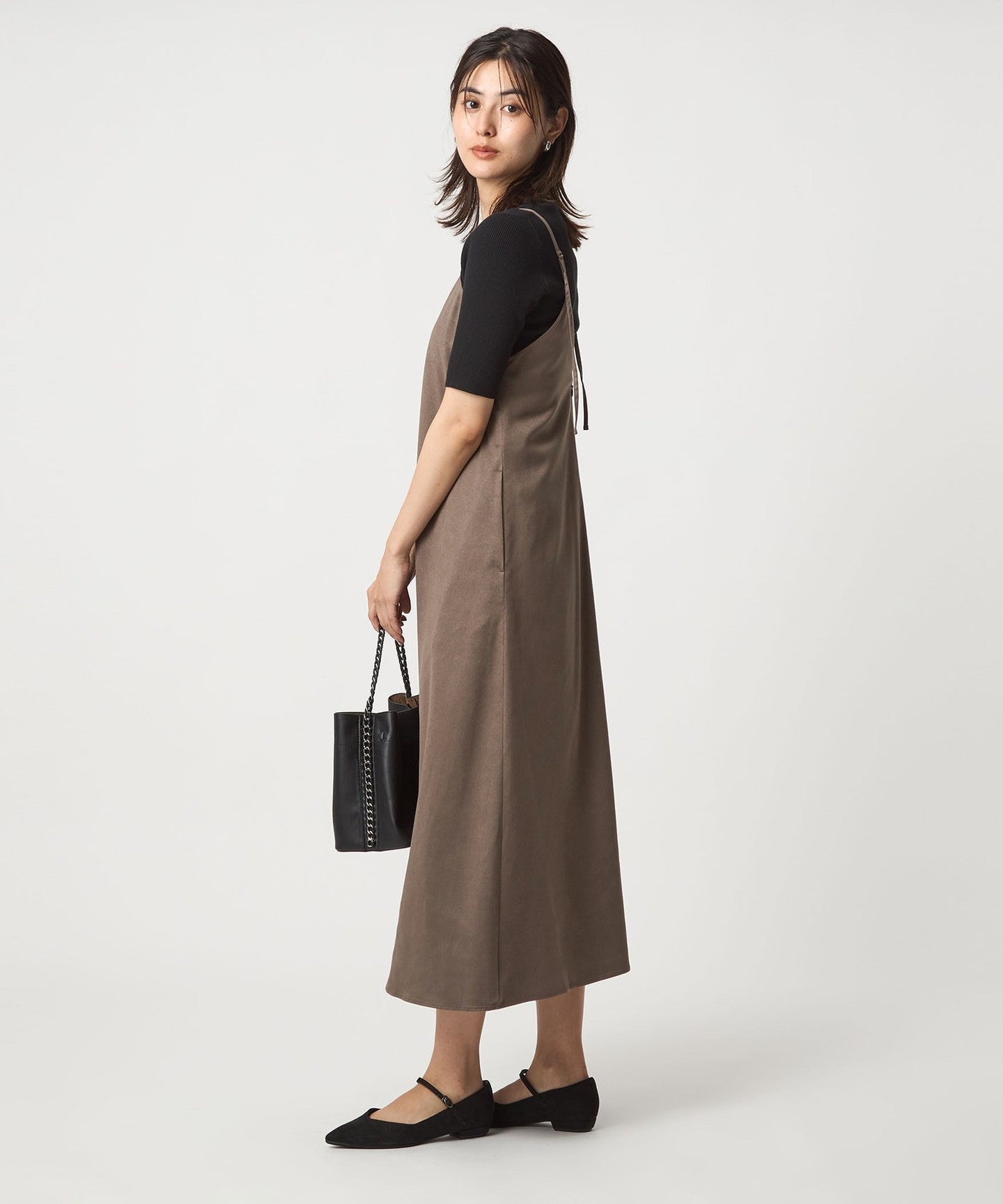 A cami dress with a suede-like texture that enhances the seasonal mood