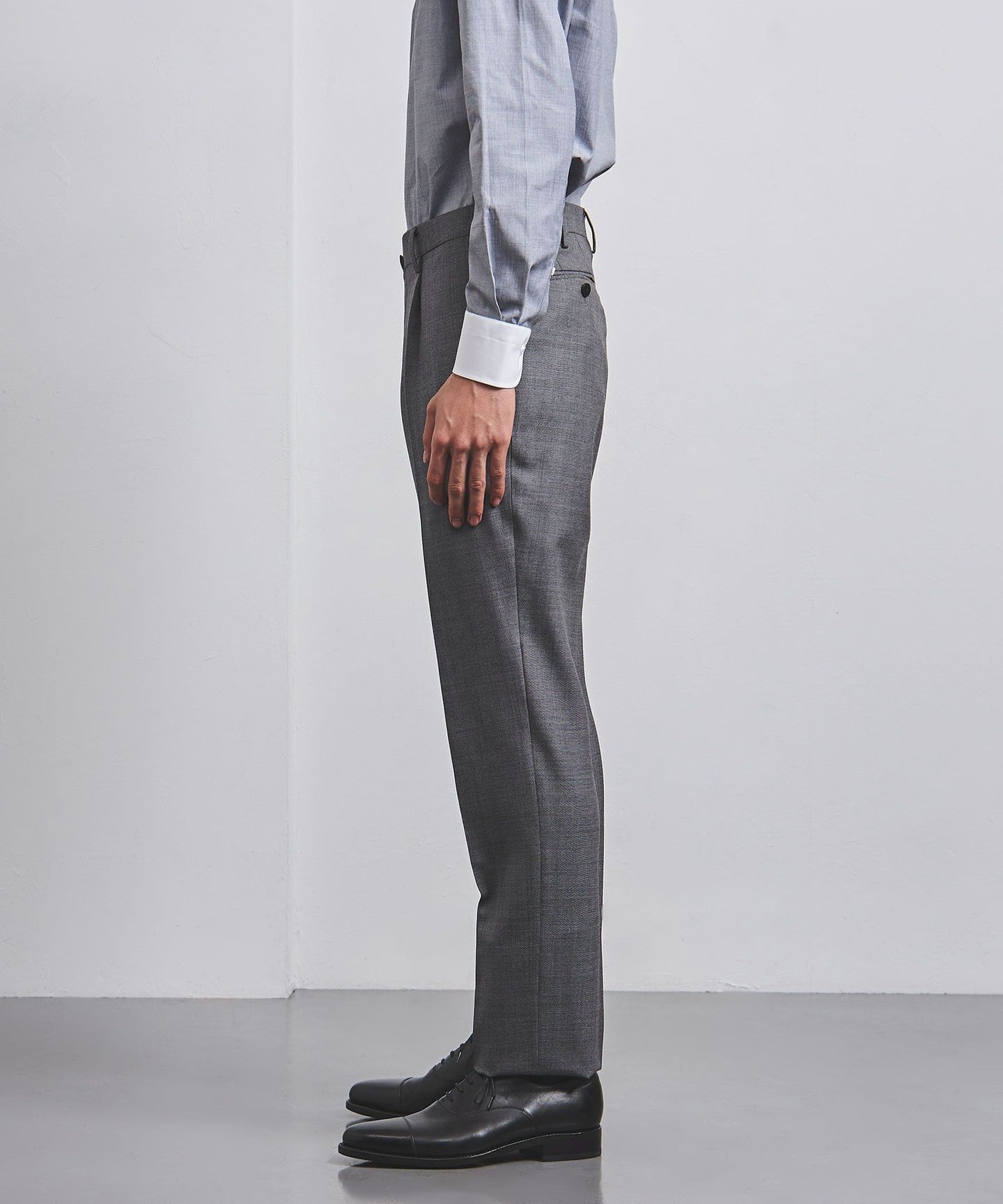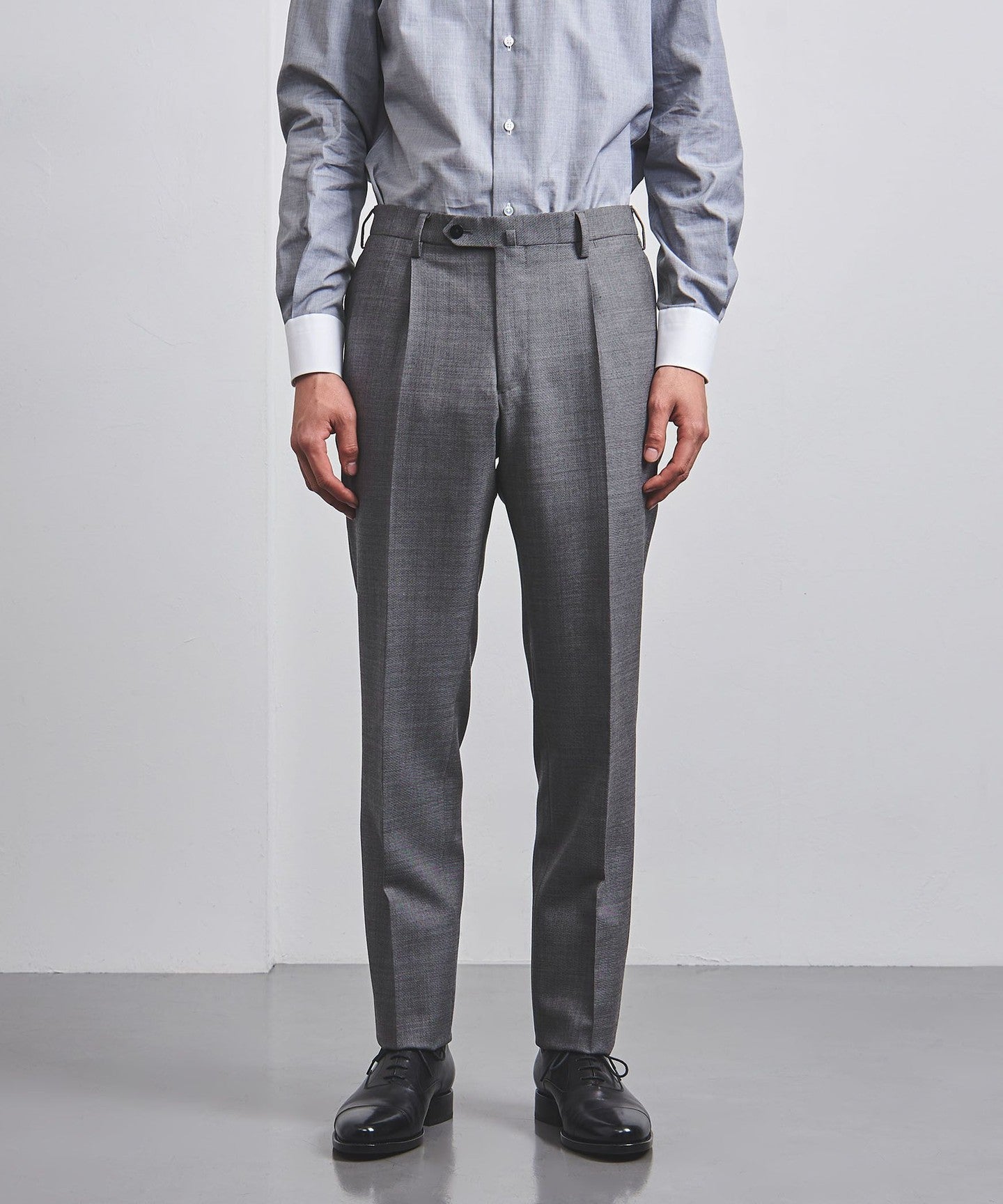 The slacks have deep pleats and ample room around the waist, creating a tapered silhouette that balances well with the tailored jacket.