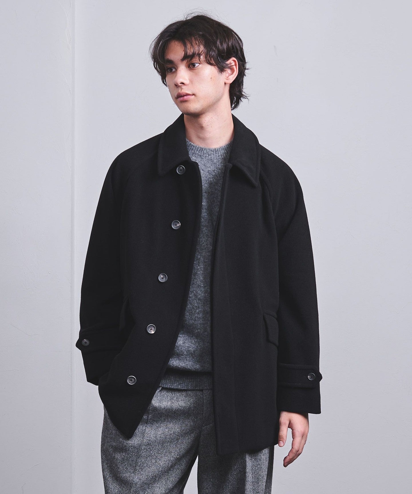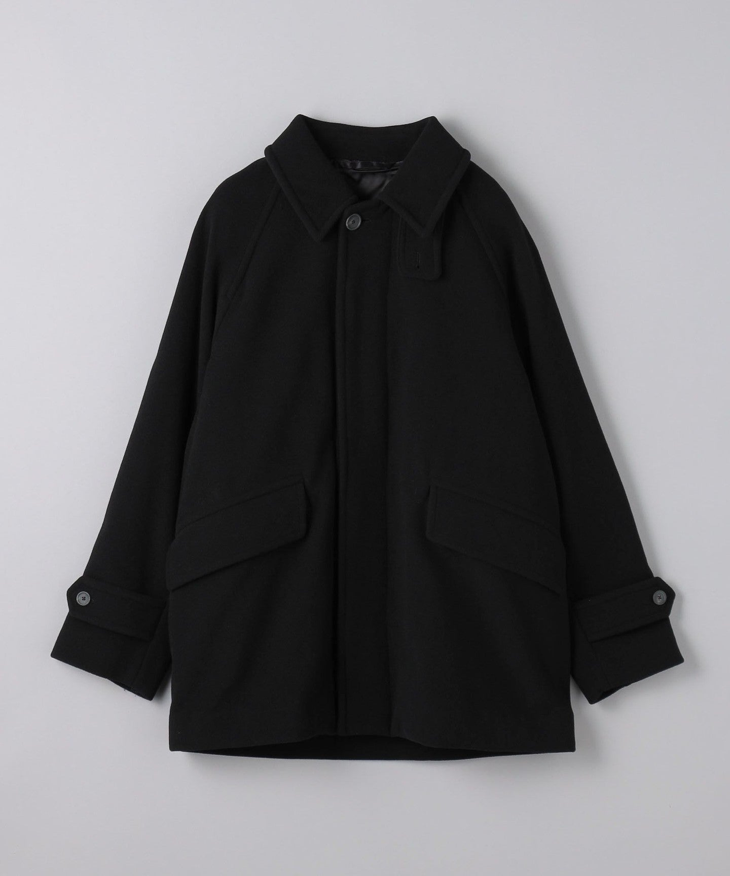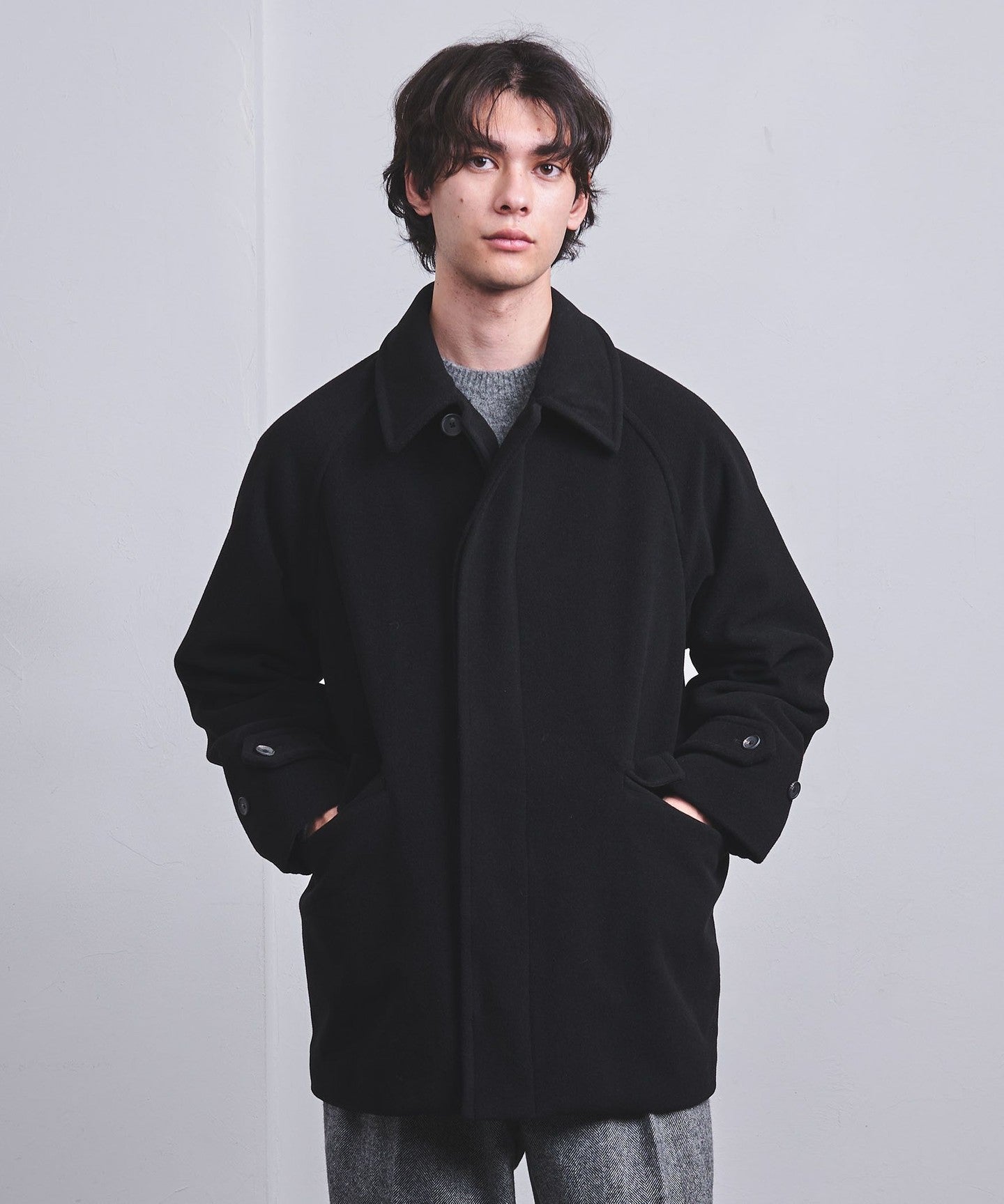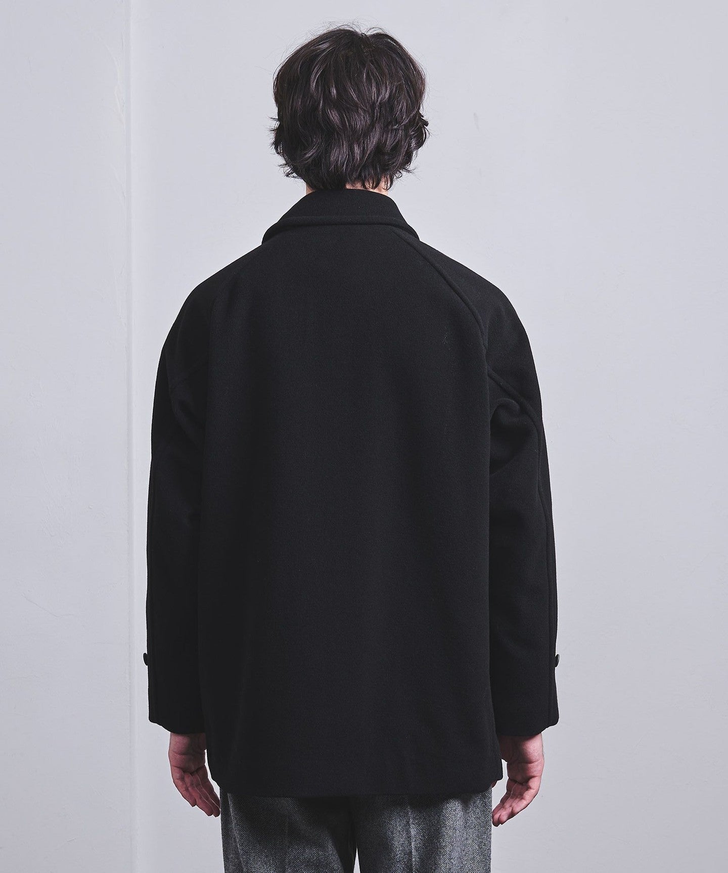 This half coat is based on the long Balmacaan coat (item number: 11251398748) and has a light, hip-length finish.