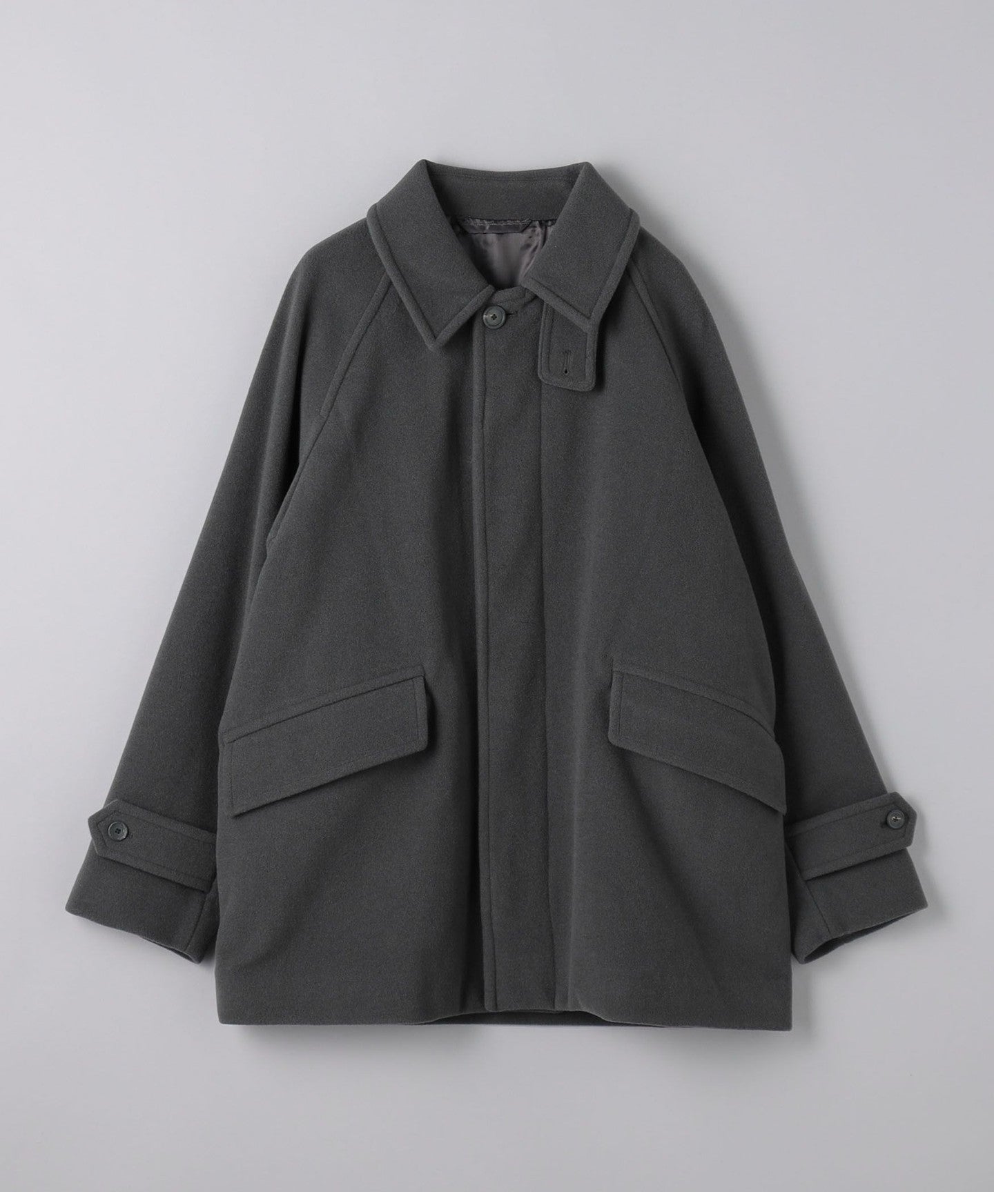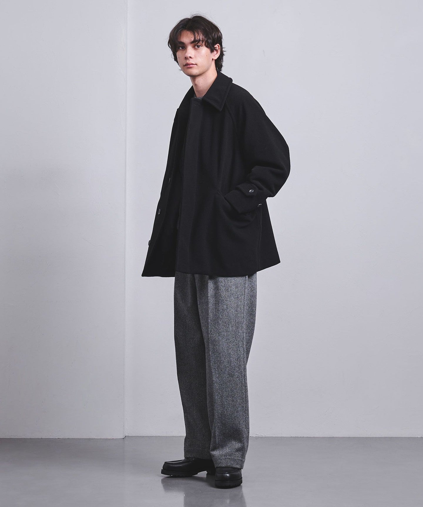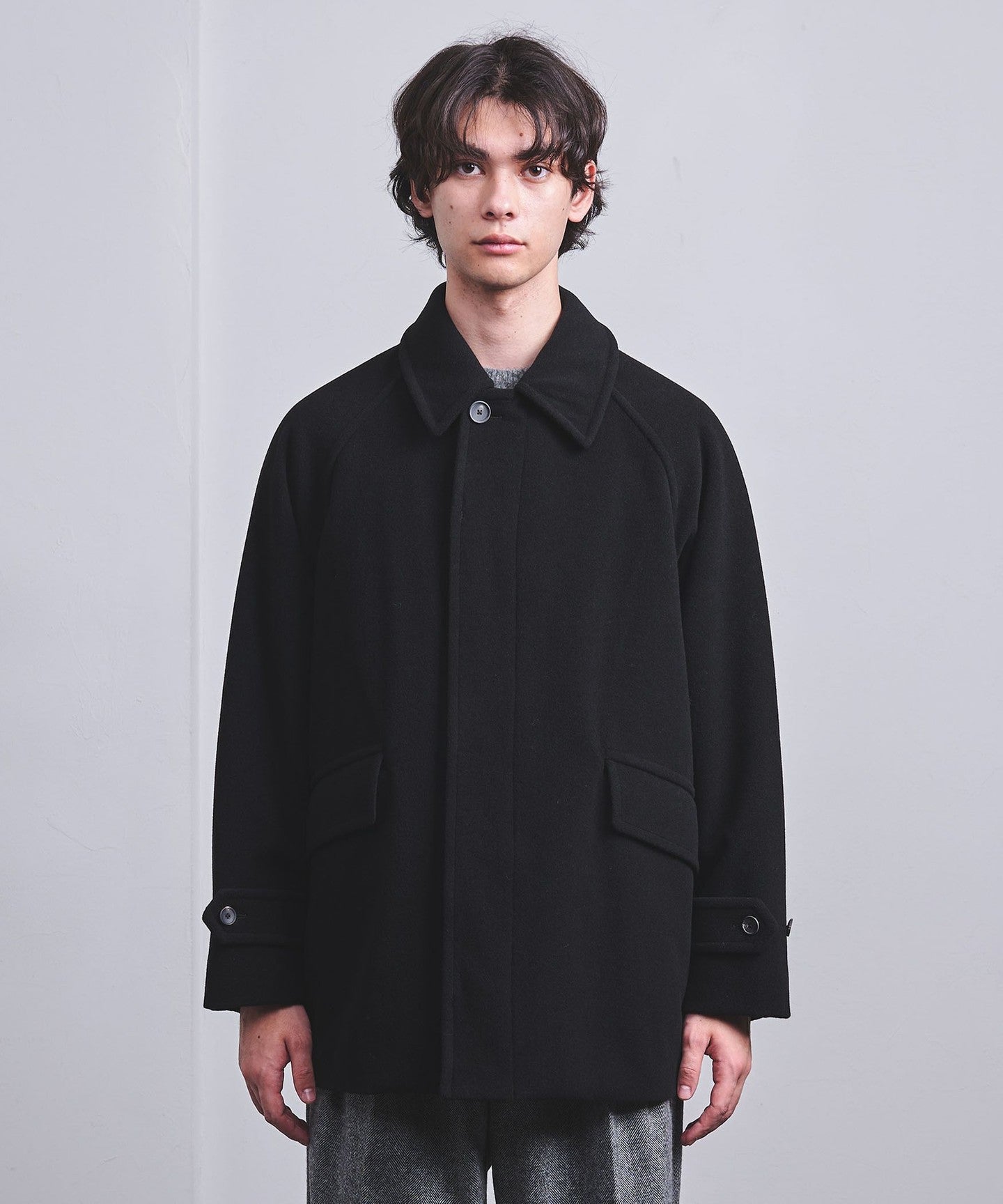 This half coat is based on the long Balmacaan coat (item number: 11251398748) and has a light, hip-length finish.