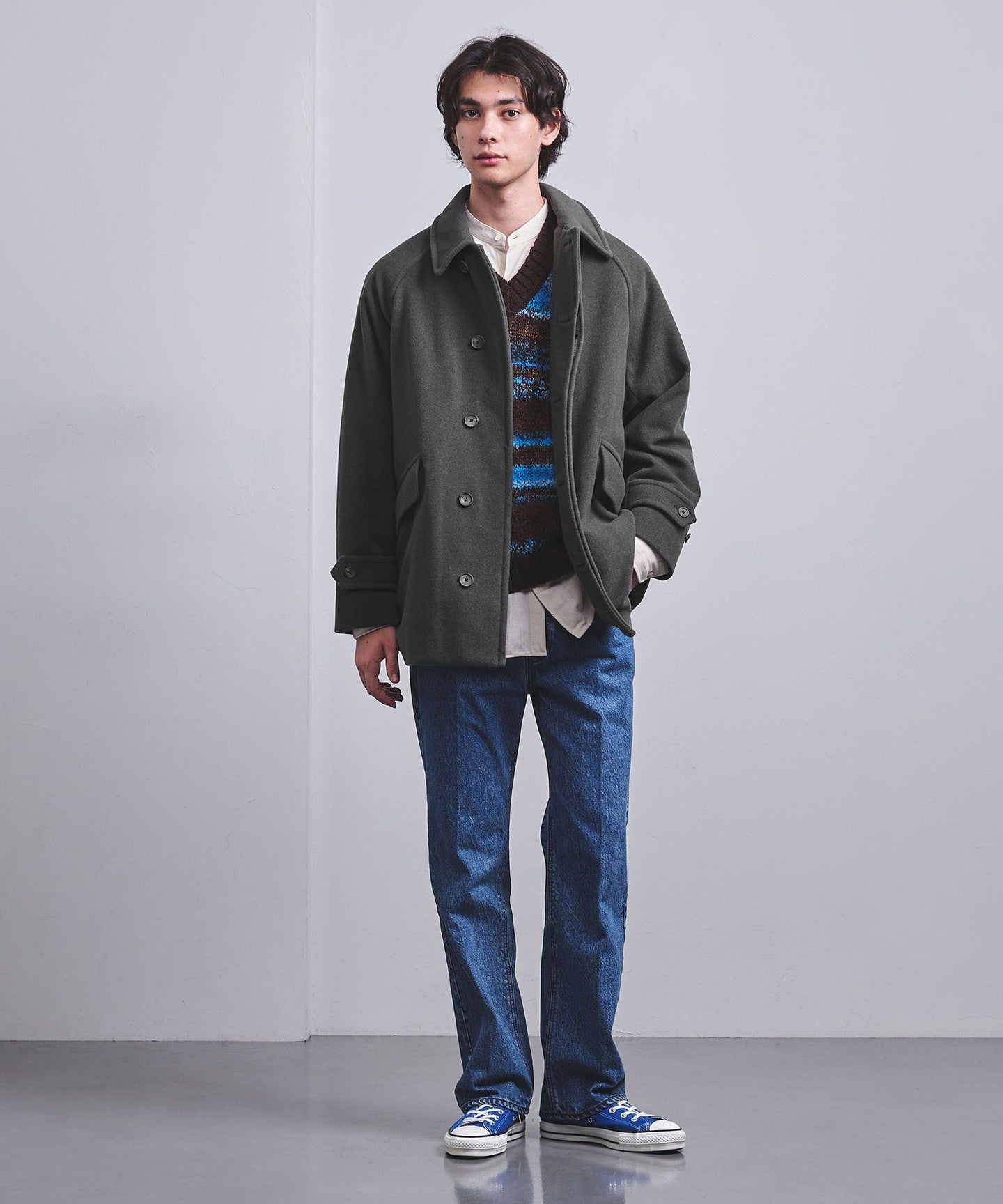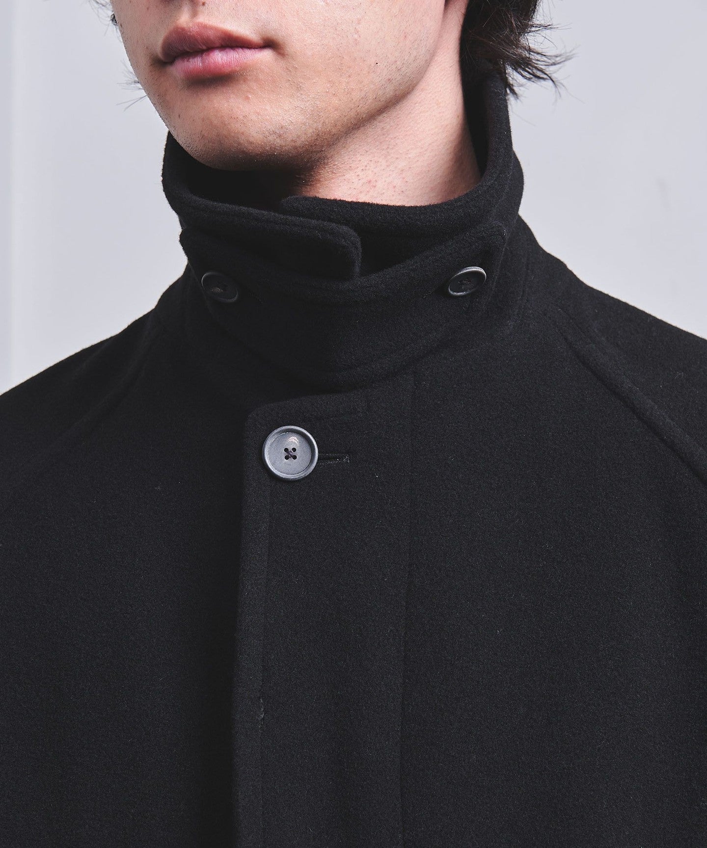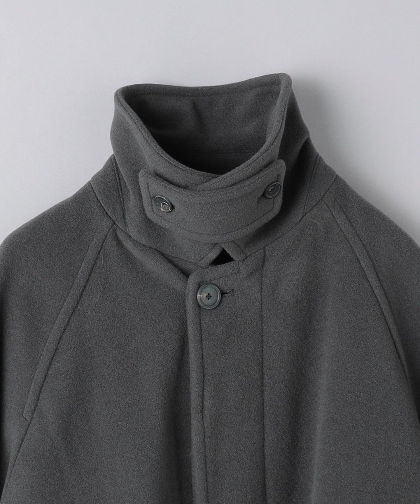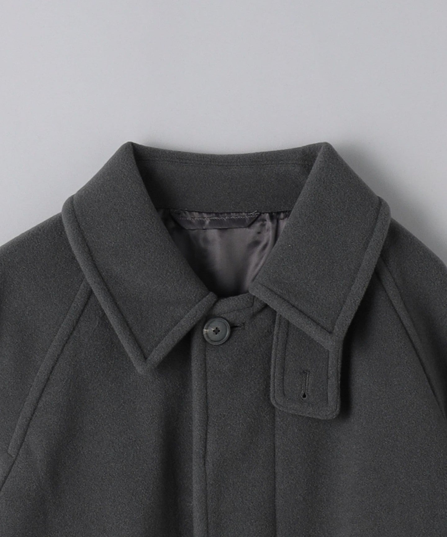 This half coat is based on the long Balmacaan coat (item number: 11251398748) and has a light, hip-length finish.